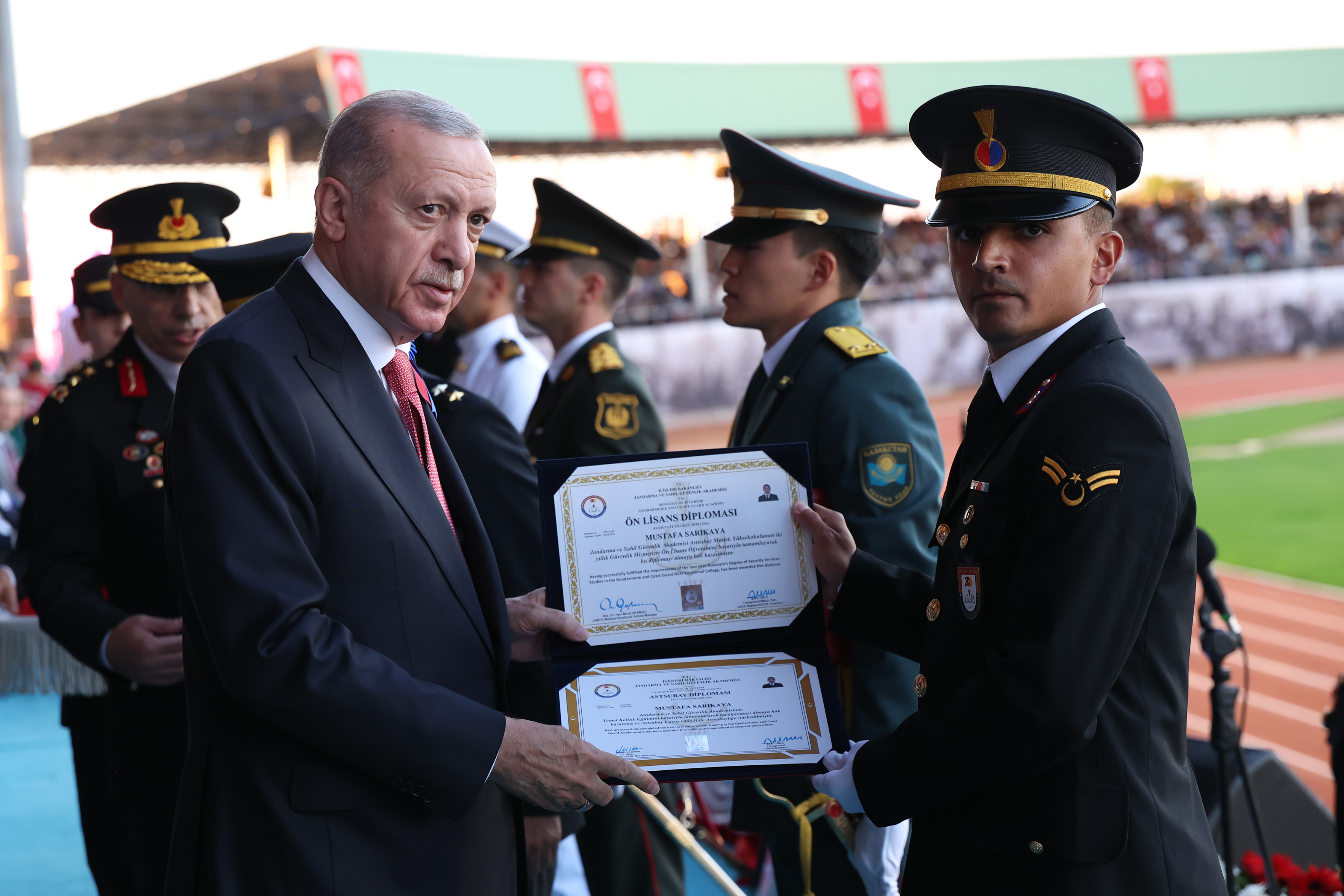 Dönem birincileri ve uluslararası öğrenciler diplomalarını Cumhurbaşkanı Erdoğan'ın elinden aldı. Cumhurbaşkanı Erdoğan, bayrak devir tesliminin ardından ise bayraktarlara diplomalarını verdi.
