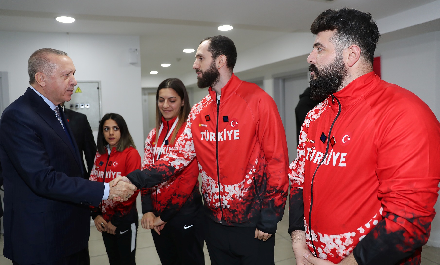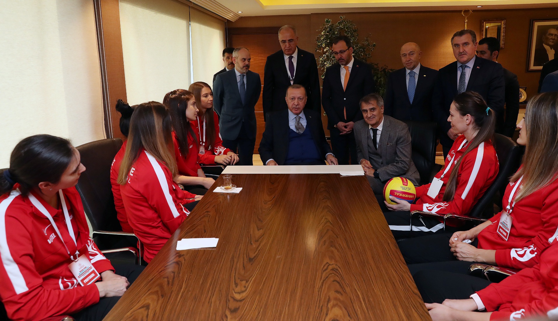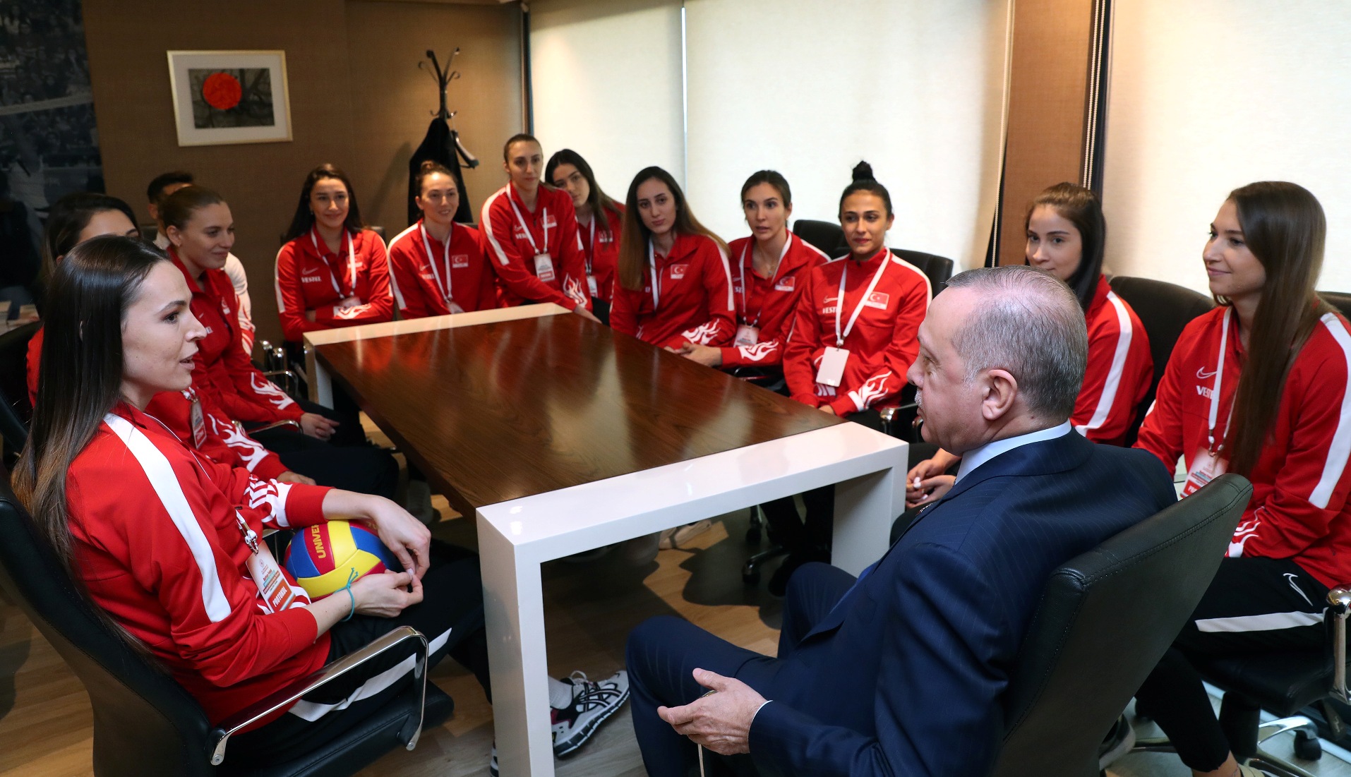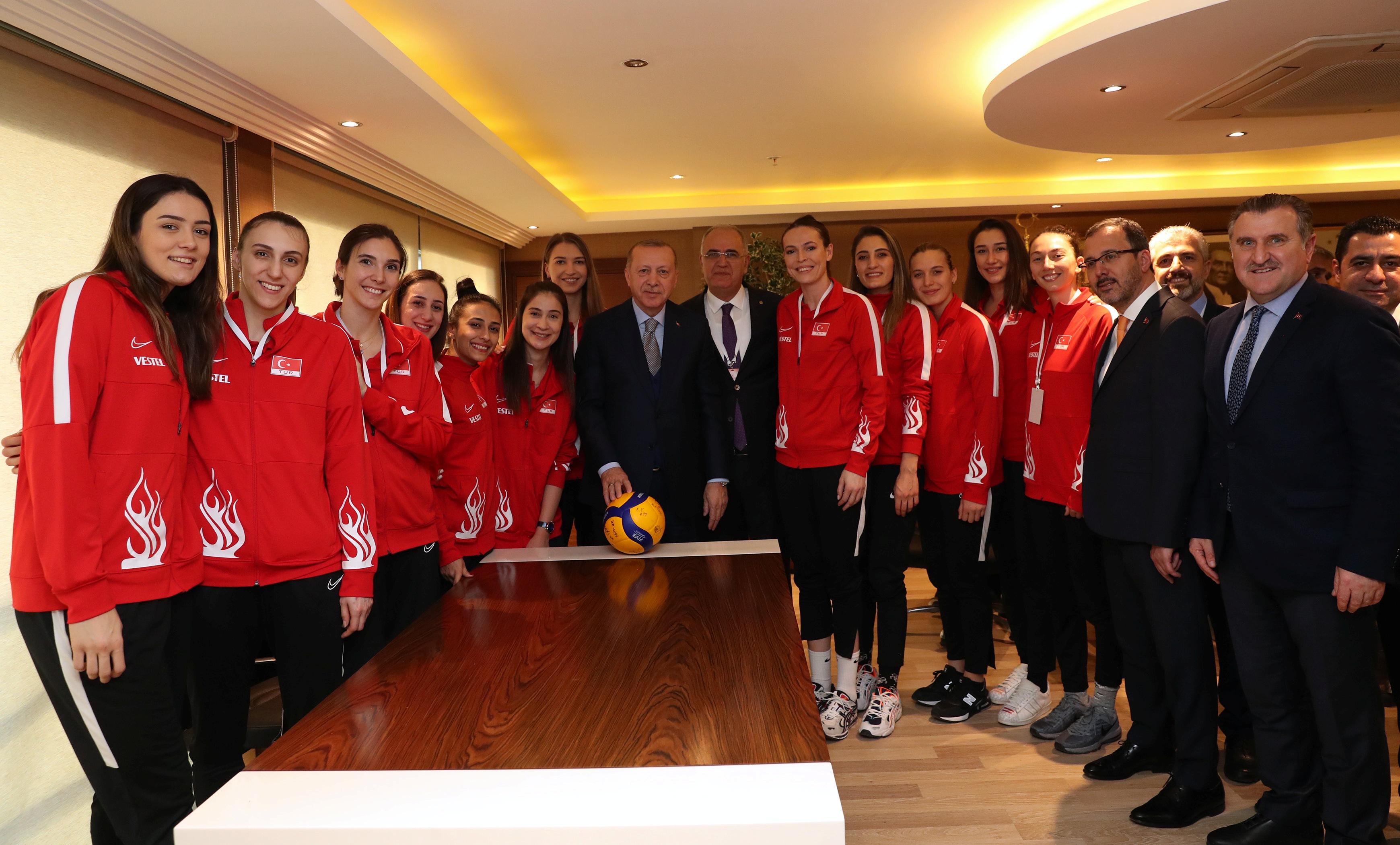 Cumhurbaşkanı Erdoğan, Voleybol Kadın Milli Takımı oyuncuları ile bir araya geldi. Milli oyuncular Erdoğan'a imzalı top hediye ettiler.