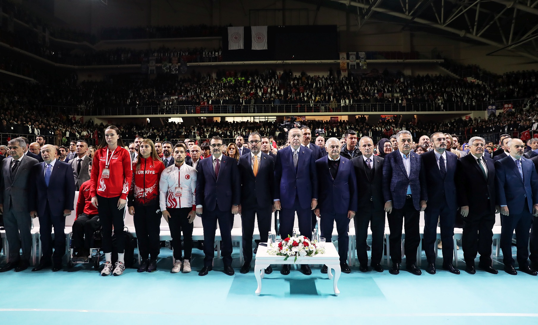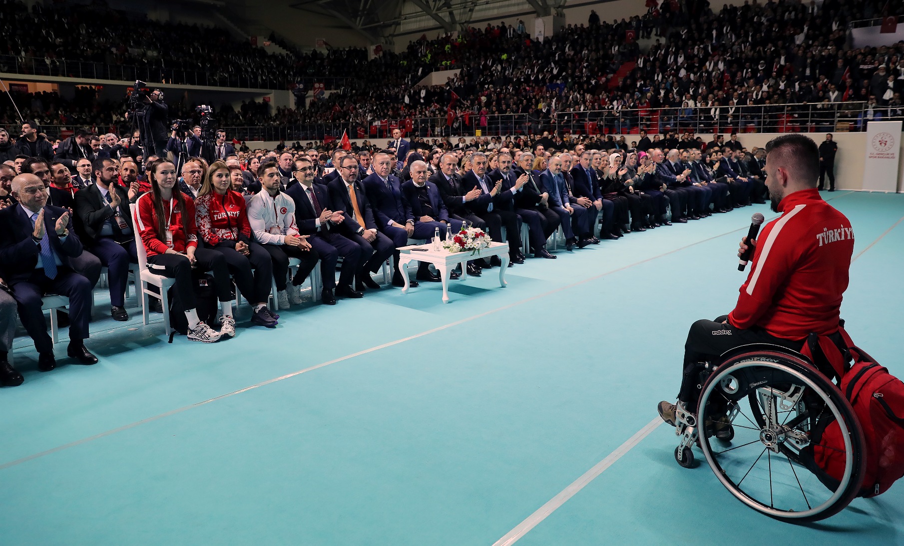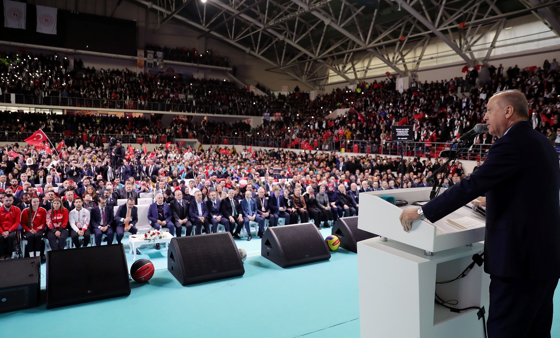 "Şu ana kadar ülke genelinde 2 bin 425 mahalle ve okul sahası inşa ettik. Bunlara ilave olarak, 1018 mahalle tipi sahamızın yapımı da sürüyor. İstanbulumuzun da her ilçesini yüzme havuzları, kortlar, atletizm pistleri, basketbol, futbol ve voleybol sahalarıyla donatmaya devam edeceğiz. Tabii bu vesileyle Voleybol Milli Takımımızı kutluyorum, tebrik ediyorum. Zira Dünya Şampiyonasına katılma vizesini de aldılar. Bu sahalarda ter döken evlatlarımızın arasından geleceğin şampiyonları çıkacak. Diğer yandan Türkiye Olimpiyat Hazırlık Merkezlerimizi geliştiriyoruz. Hala 22 ilimizde faaliyetlerine devam eden Türkiye Olimpiyat Hazırlık Merkezleri'nde 696'sı gündüzlü, 439'u yatılı olmak üzere, toplam 1135 sporcumuz bulunuyor. Buralarda yetişen sporcularımız dünyanın dört bir yanında ülkemizi temsil ediyor. Biz daima gençlere güvendik ve bugün de güveniyoruz. Bunu da lafta bırakmadık. Yaptığımız icraatlarla açıkça gösterdik. Gençlerimizin potansiyelini en üst seviyede kullanabilmesi için her alanda kendilerine destek oluyoruz. Gençlik merkezlerimizi bu amaçla kurduk ve yaygınlaştırıyoruz. Hala 81 ilimizde 327 gençlik merkezimiz faaliyet gösteriyor. Buralarda gençlerimizle birlikte geleceğimiz için haller kuruyor, birlikte düşünüyor, çalışıyor ve birlikte üretiyoruz. Mutlu ve güçlü bireyler olmalarına katkı sağlamak amacıyla sosyal, kültürel, sportif ve gönüllü faaliyetler gerçekleştiriyoruz."