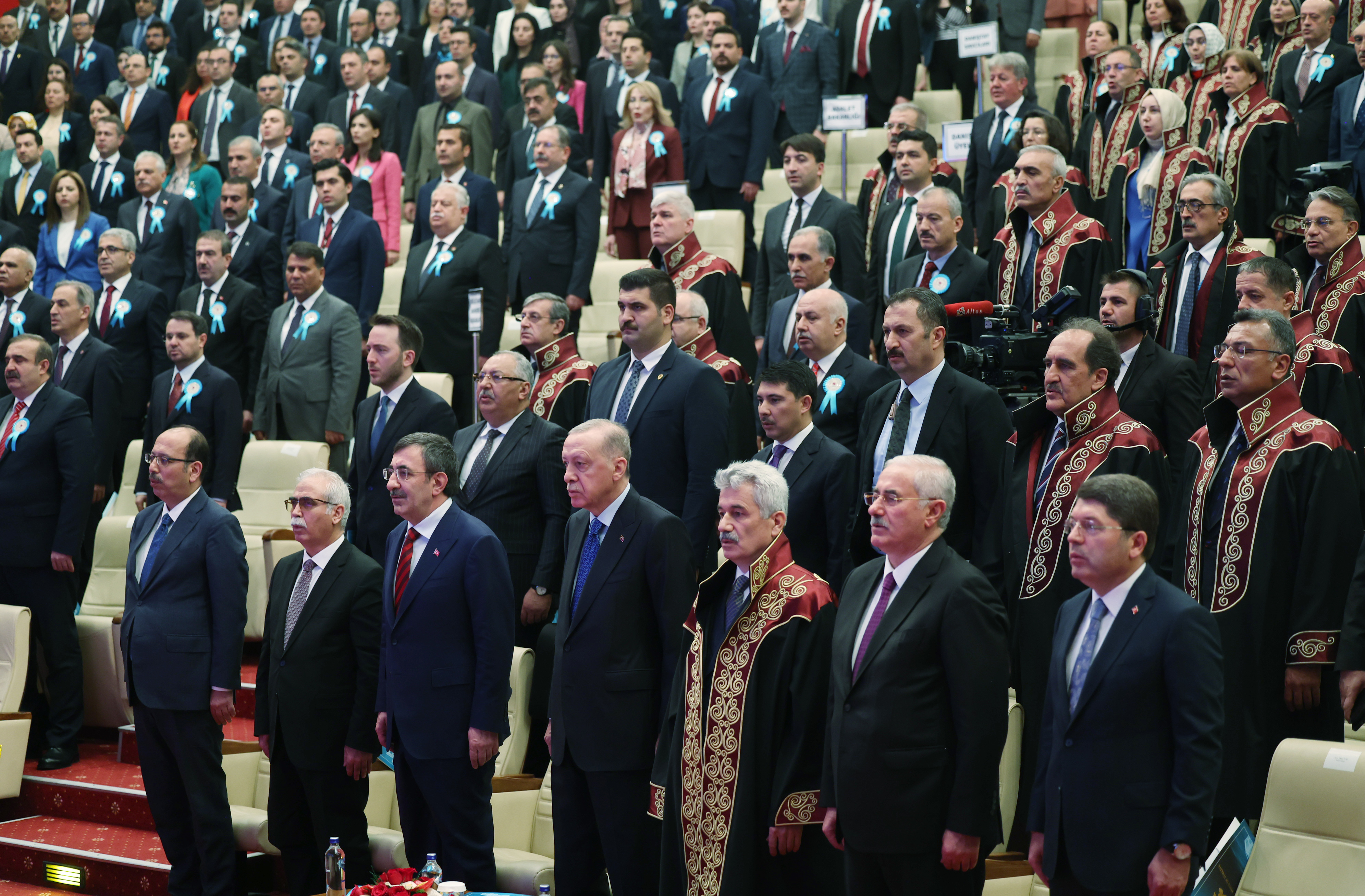 Cumhurbaşkanı Erdoğan, "Makamlarımızdan ve unvanlarımızdan öte 85 milyonun bir ferdi olarak hepimiz şu gerçeğe yürekten inanıyoruz, nasıl geç gelen adalet, adalet değilse topluma güven veren ve erişilebilir adalet sistemi de bekamızın güvencesidir. Tüm mahkeme salonlarımızda bulunan 'Adalet mülkün temelidir' yazısı, hem bu hakikati bize hatırlatır hem de medeniyetimizin, adaletin tesisine verdiği ehemmiyeti ortaya koyar." dedi.