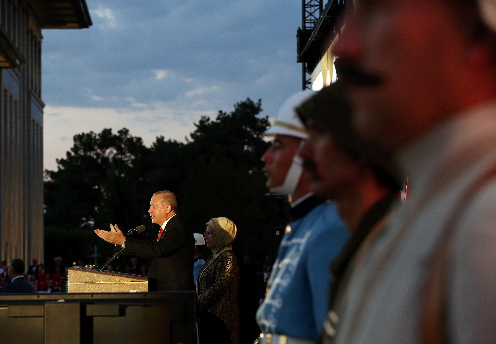 Bu zaferi millete armağan eden İstiklal Harbi'nin Başkomutanı Gazi Mustafa Kemal Atatürk'ü, Büyük Millet Meclisi'nin kıymetli üyelerini, kahraman Türk ordusunun tüm askerlerini rahmetle yad eden Erdoğan, "Her zafer gibi 30 Ağustos'un arkasında da gözlerini kırpmadan hayatlarını feda eden kahramanlarımızın cesaretleri vardır." diye konuştu.