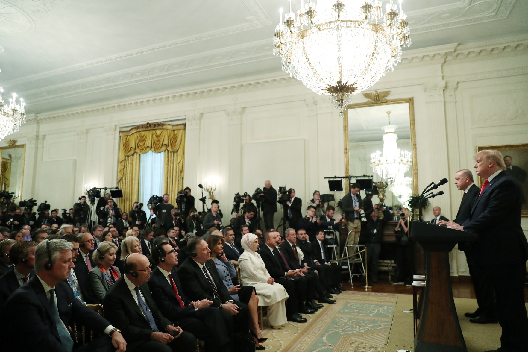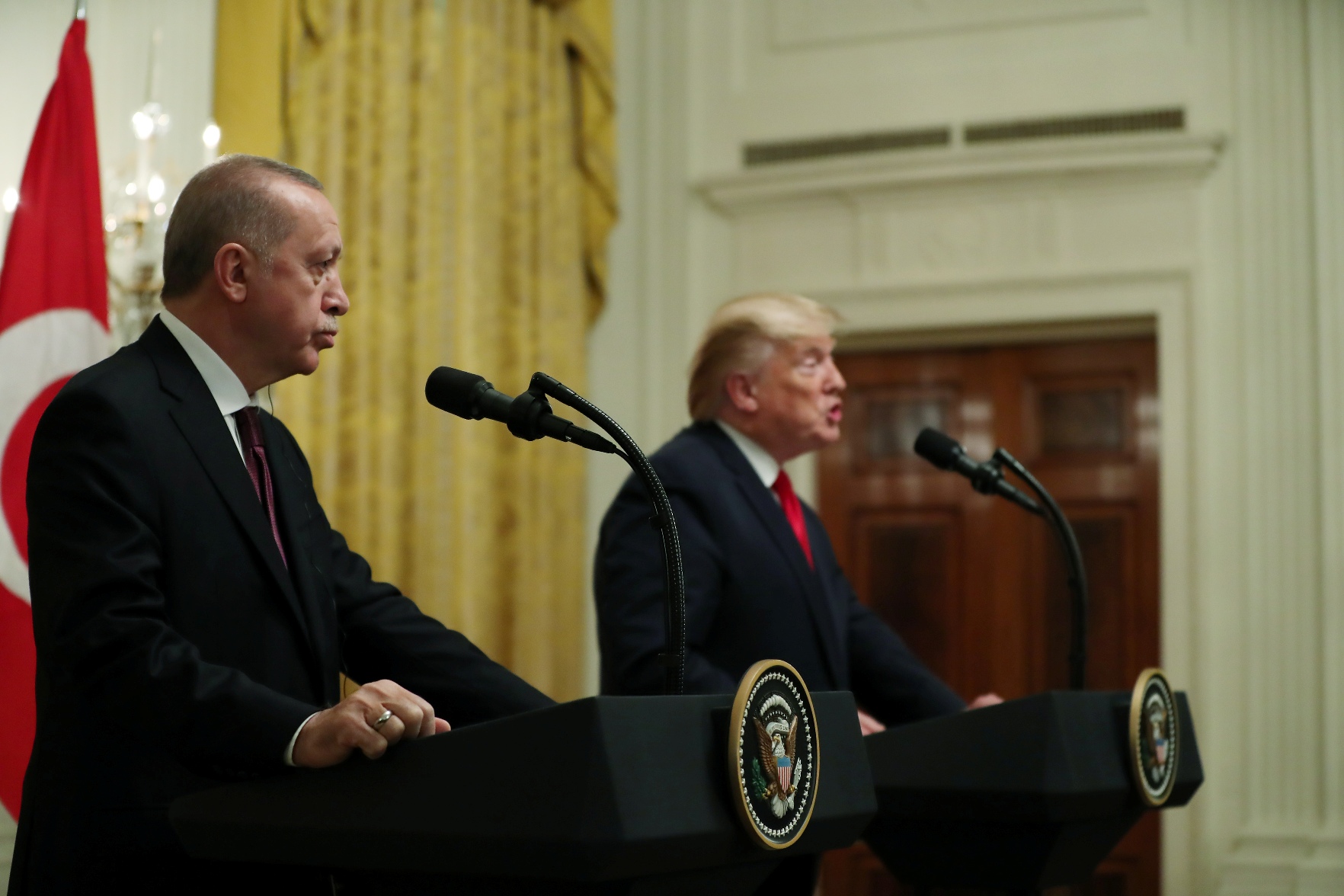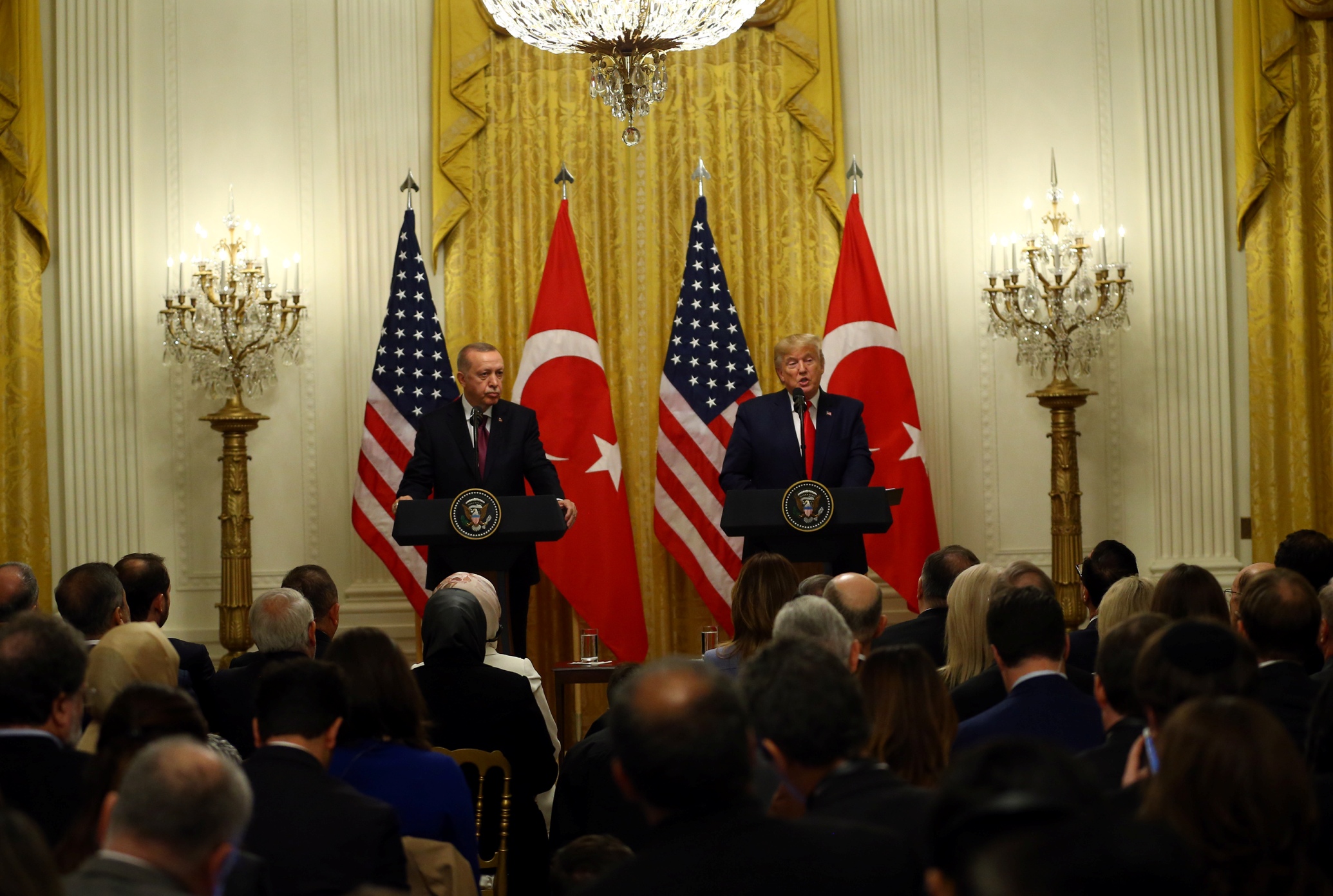 Cumhurbaşkanı Recep Tayyip Erdoğan ve ABD Başkanı Donald Trump, baş başa görüşme ve heyetler arası çalışma yemeğinin ardından Beyaz Saray'da ortak basın toplantısı düzenledi.