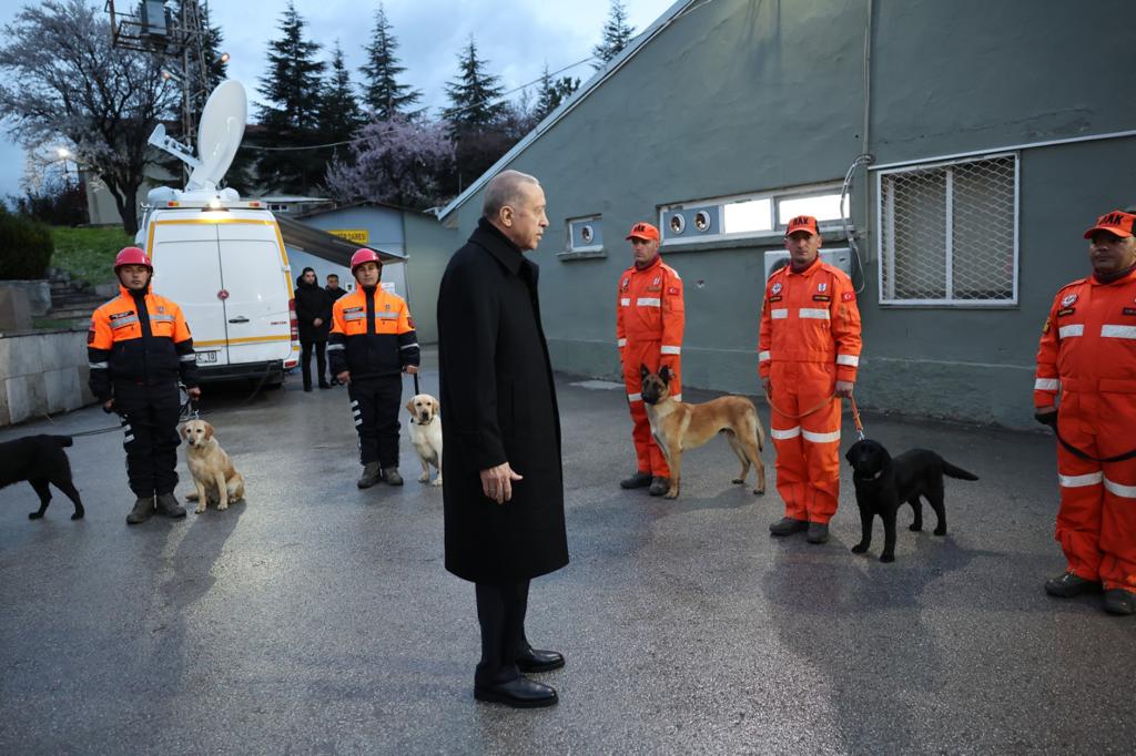 Tören mangasını selamlayan Cumhurbaşkanı Erdoğan, daha sonra "asrın felaketi" olarak nitelendirilen depremlerde birçok insanı enkaz altından kurtaran Türk Silahlı Kuvvetleri İnsani Yardım Tugay Komutanlığının Doğal Afet Arama Kurtarma Taburu ile taburdaki arama kurtarma köpeklerine ilişkin bilgi aldı.