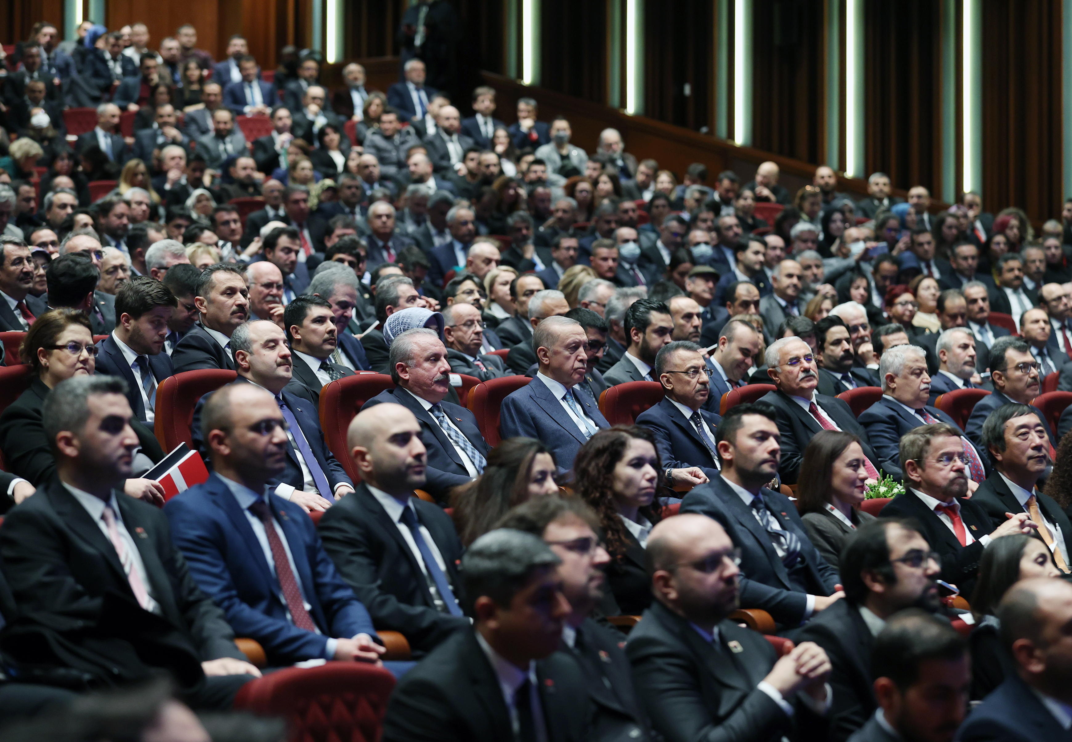"DENEYAP Teknoloji Atölyeleri’nde daha 8 yaşlarında, 9 yaşlarında yapay zekâ, nesnelerin interneti ve robotik projeleri geliştiren evlatlarımızı gördükçe bu inancımız güçleniyor. Yeni nesil yazılım okullarında kendilerini yetiştiren binlerce gencimiz, sessiz sedasız yazılım dünyasındaki yerlerini alıyor. Teknoparklarda 2 kişi, 3 kişi bir araya gelerek milyar dolarlık değerlemeye ulaşan şirketler kuran parlak beyinlerle gurur duyuyoruz. Evlatlarımız daha ortaokul, lise sıralarında iken TEKNOFEST yarışmalarında dikey roket, insansız hava araçları, kutup araştırmaları, biyoteknoloji gibi projelerde çalışıyor. Ülkemizin ilk yerli otomobili Togg'u, niye geçmişte değil de bugün üretebildik sorusunun cevabı, işte burada gizlidir. Dünya, bizim insansız hava araçlarındaki başarımızı manşetlere taşıyor, şaşkınlıkla takip ediyor. Adına şarkılar yazılan TB2 ile başladığımız yolculukta, önce Akıncı'ya, sonra insansız muharip savaş uçağımız Kızılelma'ya geldik. Şu anda oranın üretiminde 3 bin gencimiz çalışıyor ve bunların yaş ortalaması 25 ile 35 arasında. Demek ki bu millet, Türk oğlu Türk yapar mı? Yapar ve şu anda bunu yapıyor."