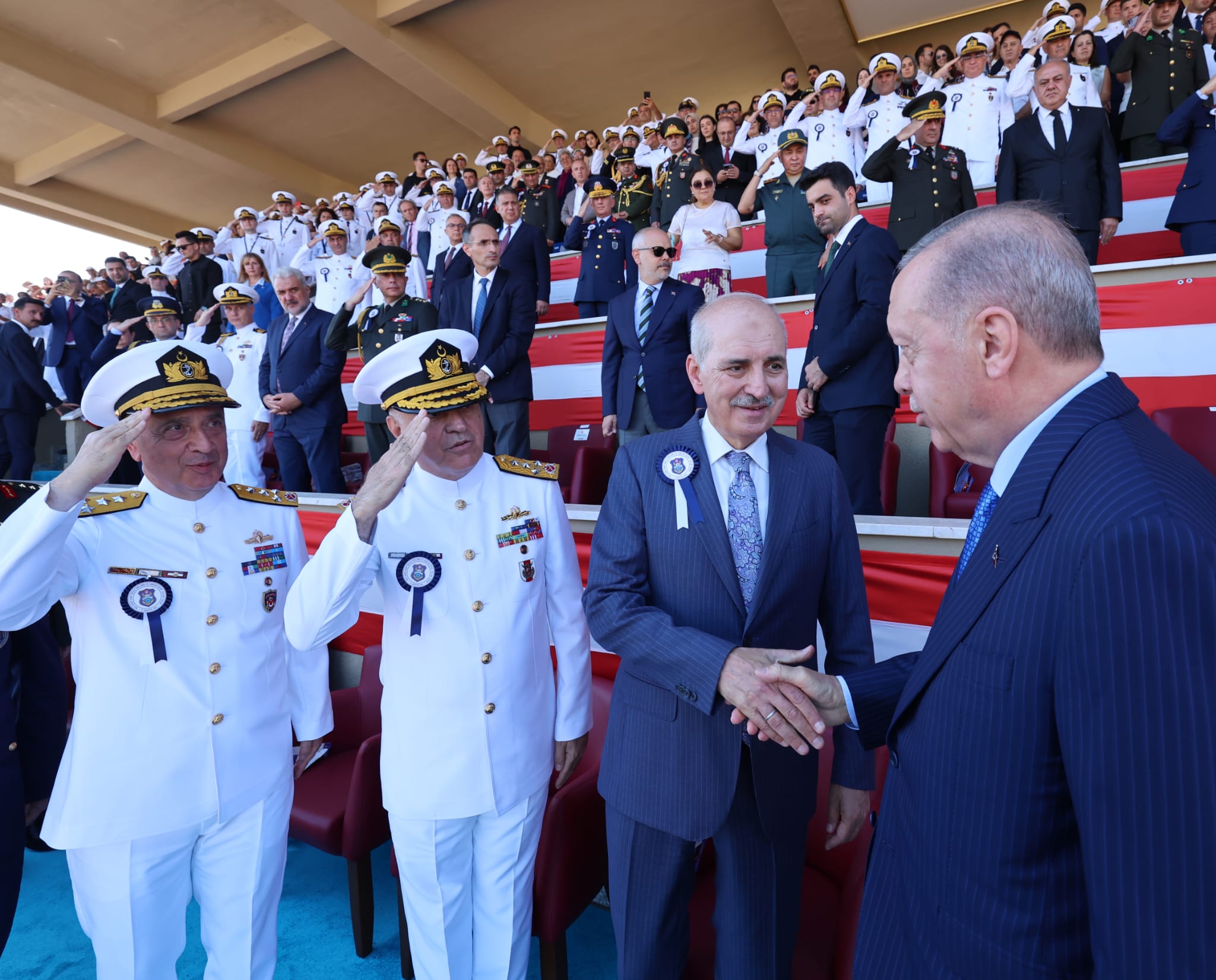 "251 yıldır iftihar vesilemiz olan köklü bir kurumun mensubu olmaktan ne kadar kıvanç duysanız azdır. Bahriyeli olmanın, böyle güzide bir eğitim kurumunda eğitim görmenin aynı zamanda ciddi sorumlulukları da beraberinde getirdiğini unutmayınız. Askerlik mesleğinin çeşitli kademelerinde hizmet ederken bu çatı altında kazandığınız bilgi, disiplin ve değerler sizin her zaman rehberiniz olacaktır. Vatanımıza, milletimize, devletimize karşı görevlerinizi en güzel şekilde yerine getireceksiniz. Gerekirse bu uğurda tıpkı kahraman ecdadımız gibi şairin ifadesiyle anadan, yardan, serden geçecek, korkusuzca şehadete yürüyeceksiniz. Türkiye'yi yüceltmek, mavi vatandaki hak ve hukukumuzu korumak için hiçbir fedakârlıktan kaçınmayacaksınız. Üzerinizdeki o ak üniformayı hiçbir leke bulaştırmadan şanla, şerefle ömür boyu taşıyacaksınız. Ben bu kararlılığı, bu yiğitliği ve inanmışlığı şu an karşımdaki tabloda görüyorum. Ne diyor İstiklal Marşımızda? 'Kim bu cennet vatanın uğruna olmaz ki feda. Şüheda fışkıracak toprağı sıksan şüheda. Canı, cananı, bütün varımı alsın da Hüda. Etmesin tek vatanımdan beni dünyada cüda.' Sizlerin mücadelesiyle, sizlerin fedakârlıklarıyla hiçbir güç aziz milletimizi vatanından kopartamayacak."