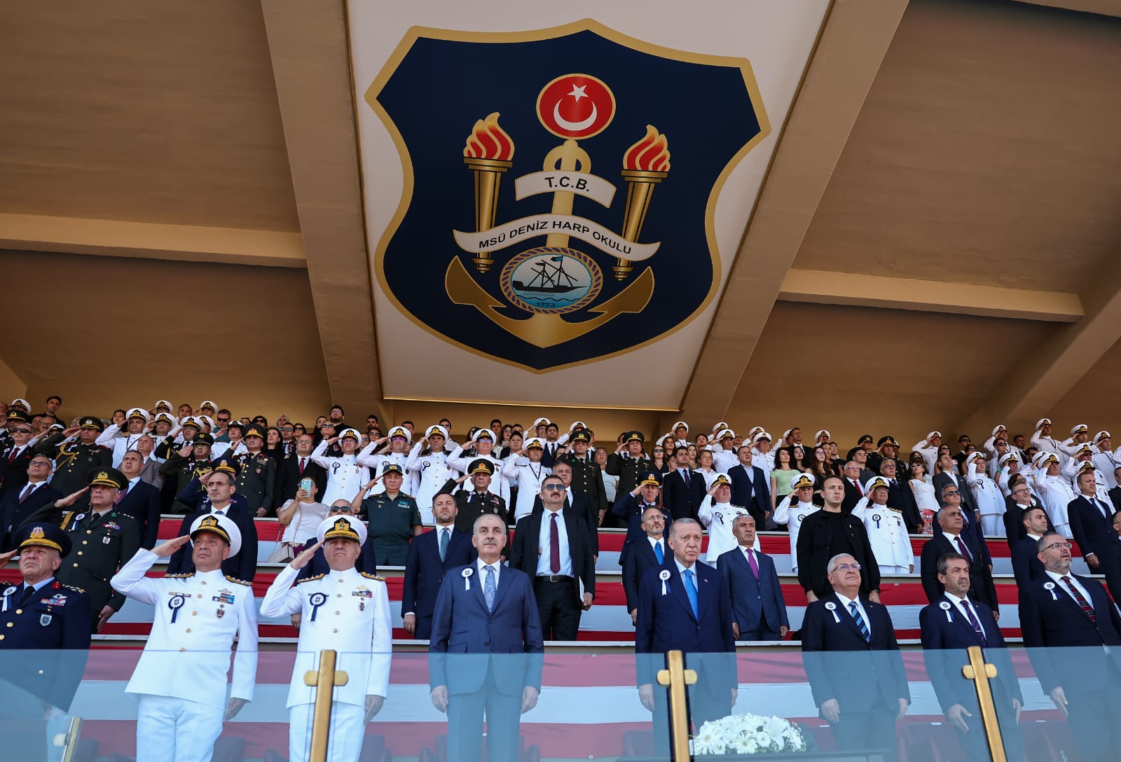 Cumhurbaşkanı Erdoğan, bugün bahriyelilerin mezuniyet sevincine iştirak ettiklerini vurgulayarak, "Bugün 410'u Türk ve 17'si misafir olmak üzere toplam 427 aslan parçasını Deniz Harp Okulumuzdan mezun ediyoruz. Her birinizi ayrı ayrı tebrik ediyor, alınlarınızdan öpüyor, yeni görev yerlerinizde Rabb'imden üstün başarılar niyaz ediyorum. Öncelikle fedakârlıkları, özverili çabaları ve destekleriyle bu mutlu günü yaşamanıza vesile olan ailelerinizi kutluyorum. Sizlerin güzide birer harbiyeli olarak yetişmenizi sağlayan hocalarınıza ve komutanlarınıza ayrıca teşekkür ediyor, kendilerine şahsım, milletim adına takdirlerimi iletiyorum. Misafir teğmenlerimize de ülkelerinde muvaffakiyetler temenni ediyorum. Türkiye'nin fahri elçisi olarak gördüğümüz bu kardeşlerimizle kurduğumuz gönül köprülerini inşallah daha nice yıllar boyunca devam ettireceğiz. Onların da sizlerle, milletimizle ve ülkemizle tesis ettikleri ilişkileri her daim muhafaza edecekleri inancındayım." diye konuştu.