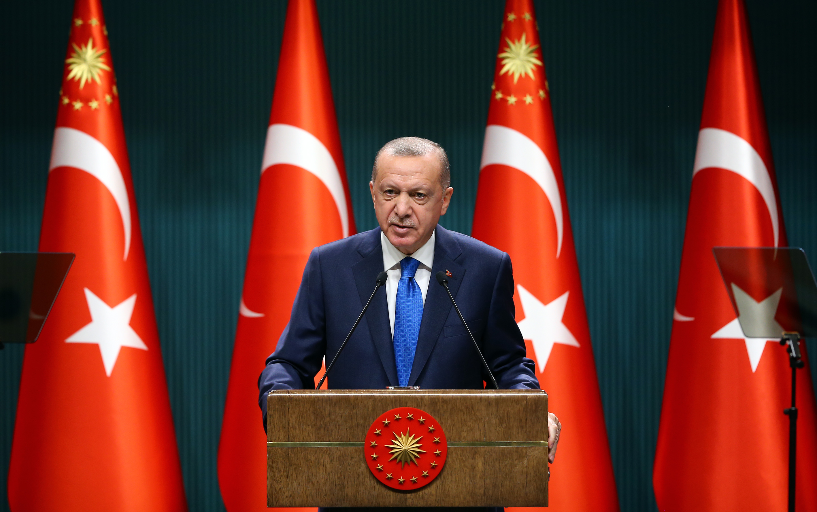 "Son günlerde Doğu Akdeniz ve Ege'de tarihten ibret almadan Türkiye'nin hakkını ve hukukunu hiçe sayarak emrivaki yapmaya çalışanlar da eninde sonunda bu gerçeği kabullenecektir. Kendi vatandaşlarının güvenliğini ve refahını tehlikeye atma pahasına Türkiye'nin karşısına dikilenler için o kadar açık söylüyorum, anı geldiğinde korkarım ki bedelini ağır ödemezler. Her fırsatta anlaşmazlıkları görüşmeyle, konuşmayla, müzakereyle, uzlaşmayla çözmeden yana olduğumuzu söylüyoruz. Bizimle masaya oturmak yerine kırık dökük askeri güçleriyle efelenenlere tarihi bir kenara bırakıyorum, en azından son dört yıldaki diplomasi çalışmalarımızı ve askeri harekatlarımızı iyi incelemelerini tavsiye ediyorum. Avrupa Birliği başta olmak üzere bu konuda haklı haksız, adaletli adaletsiz, ahlaklı ahlaksız ayrımı yapmadan kör bir taassupla ülkemize karşı tavır alanları da hakkaniyete ve sağ duyuya davet ediyorum."