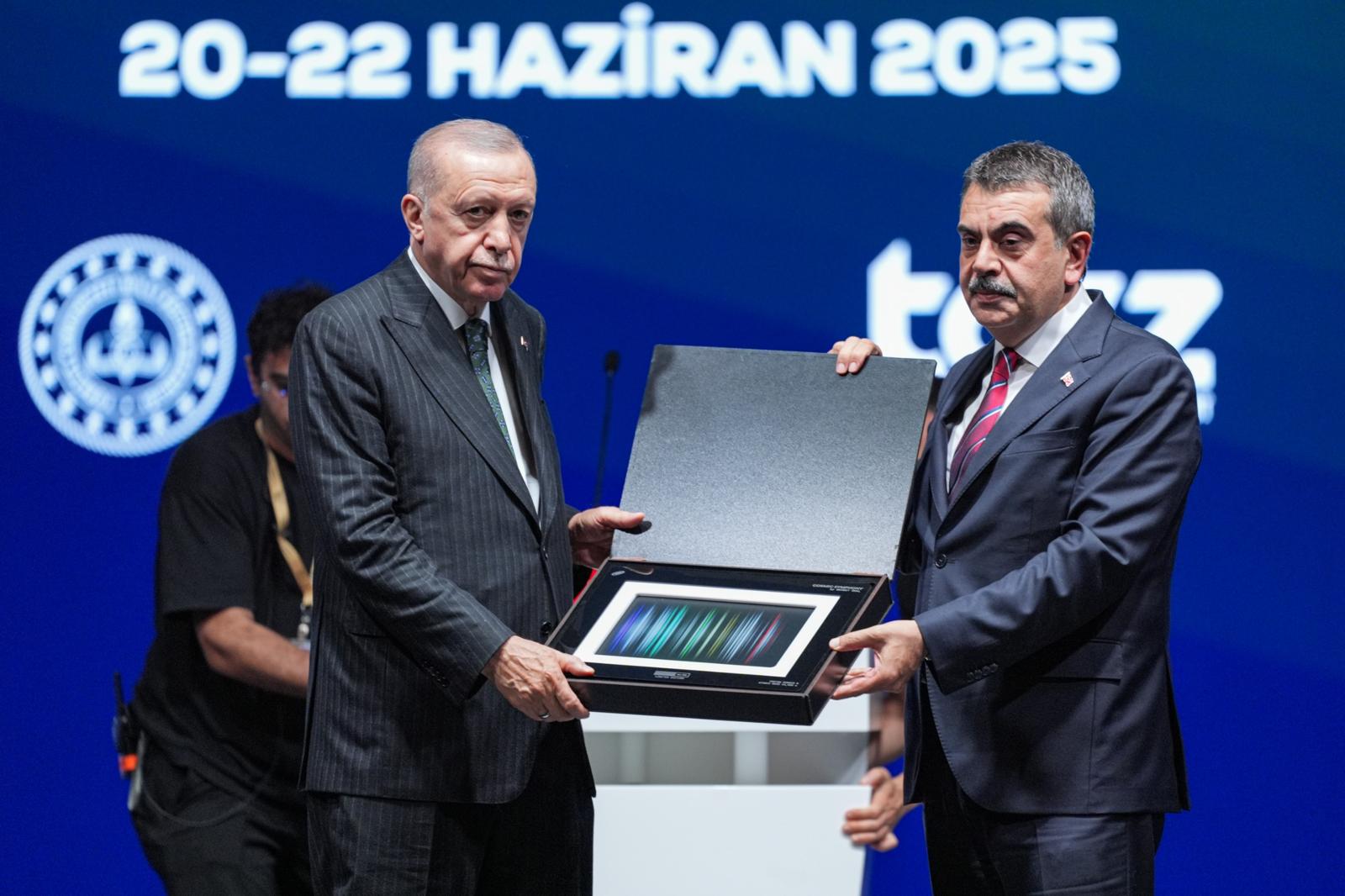 Millî Eğitim Bakanı Yusuf Tekin, konuşmaların ardından Cumhurbaşkanı Erdoğan'a yapay zekâyla tasarlanmış müzik aleti hediye etti.