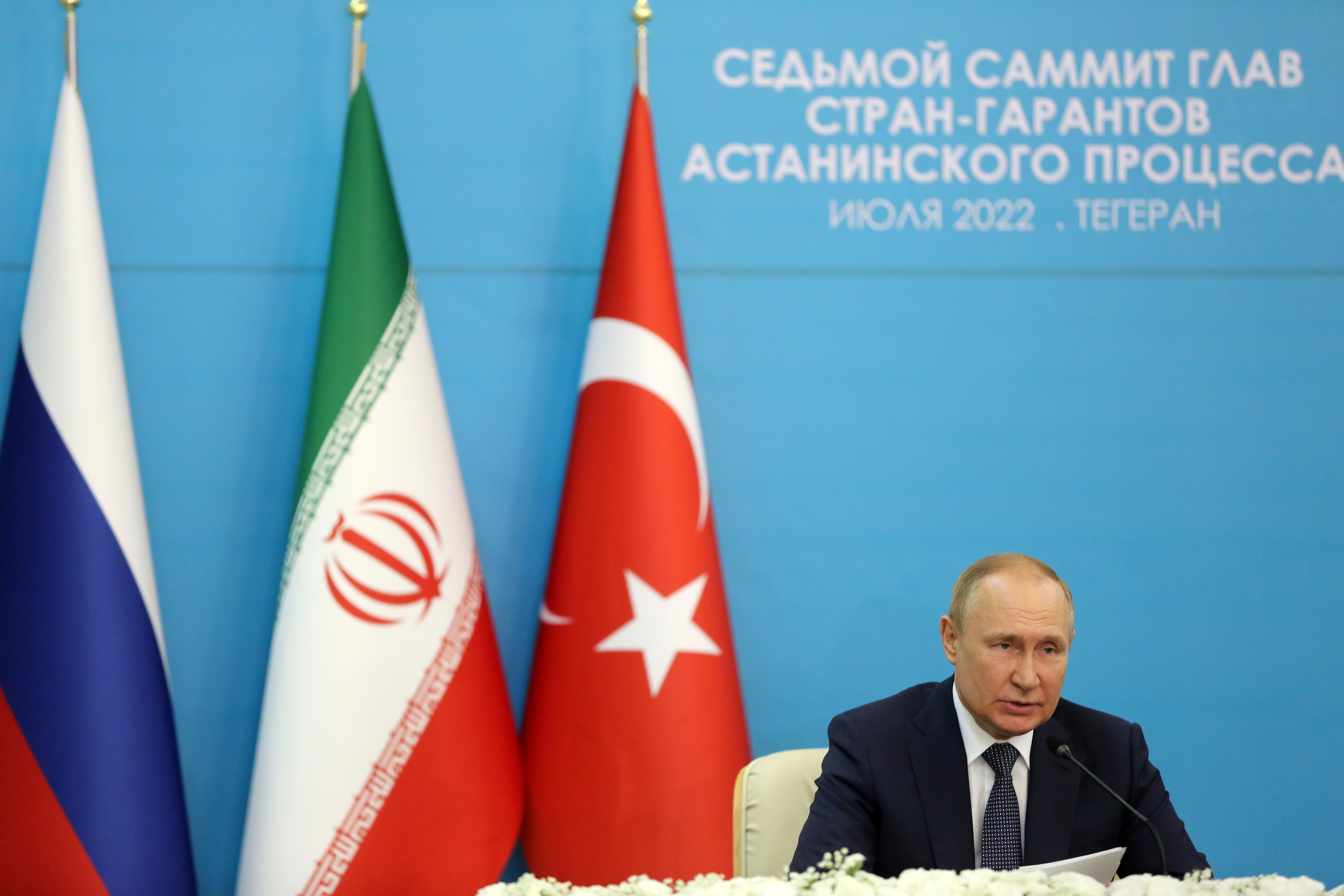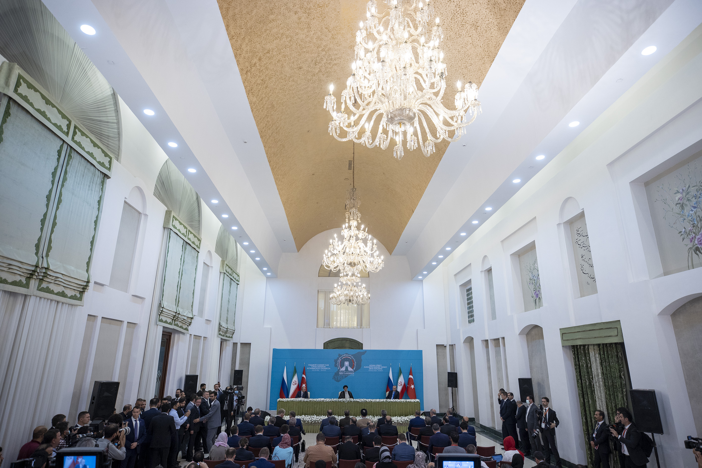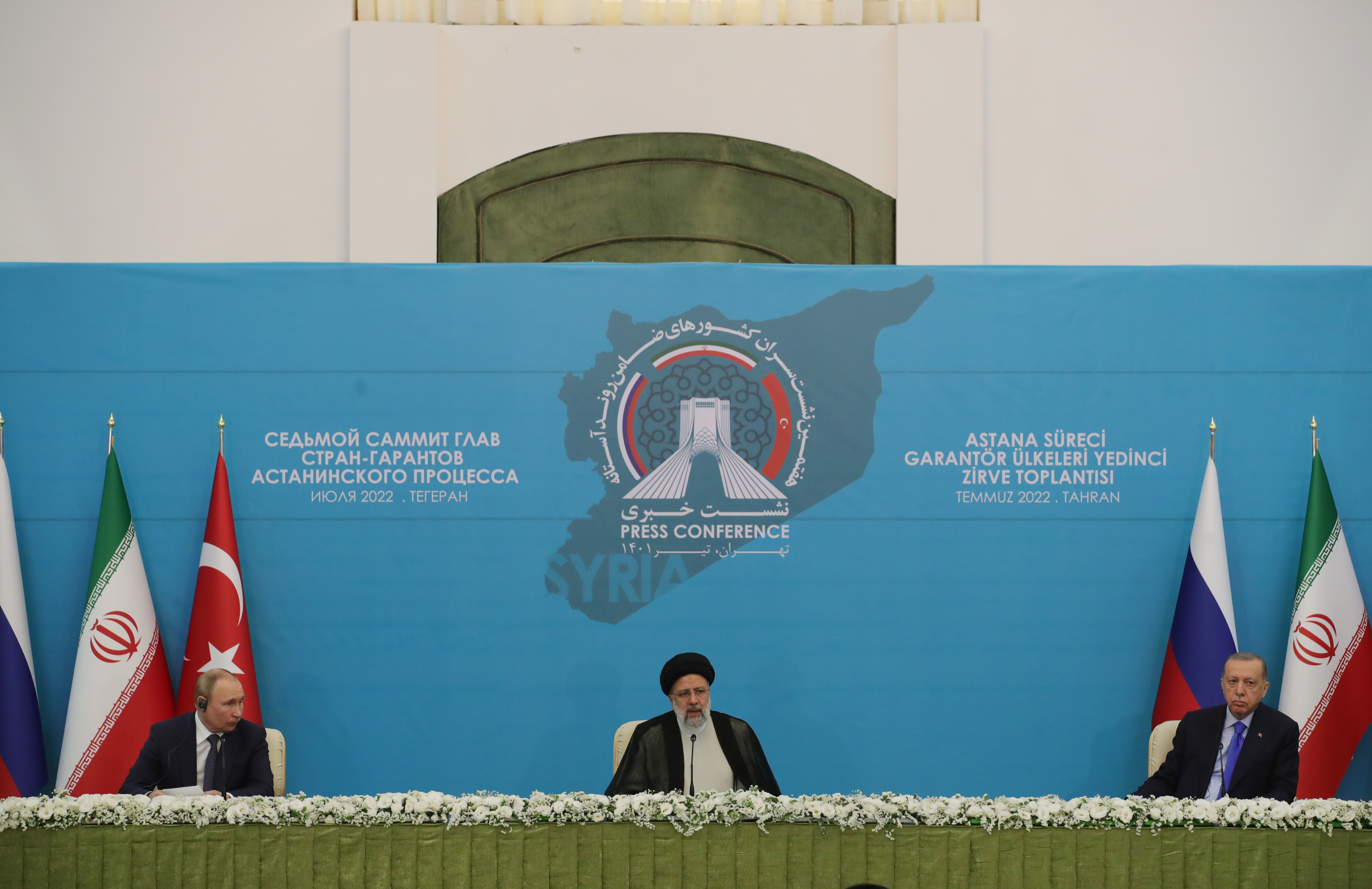 Tahran Uluslararası Konferans Salonu'nda Türkiye, İran ve Rusya arasında düzenlenen "Astana Formatında Yedinci Üçlü Zirve Toplantısı"nın ardından, Cumhurbaşkanı Erdoğan, İran Cumhurbaşkanı İbrahim Reisi ve Rusya Devlet Başkanı Vladimir Putin ortak basın toplantısı düzenledi.