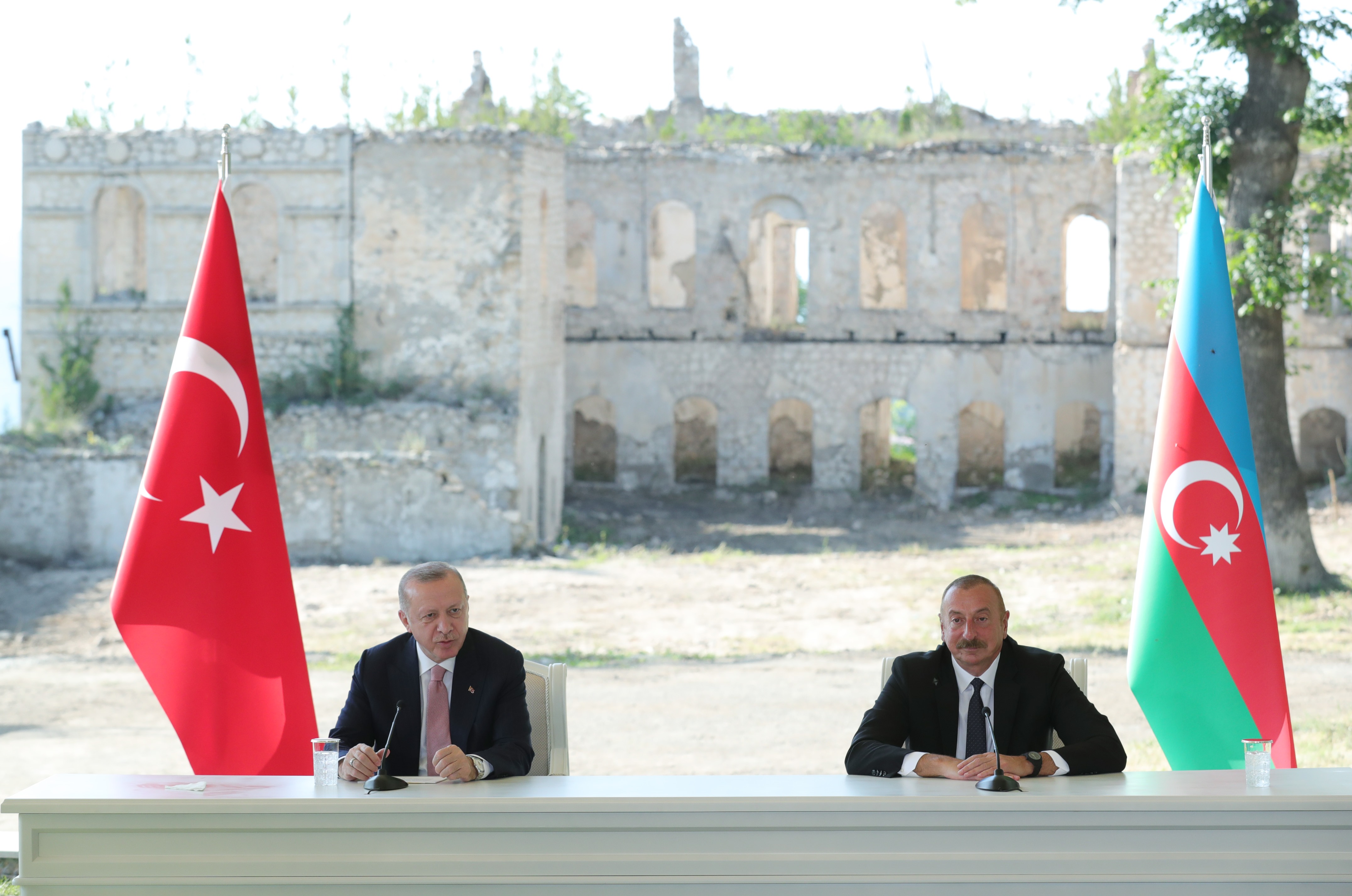 Resmi ziyaret için Azerbaycan'da bulunan Cumhurbaşkanı Erdoğan ile Azerbaycan Cumhurbaşkanı İlham Aliyev, baş başa görüşmelerin ardından Şuşa Valiliği bahçesinde ortak basın toplantısı düzenledi.