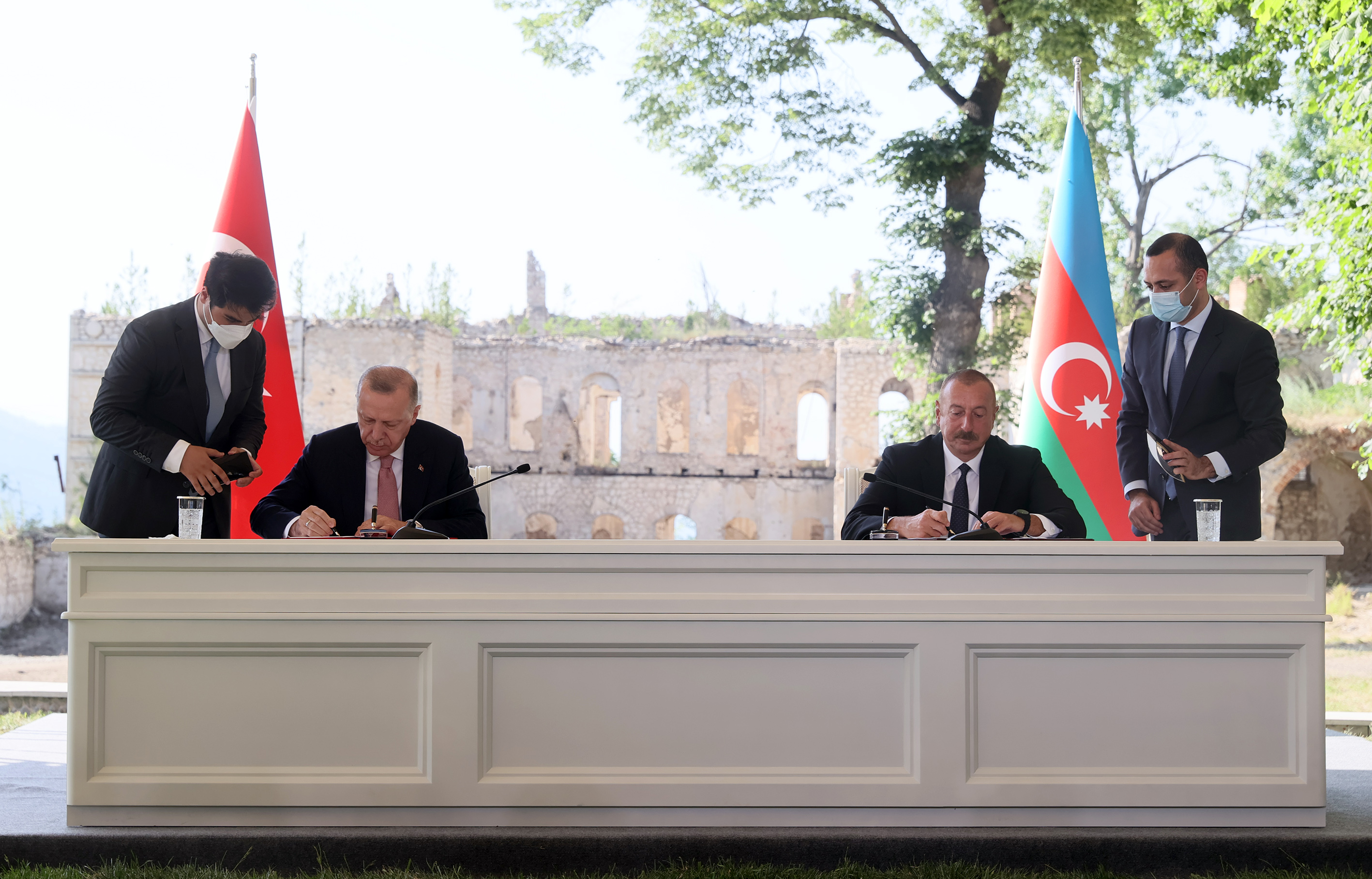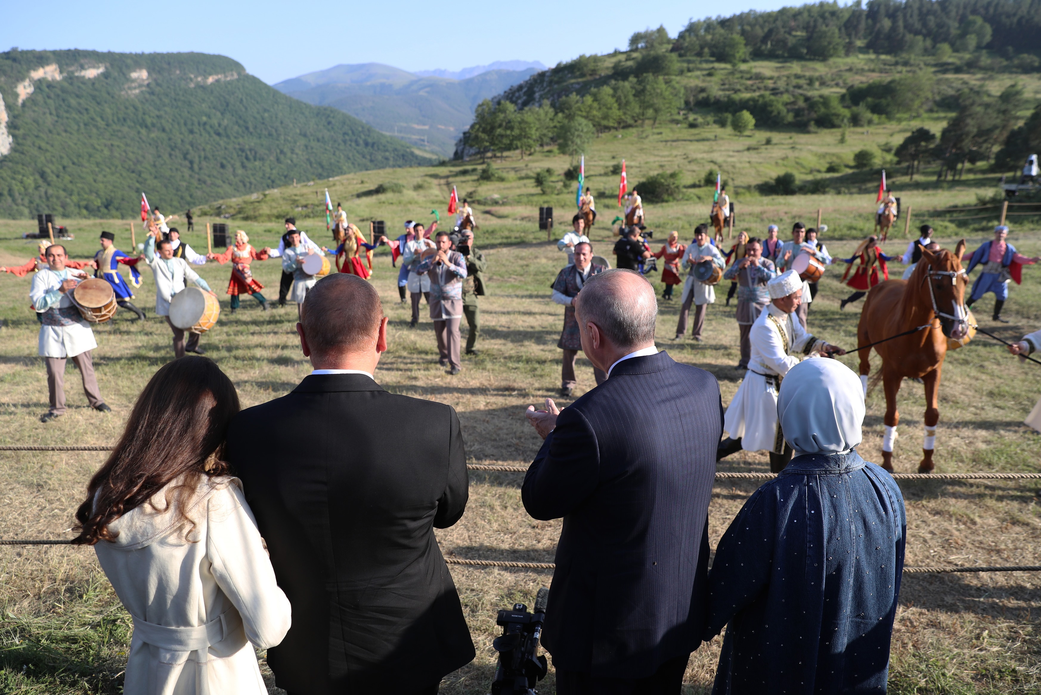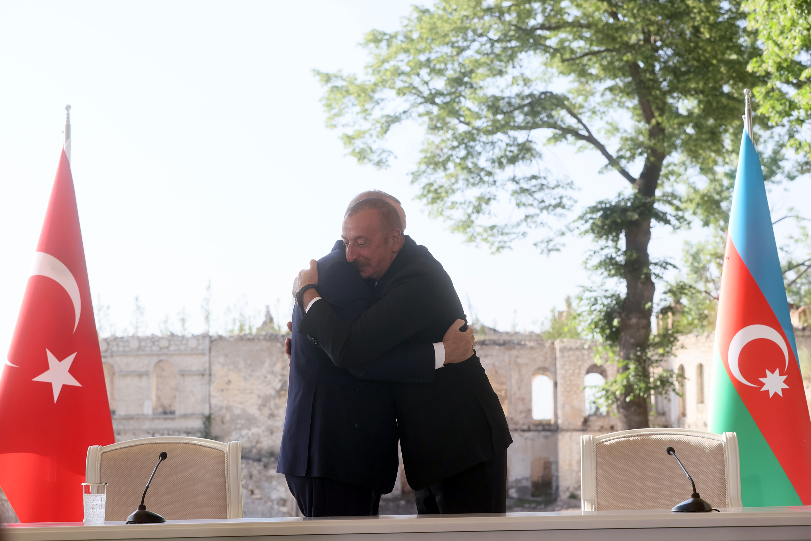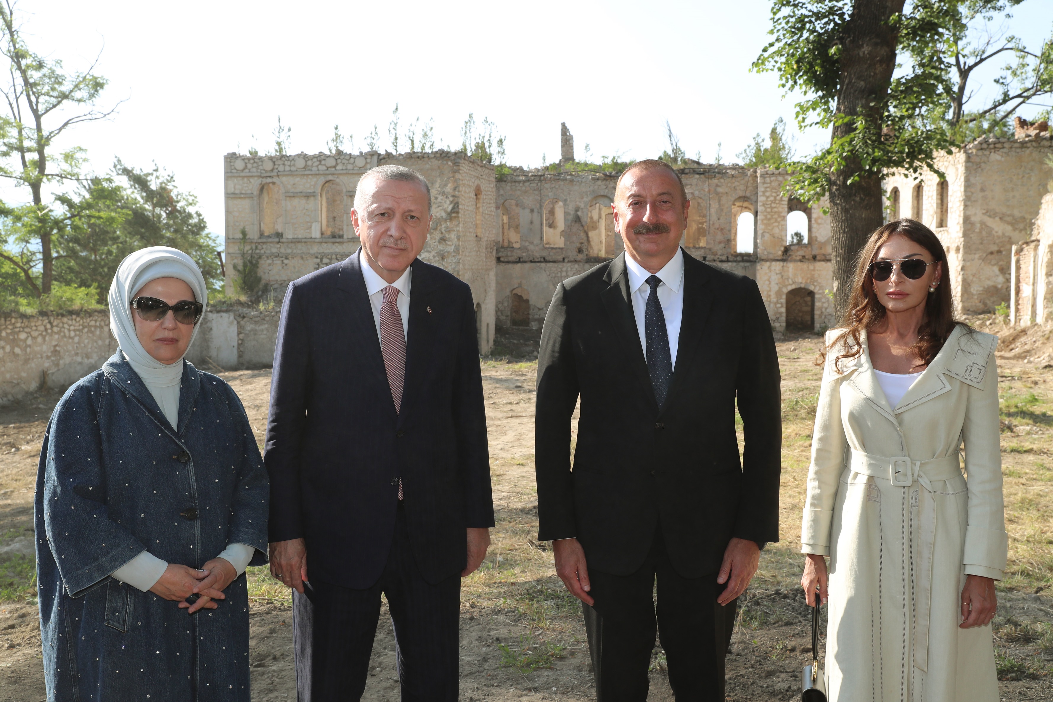 İki lider daha sonra, eşleriyle beraber basın toplantısının arka fonunu oluşturan, Ermenistan işgalinde harap edilen Karabağ Hanlık Sarayı'na geçti ve hatıra fotoğrafı çektirdi.