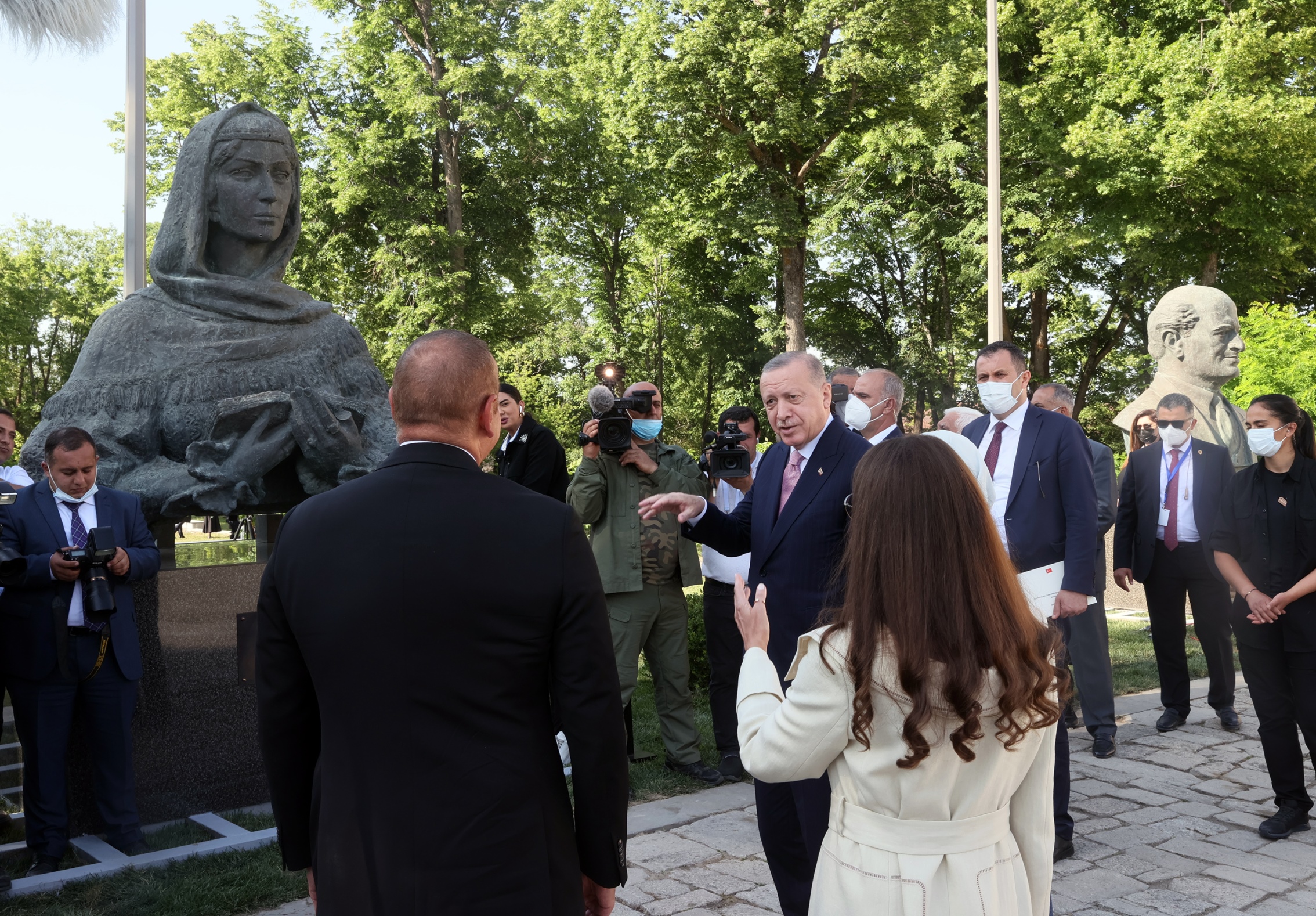 Cumhurbaşkanı Erdoğan ve Azerbaycan Cumhurbaşkanı Aliyev, baş başa görüşmenin ardından basın toplantısı alanına gelirken valilik binası önündeki Şuşa'nın önemli sanat ve edebiyat şahsiyetlerinin heykellerini inceledi.