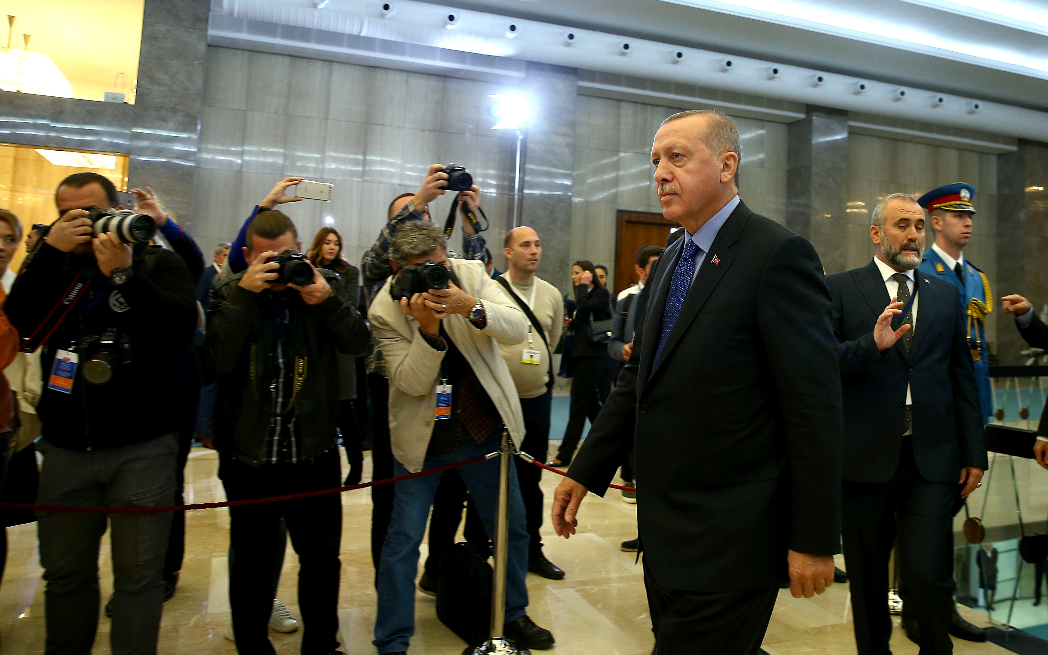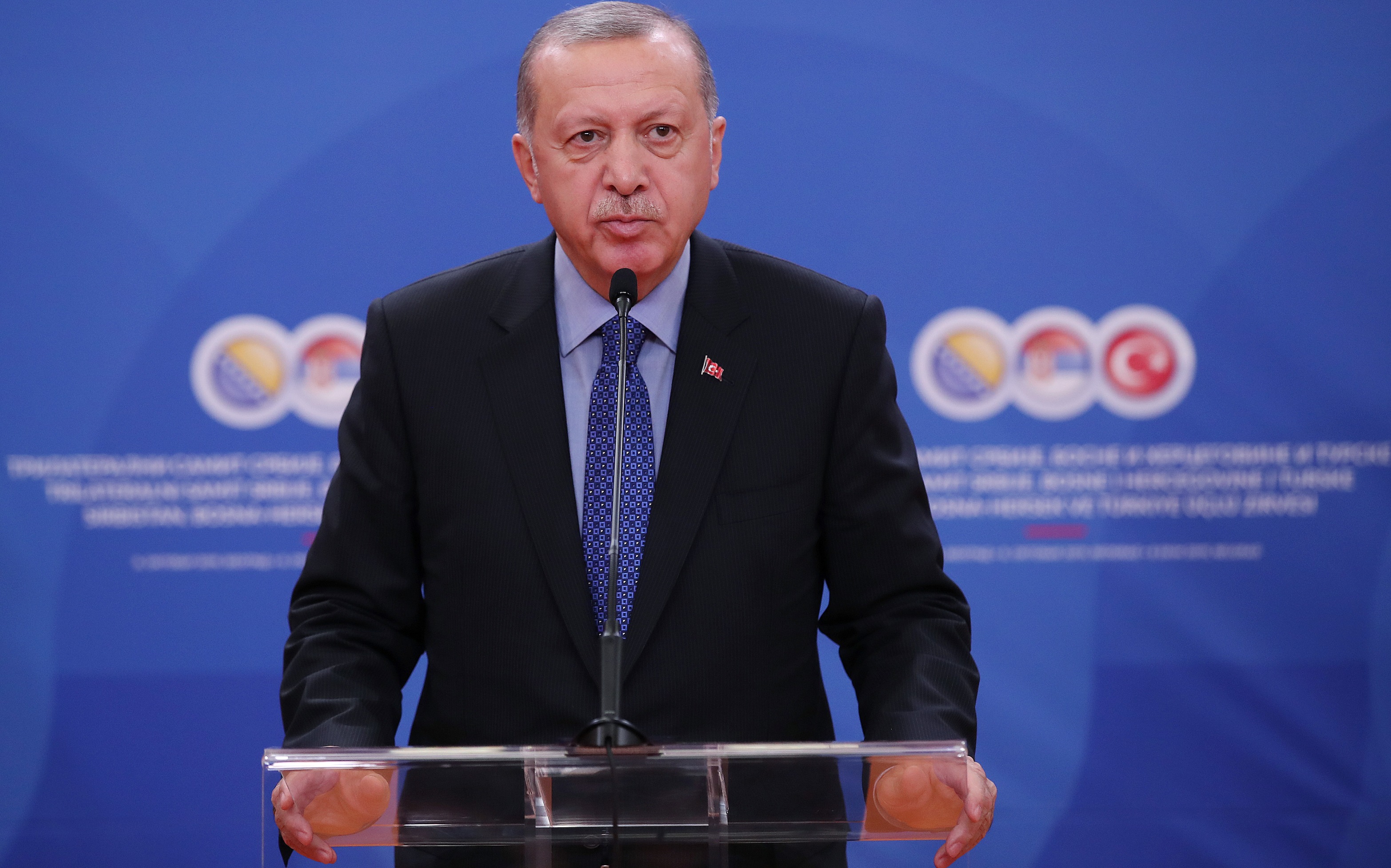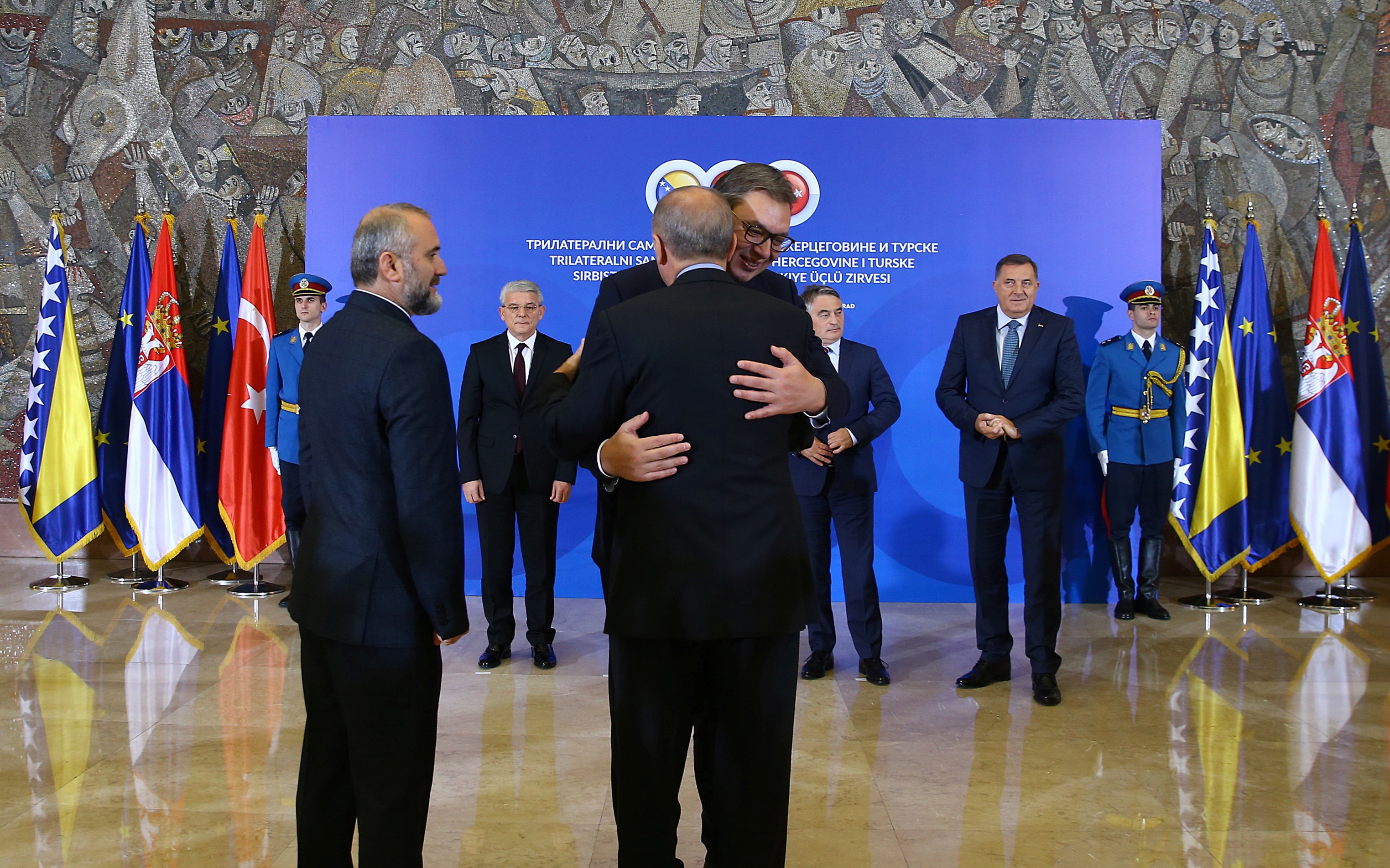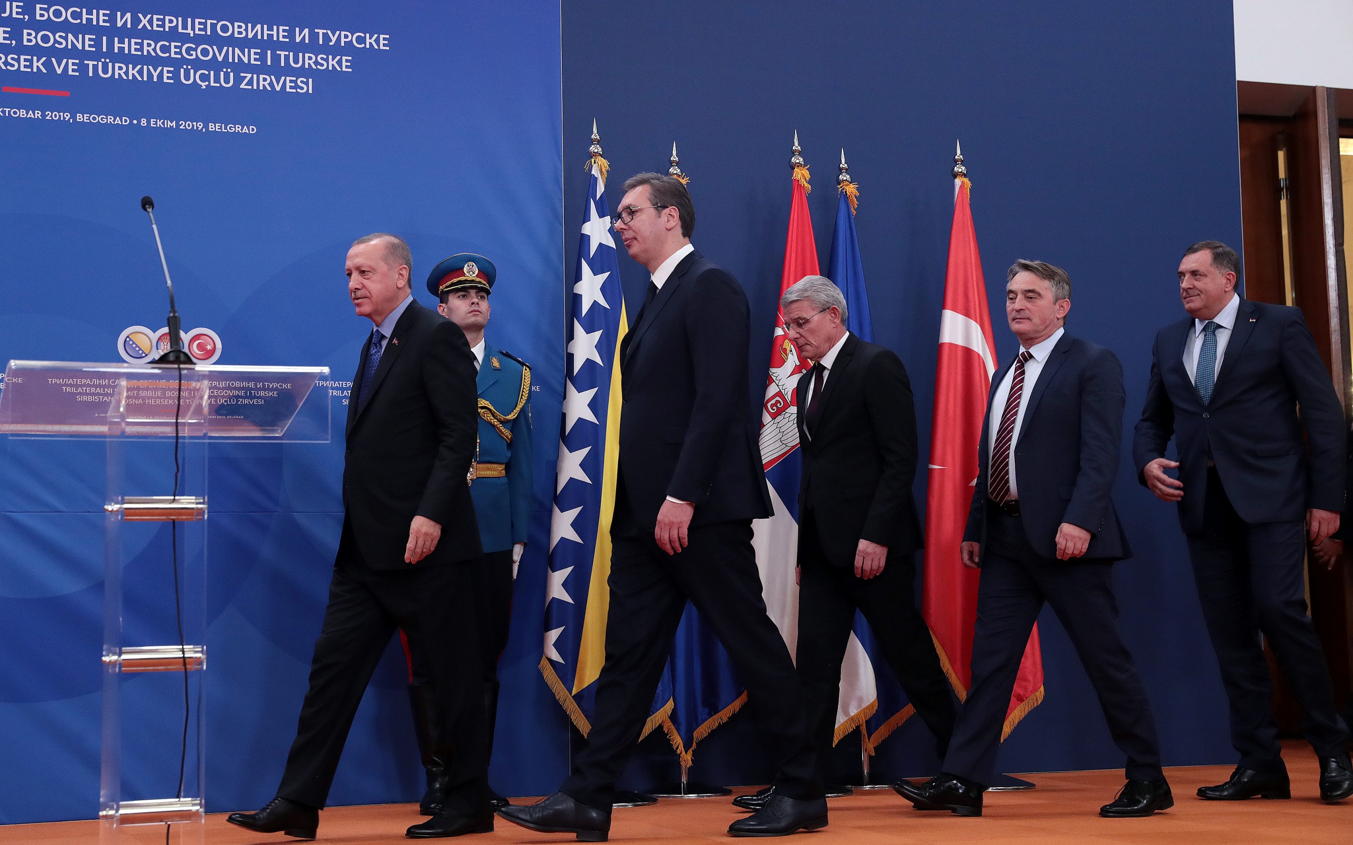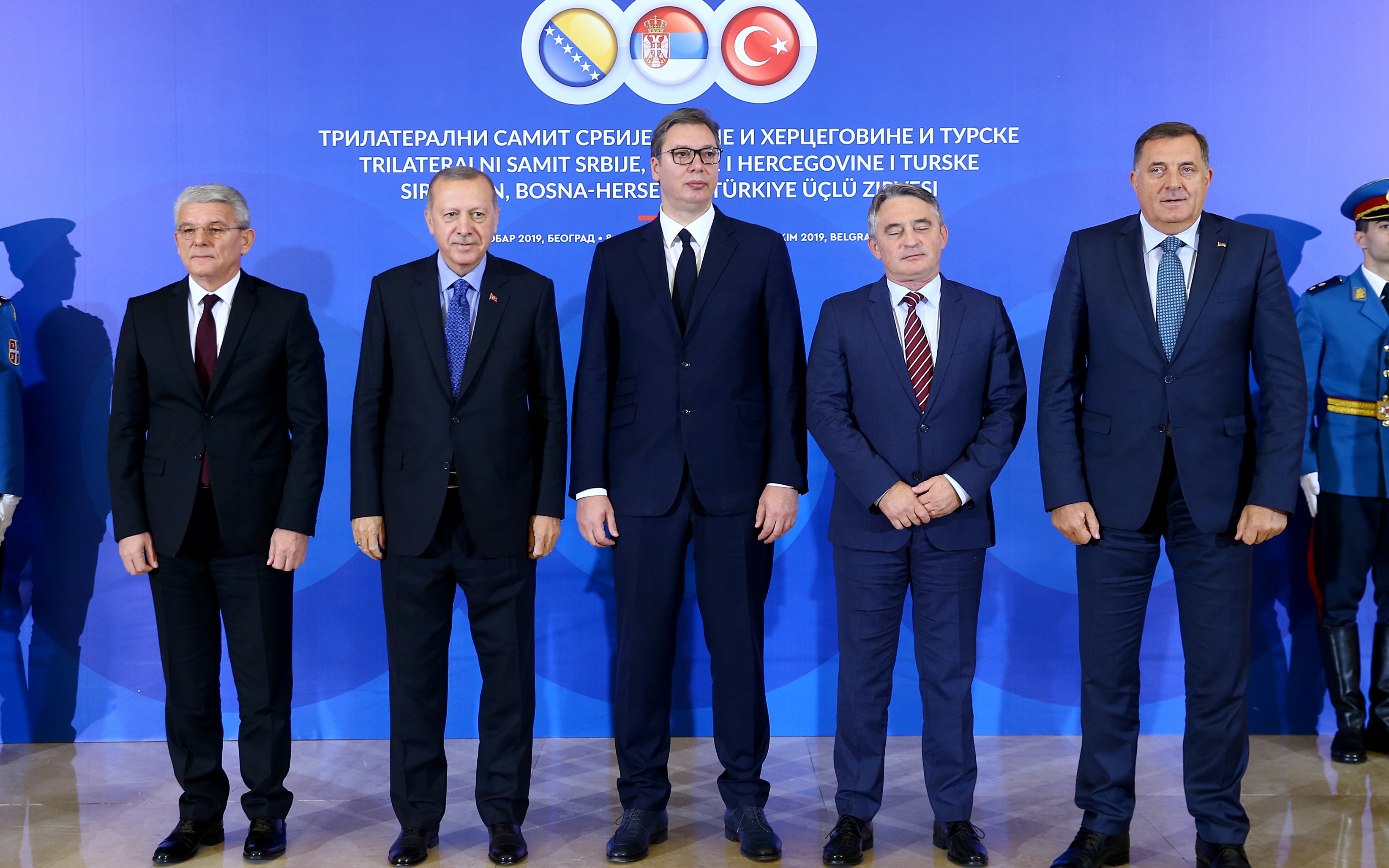 Cumhurbaşkanı Recep Tayyip Erdoğan, Sırbistan Cumhurbaşkanı Aleksandar Vucic, Bosna Hersek Devlet Başkanlığı Konseyi Başkanı Zeljko Komsic, konseyin Boşnak üyesi Sefik Dzaferovic ve Sırp üyesi Milorad Dodik Sırbistan Sarayı'nda yapılan Türkiye-Sırbistan-Bosna Hersek Üçlü Zirvesi'nin ardından ortak basın toplantısı düzenledi.