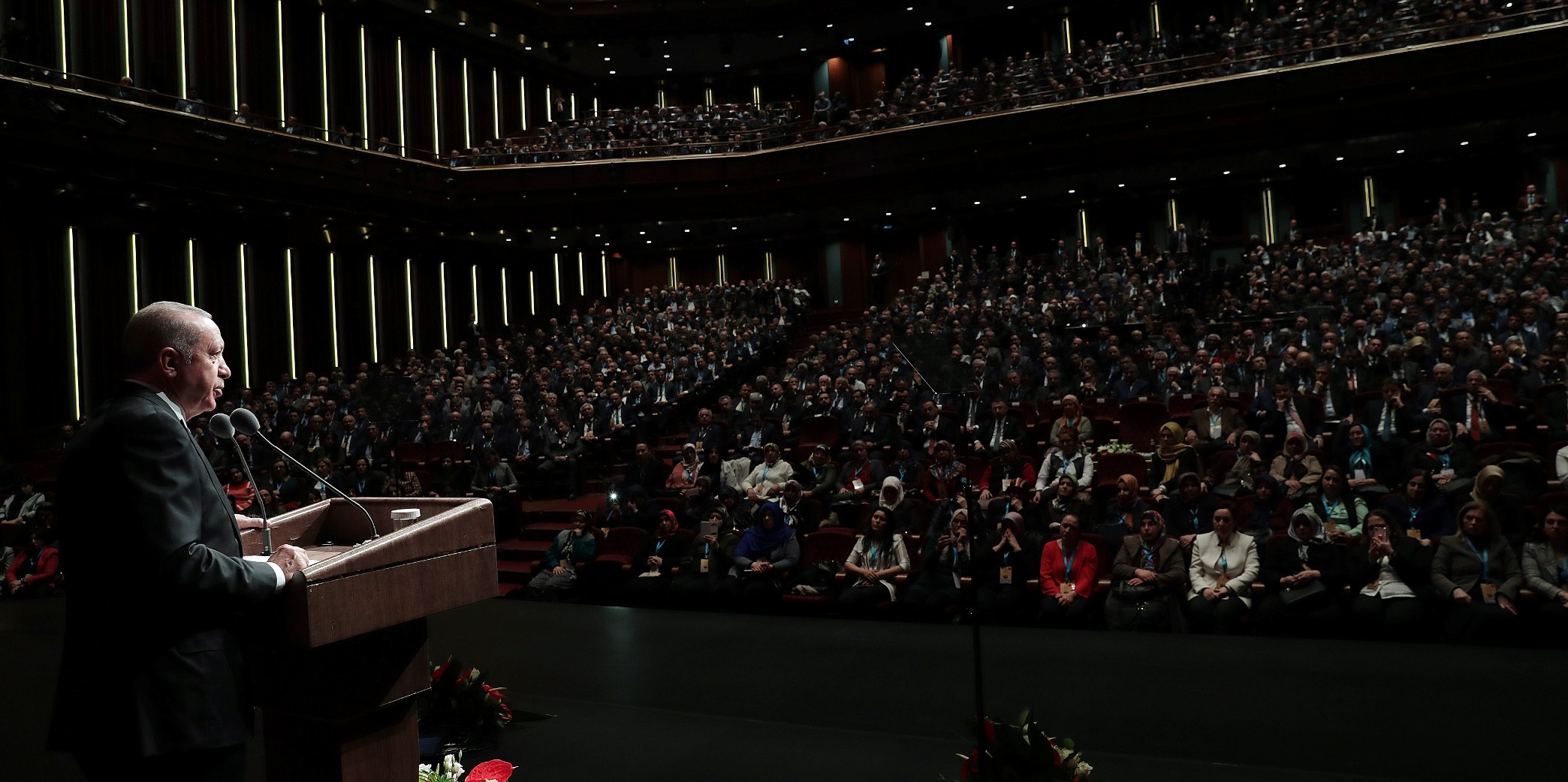 "Dünyanın en büyük 10 ekonomisi arasına girebilmemiz için önümüzdeki dönemde en az iki katlık büyümeyi daha gerçekleştirmemiz gerekiyor. Burada her partiye gönül vermiş kardeşlerimizin bulunduğunu biliyorum. Onun için sizlerden bu söylediklerimi futbol takımı tutar gibi değil, marifet iltifata tabidir anlayışla hareket ederek, kim ne hizmet verdi, kim ne hizmet veriyor, buna bakarak, siyaset gözlüğünün ötesinden bir sağduyuyla değerlendirmenizi istiyorum. Bunu yaptığınızda, hakikatleri daha iyi görme, bugün oynanan oyunları daha iyi anlama imkânı bulacağımıza inanıyorum. Ülke ve millet olarak ne zaman hedeflerimize yaklaşsak karşımıza hemen birtakım engeller çıkartılıyor. Birtakım senaryolar tedavüle sokuluyor. 2013 yılını hatırlayın; IMF'ye borcu 2013'ün mayısında kapattık. Neydi bu borç, göreve geldiğimizde yani 2002'nin sonunda 23,5 milyar dolar. Biz Mayıs 2013'te bu borcu sıfırladık, bizim şu anda IMF ile alışverişimiz yok, bitti o iş. O defteri kapattık."