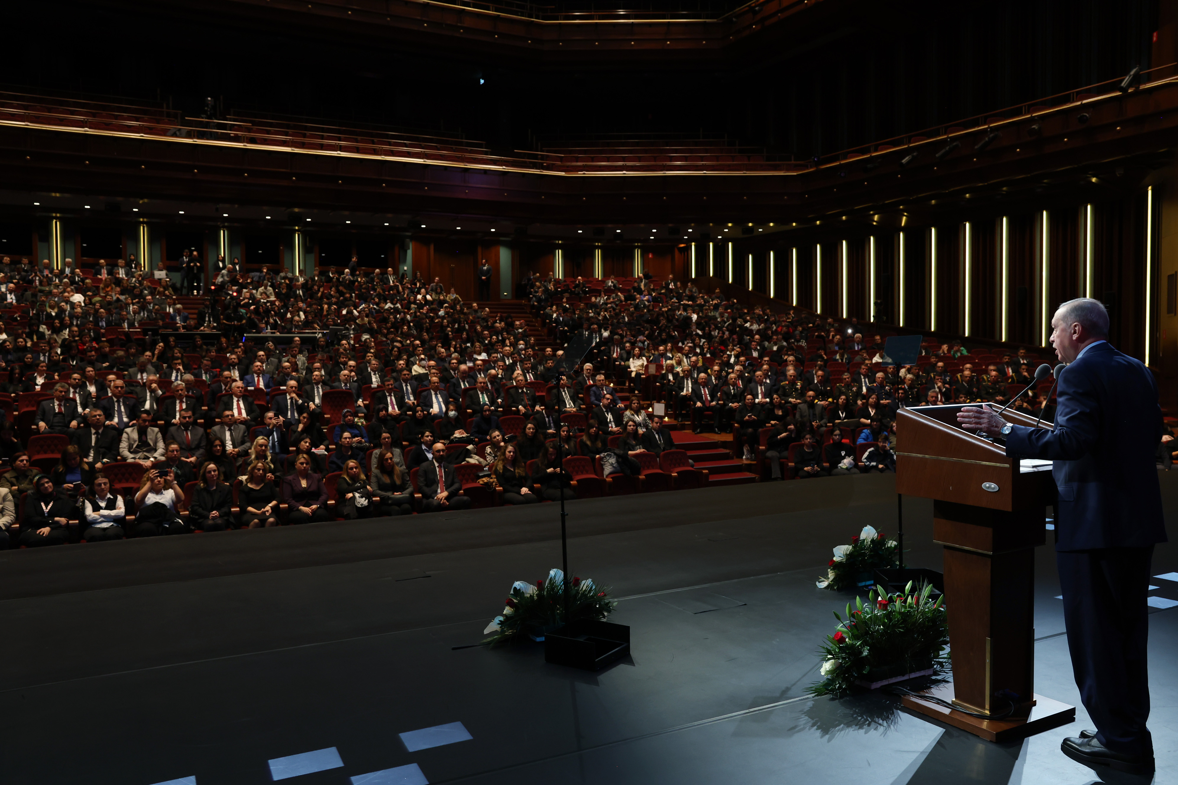 Konuşmasına Millî Mücadele'nin başkomutanı, Cumhuriyet'in kurucusu Gazi Mustafa Kemal Atatürk'ü, ebediyete irtihalinin 85'inci yılında rahmetle yâd ederek başlayan Cumhurbaşkanı Erdoğan, "Bin yıldır bu toprakların vatanımız olması için gözlerini kırpmadan canlarını ortaya koyan şehitlerimizin, gazilerimizin, kahramanlarımızın her birine Allah'tan rahmet diliyorum. Sınırlarımız içinde ve dışında görev başında olan güvenlik güçlerimizi Rabb'im muhafaza ve muzaffer eylesin diyorum. Türkiye Yüzyılı'na adım attığımız şu günlerde, ülkemizin büyümesi, devletimizin güçlenmesi, milletimizin birlik ve beraberliği için çalışan, gayret gösteren herkese şükranlarımı sunuyorum." ifadelerini kullandı.