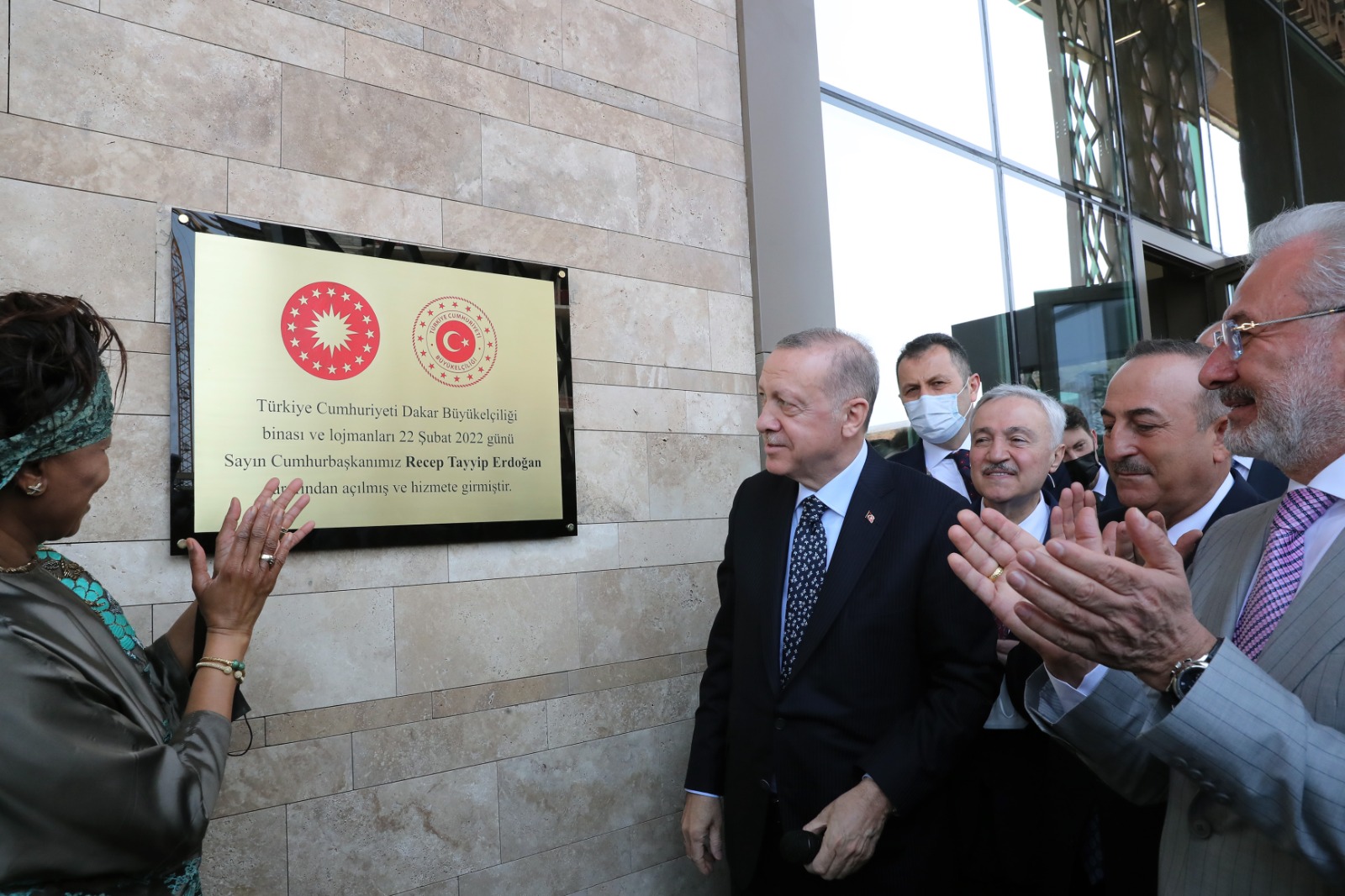 Konuşmasının ardından Maarif Vakfı kurumlarında eğitim gören öğrenciler ve beraberindekilerle kurdele keserek Türkiye'nin Dakar Büyükelçiliği kançılarya binasının açılışını gerçekleştiren Cumhurbaşkanı Erdoğan, büyükelçilik binasının iki ülke halklarına hayırlı olmasını diledi.