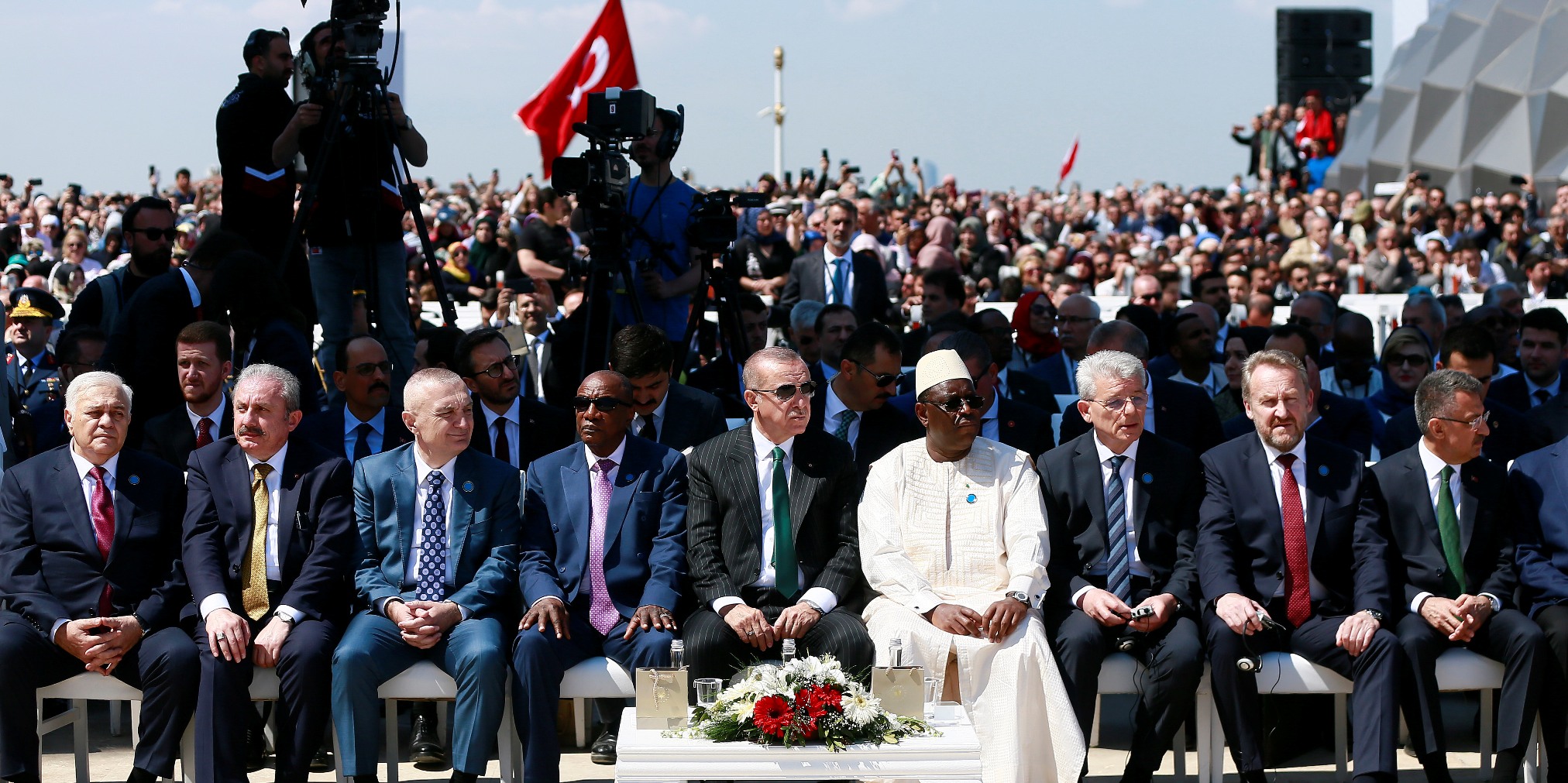 Büyük Çamlıca Camisi'nin açılış törenindeki konuşmasına dua okuyarak başlayan Cumhurbaşkanı Recep Tayyip Erdoğan, yurt dışından katılarak sevinçli ana ortak olan misafirleri ve konukları selamladı. Erdoğan, resmi açılışı yapılan caminin İstanbul, ülke ve İslam alemi için hayırlara vesile olması temennisinde bulundu.