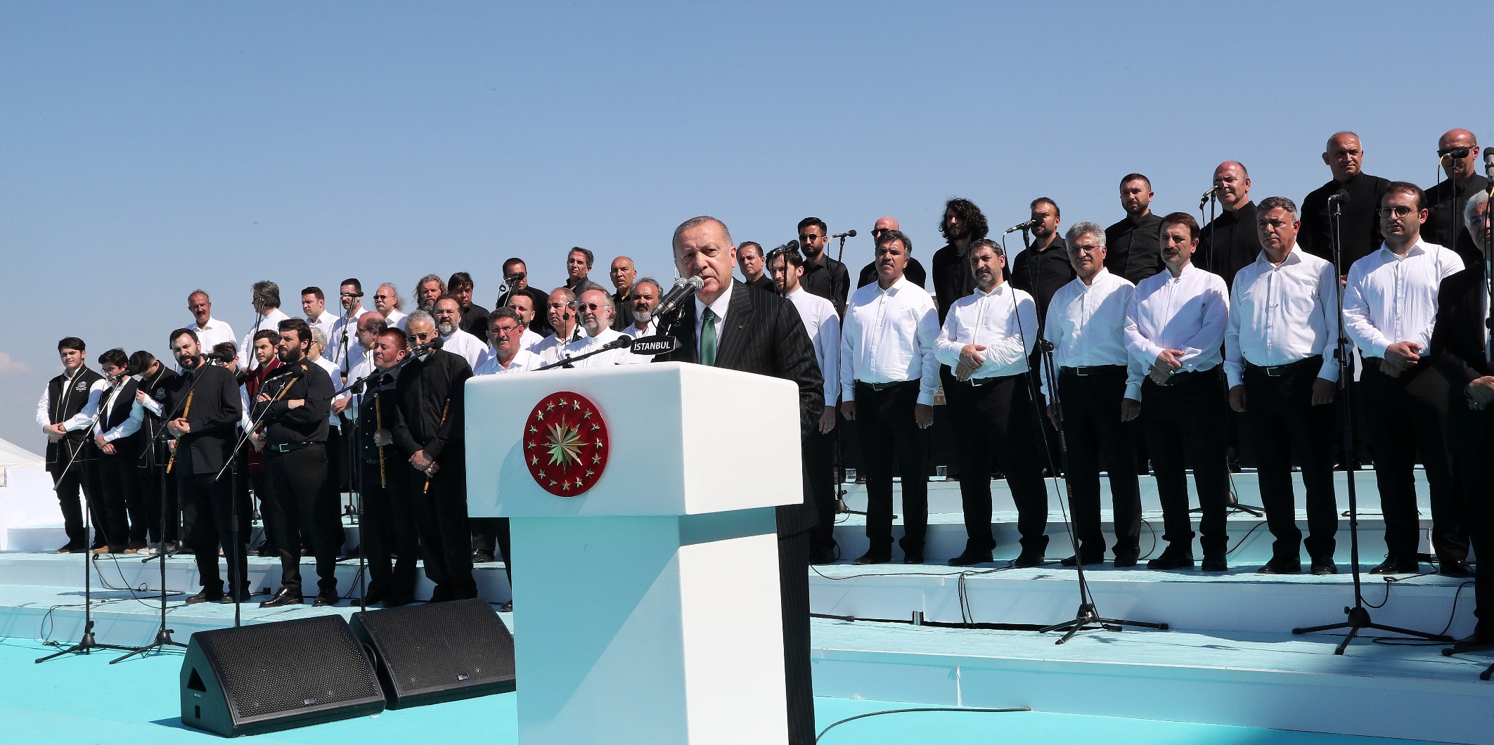 Türkiye'nin en büyük camisi vasfını taşıyan eserin İstanbul'un her noktasından da rahatça görülebildiğini aktaran Erdoğan, caminin mimarisinin tarihe, medeniyete ve inanca ait birçok sembolü de bünyesinde barındırdığını kaydetti.