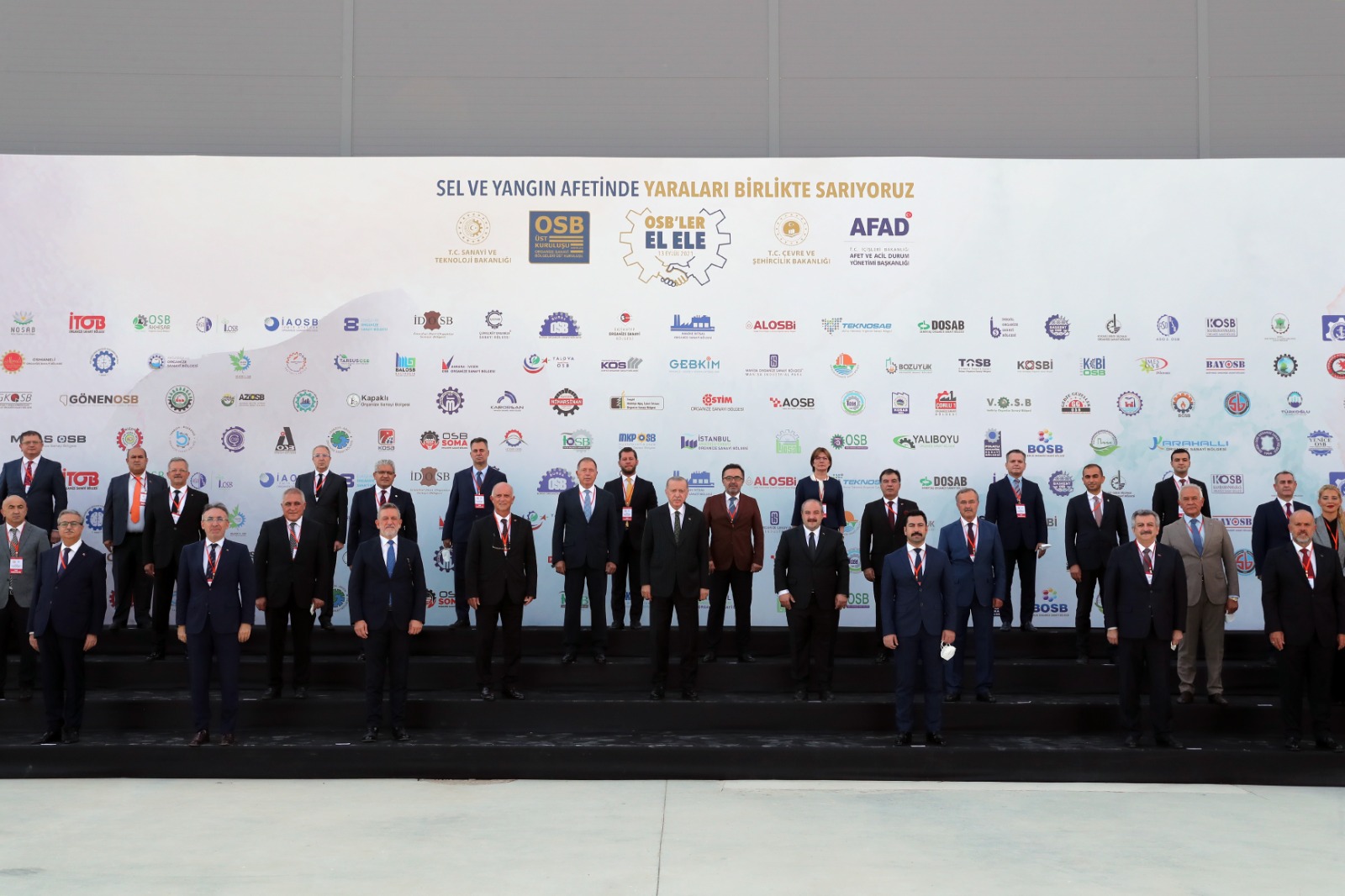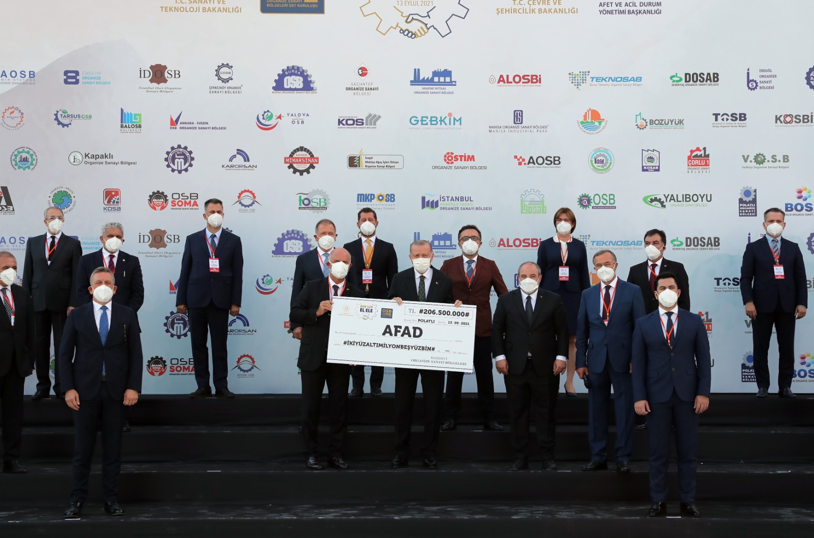 Tören öncesinde yangın ve sel felaketlerinden etkilenenlere yönelik yardım kampanyası kapsamında 93 OSB tarafından toplanan yardımlara ilişkin temsili çek, Sanayi ve Teknoloji Bakanı Mustafa Varank ve OSB başkanları tarafından Cumhurbaşkanı Erdoğan'a takdim edildi.