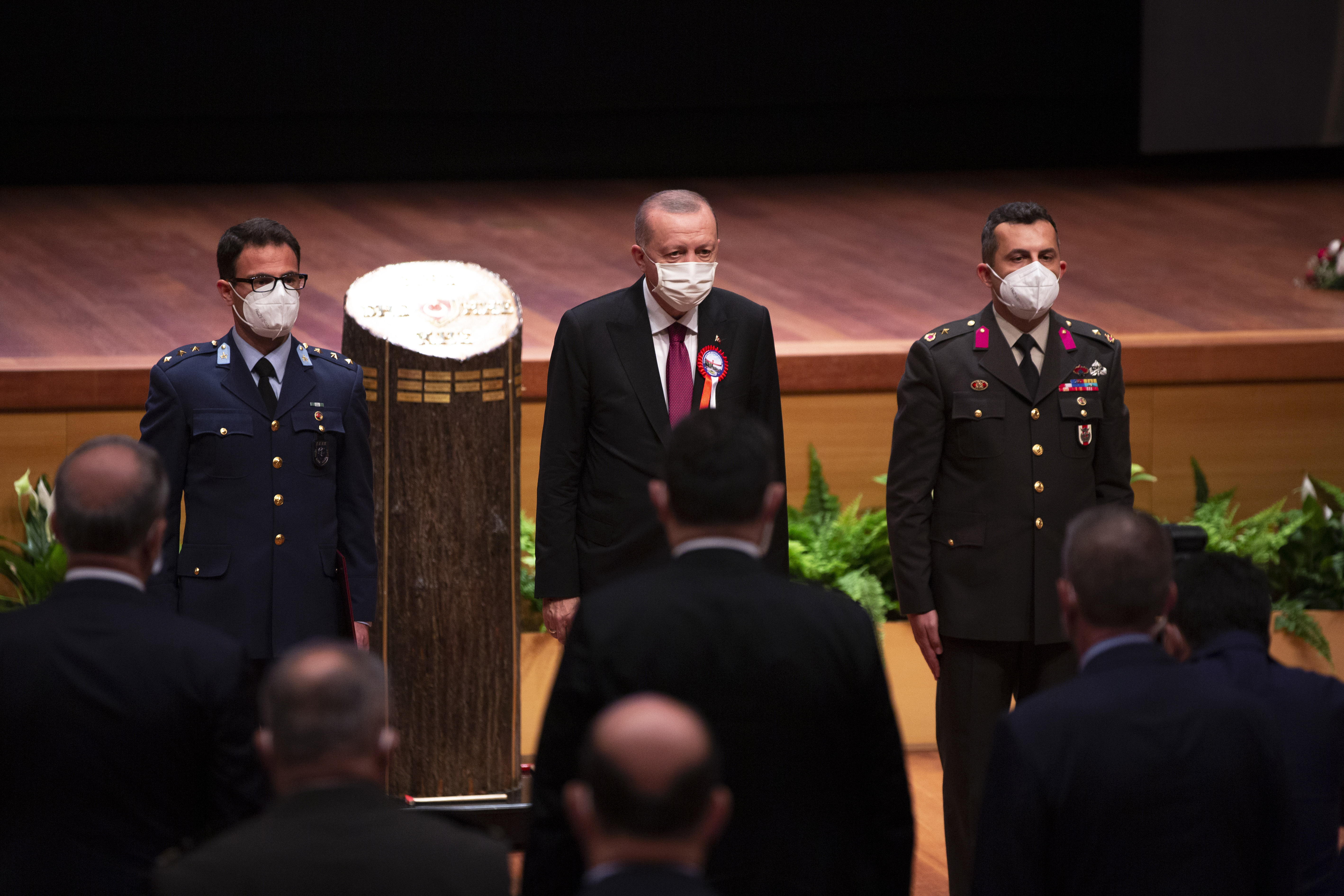 Cumhurbaşkanı Erdoğan, Milli Savunma Üniversitesi (MSÜ) Atatürk Harp Oyunu ve Kültür Merkezi'nde, MSÜ Kuvvet Harp Enstitüleri 8'inci Dönem Karargah Subaylığı ve 3'üncü Dönem Komuta ve Kurmay Eğitimi Mezuniyet Töreni'ne katıldı.