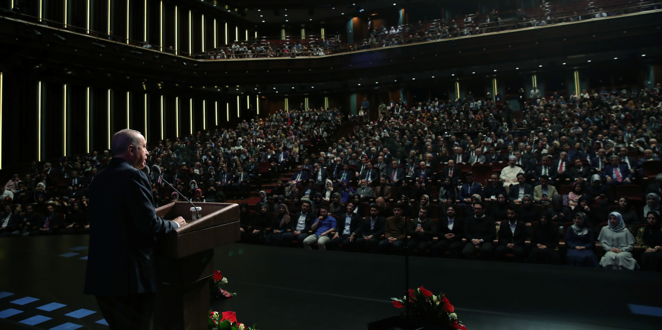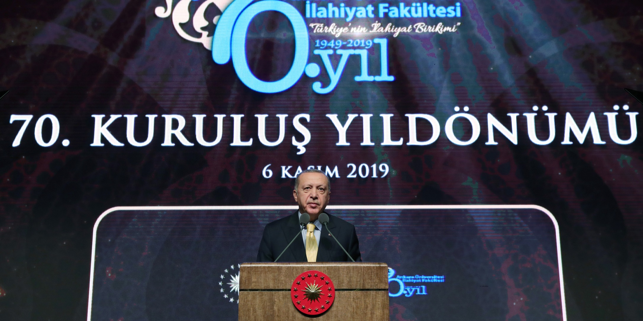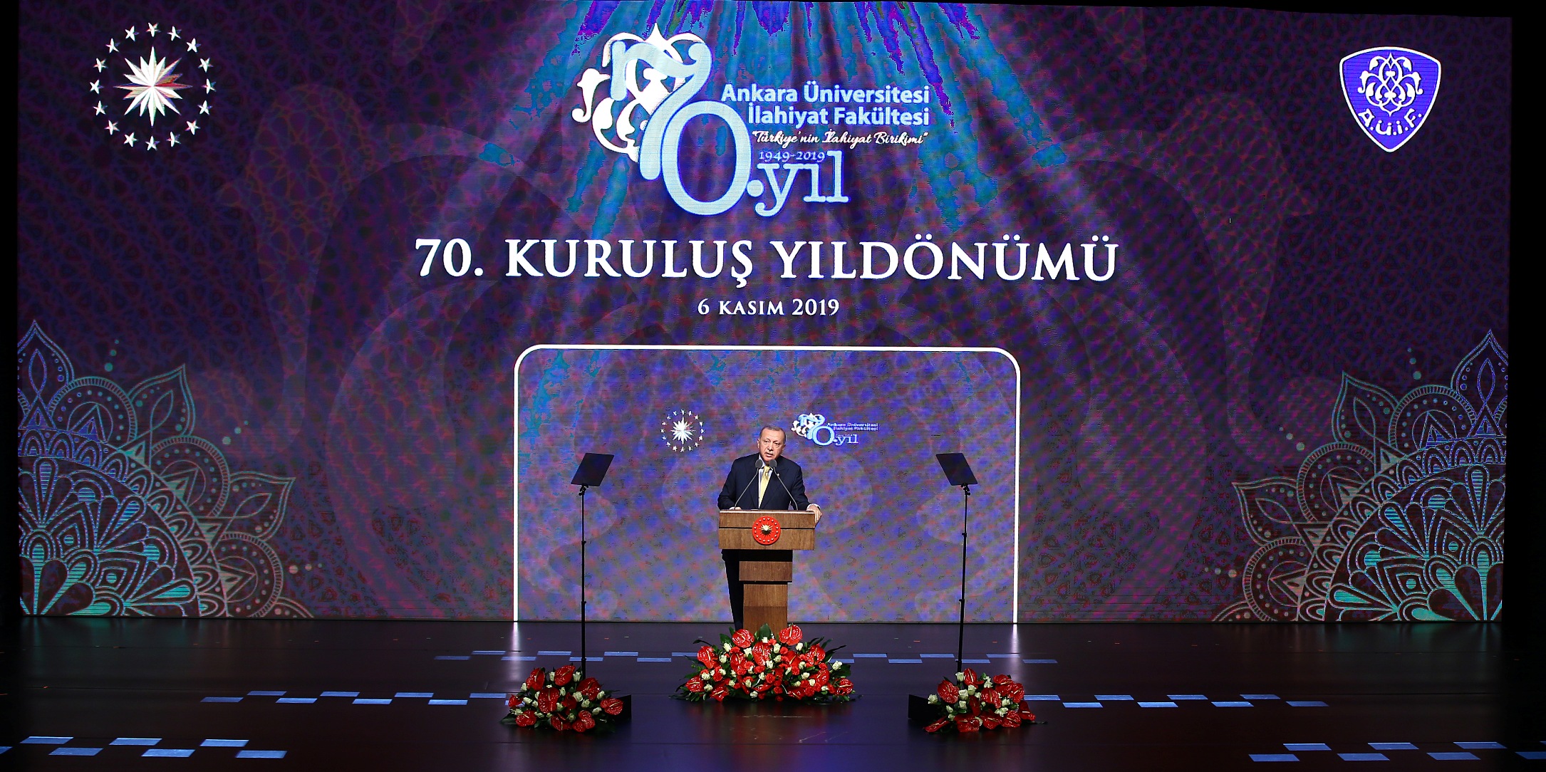 Konuşmasına, Ankara Üniversitesi İlahiyat Fakültesinin kuruluş yıl dönümünü kutlayarak başlayan Cumhurbaşkanı Erdoğan, fakültenin Türkiye'nin en köklü, yüksek din eğitimi veren kurumu ve ülkenin ilahiyat birikimi nitelemesini hak eden bir müktesebata sahip olduğunu belirtti.