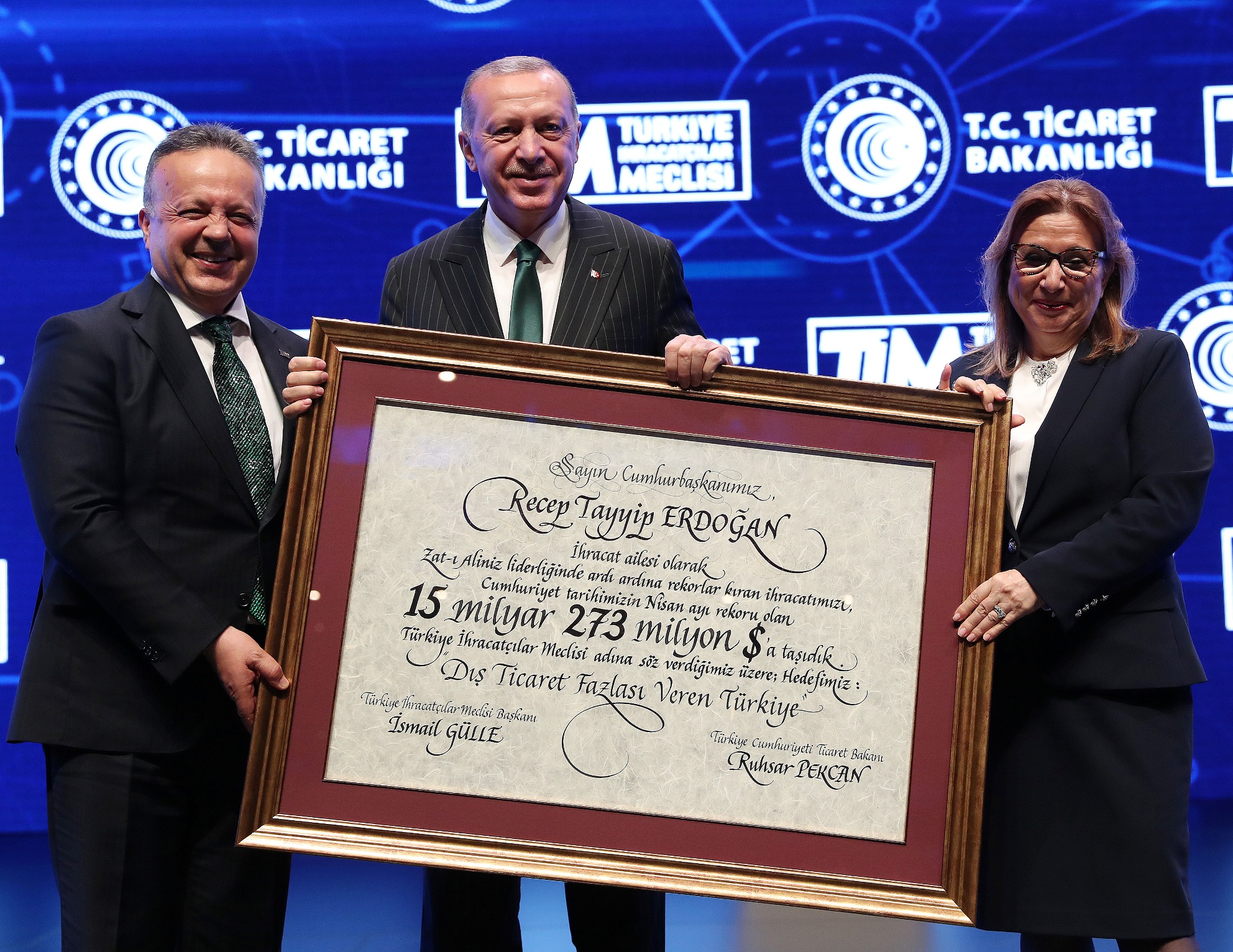"Sizler gerek ihracatımızın artırılması ve niteliğinin yükseltilmesi, gerek diğer alanlarda ortaya koyduğunuz gayretlerle ülkemizin beka mücadelesinin en ön saflarında yer alıyorsunuz. Bunun için her birinize ayrı ayrı şükranlarımı sunuyorum. Ülkemiz ihracatının tek çatı kuruluşu olan Türkiye İhracatçılar Meclisi, 83 bin üyesiyle Türk ticaret diplomasisinin sahadaki en büyük gücüdür. Bugün Türkiye dünyadaki 222 ülke ve bölgede ürünleriyle bayrak gösteriyor. Geçtiğimiz ay itibarıyla ihracatımız bir önceki yılın aynı ayına göre yüzde 5,4 artarak 15 milyar 273 milyon dolara ulaşırken, ithalatımız yüzde 14,6 azalarak 18,1 milyar dolara geriledi. Böylece dış ticaret açığımız yüzde 57,8 azalarak 2 milyar 831 milyon dolar olarak gerçekleşti.