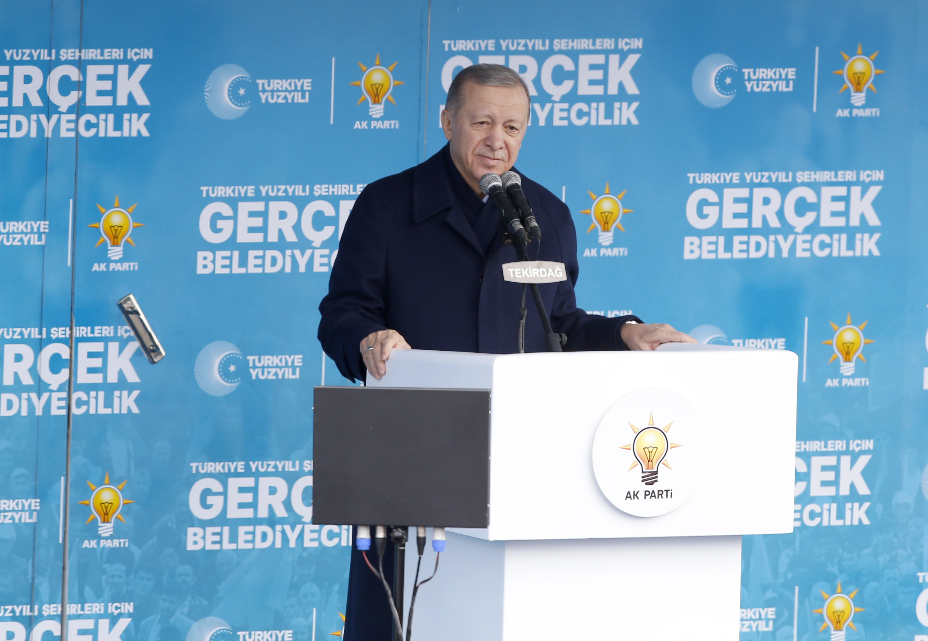 "Yeniden Tekirdağ" dediklerini ifade eden Cumhurbaşkanı Erdoğan, "Genç, dinamik bir yapıyla Tekirdağ'da merkezi yönetim ve Tekirdağ Belediyemiz, el ele vereceğiz ve Tekirdağ'ı ayağa kaldıracağız. Tekirdağ'ın da bu süreçte bizlere destek vereceğine, bu mücadelemizde bizleri yalnız bırakmayacağına inanıyorum. Biz, Tekirdağ'ı tıpkı hükümet işlerinde olduğu gibi yerel yönetim tarafında da hak ettiği hizmetlerle buluşturmak istiyoruz. Tekirdağ'ın AK Parti ve Cumhur İttifakı'nın gerçek belediyecilik vizyonuna acil ihtiyacı olduğu açıktır. İnşallah 31 Mart yerel seçimleri bu noktada, Tekirdağ'ımız için bir milat olacaktır." diye konuştu.