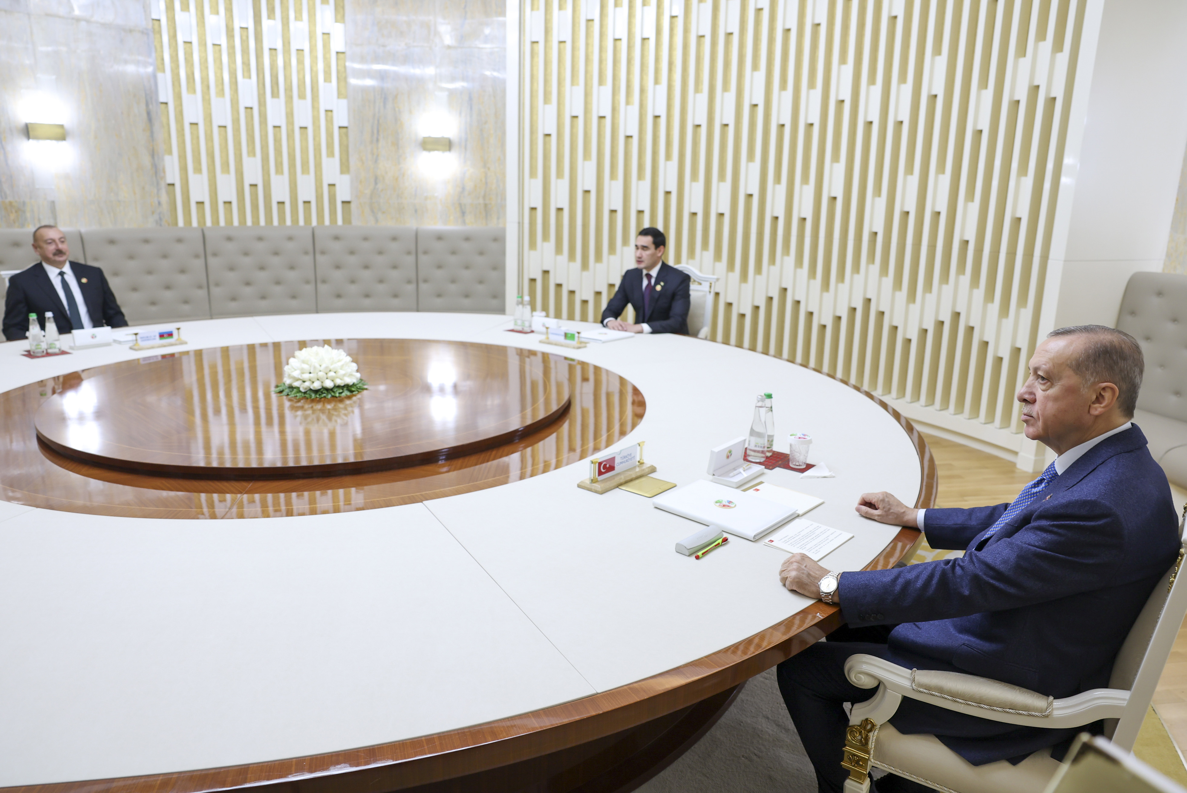Cumhurbaşkanı Erdoğan, yaptığı ikili görüşmelerin ardından, Azerbaycan Cumhurbaşkanı İlham Aliyev ve Türkmenistan Devlet Başkanı Serdar Berdimuhamedov ile liderler toplantısında bir araya geldi.