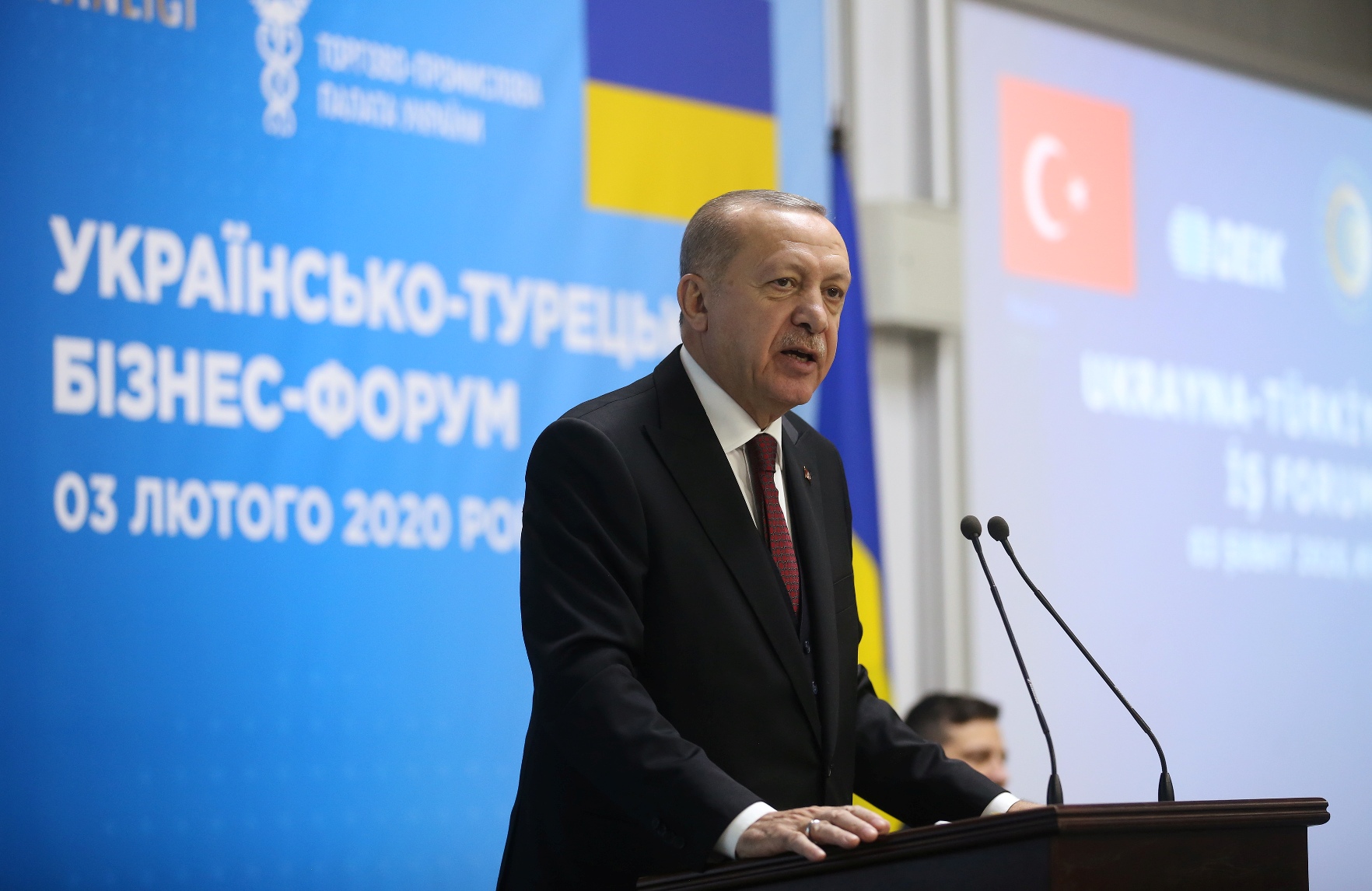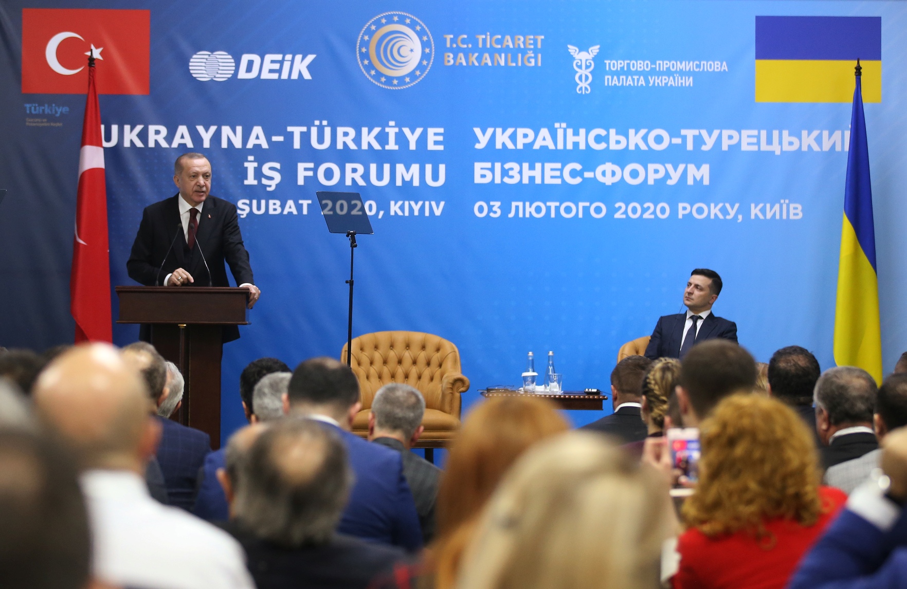 Cumhurbaşkanı Erdoğan, Ukrayna Devlet Başkanı Zelenskiy ile Kiev Sanayi Odası'nda düzenlenen Ukrayna-Türkiye İş Forumu'na katıldı.
