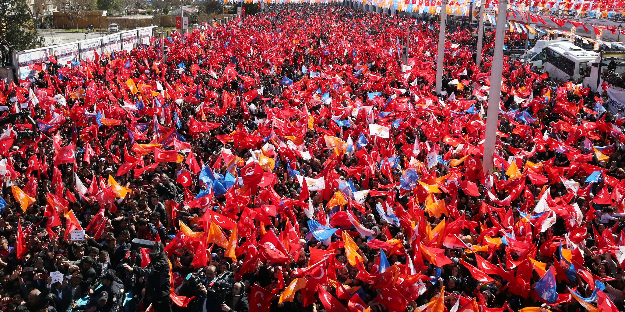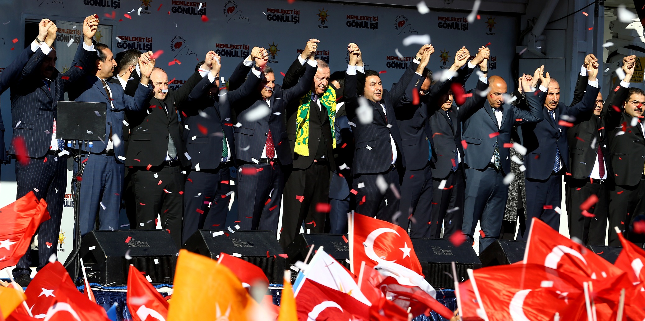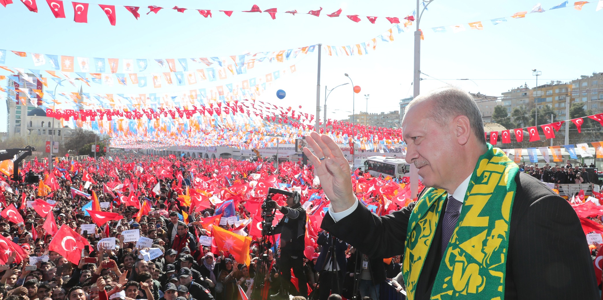 Erdoğan, mitinge katılanlara yönelttiği, "Urfa, 31 Mart'ta istikrarımıza, istiklalimize ve istikbalimize göz dikenlere derslerini veriyor muyuz? Urfa, 31 Mart'ta milli iradeye sahip çıkıyor muyuz? Urfa, 31 Mart'ta tevazu, samimiyet ve gayretle 'Memleket işi gönül işi' diyor muyuz? Mardin, 31 Mart'ta mührü gönül belediyeciliğine vuruyor muyuz? Urfa, 31 Mart'ta büyükşehirde ve ilçelerimizde belediye başkanlarımıza sahip çıkıyor muyuz?" sorularına, "Evet" yanıtını aldı.