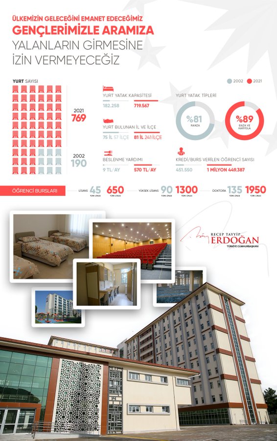 Buna göre 2002'de 190 olan yurt sayısı 2021'de 769'a, 182 bin 258 olan yatak sayısı 719 bin 567'ye, yurt bulunan il sayısı 75'ten 81'e, ilçe sayısı 57'den 241'e, beslenme yardımı 9 liradan 570 liraya, kredi ve burs verilen öğrenci sayısı 451 bin 550'den 1 milyon 449 bin 387'ye yükseldi.