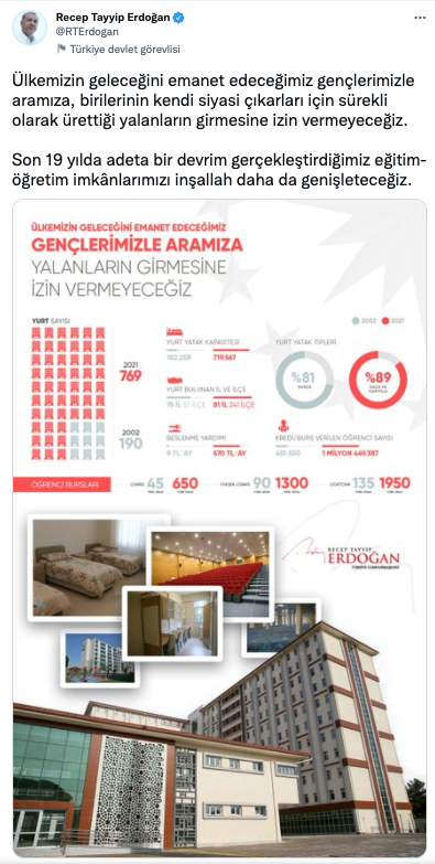 Cumhurbaşkanı Erdoğan, sosyal medya hesabından yaptığı açıklamada, "Ülkemizin geleceğini emanet edeceğimiz gençlerimizle aramıza, birilerinin kendi siyasi çıkarları için sürekli olarak ürettiği yalanların girmesine izin vermeyeceğiz. Son 19 yılda adeta bir devrim gerçekleştirdiğimiz eğitim-öğretim imkanlarımızı inşallah daha da genişleteceğiz." ifadesini kullandı.