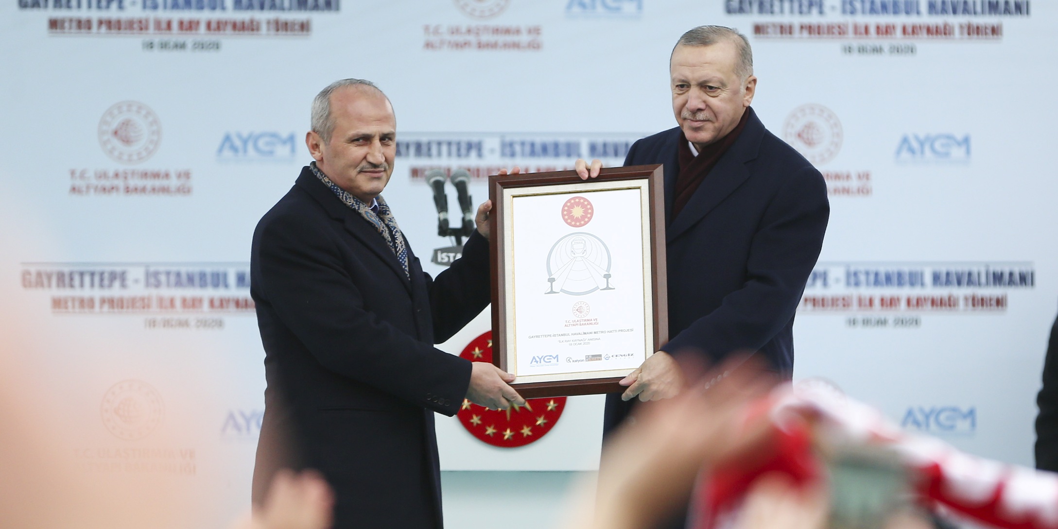 "Havalimanımızı şehrimize kazandırırken elbette ulaşım boyutunu da ihmal etmedik. Açılışla birlikte havalimanı işletmesi kendi otobüs seferlerini zaten başlattı. Toplu taşımayı kolaylaştırmak ve hızlandırmak amacıyla metro hattının inşası için de hemen kolları sıvadık. Toplam uzunluğu 37,5 kilometreyi bulan ve 9 istasyondan oluşan bu metro güzergahı, İstanbul'daki diğer tüm toplu taşıma hatlarıyla da bağlantılıdır. Gayrettepe-İstanbul Havalimanı metro hattı, ülkemizin kazı çalışmaları en hızlı yürütülen projesidir. Sayın Bakanımızın da ifade ettiği gibi, 10 kazı makinesinin birden çalıştığı bu süreci hamdolsun başarıyla sürdürüyoruz. Kazı çalışmalarının yüzde 94'ü, tünellerin de önemli bir kısmı tamamlandı. Projenin genelinde de aşağı yukarı üçte ikilik gerçekleşme oranına ulaştık. Şimdi rayların döşemesine başlıyoruz. Amacımız 24 saat kesintisiz çalışmayla günde 470 metrelik ray montajını gerçekleştirmektir."