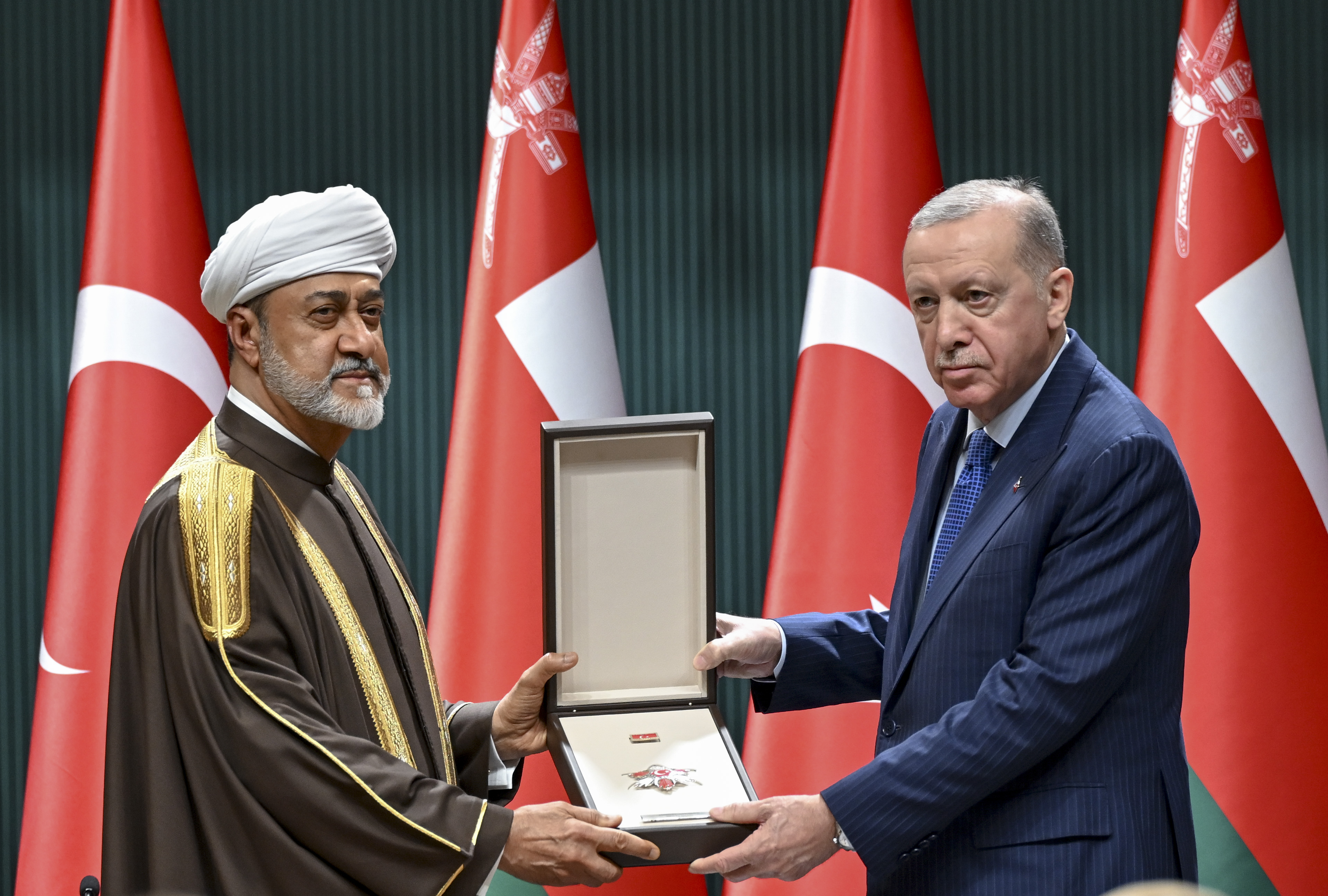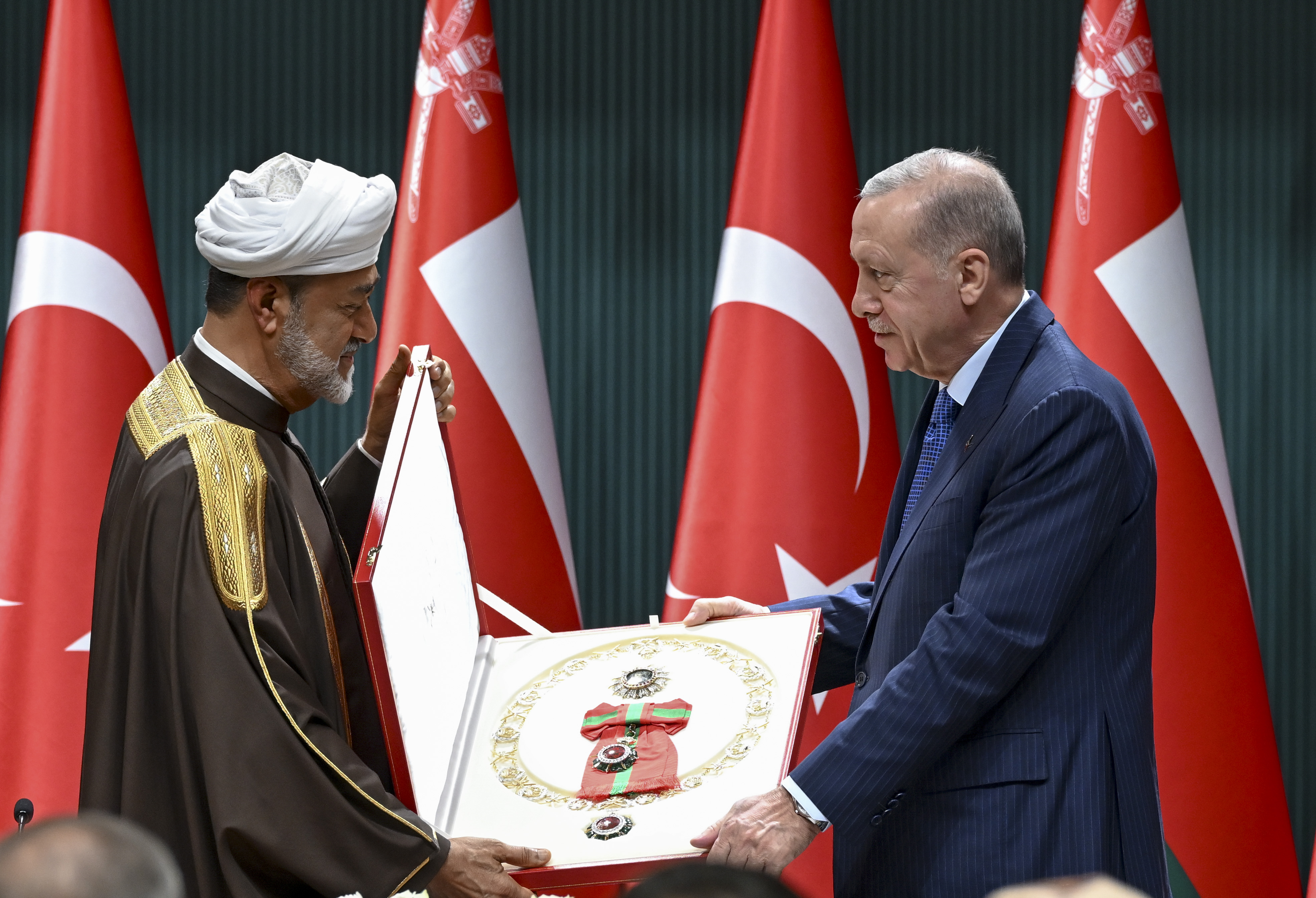Cumhurbaşkanı Erdoğan tarafından Umman Sultanı Heysem bin Tarık'a Devlet Nişanı tevcih edilirken Bin Tarık tarafından Cumhurbaşkanı Erdoğan'a Al Said Nişanı takdim edildi.