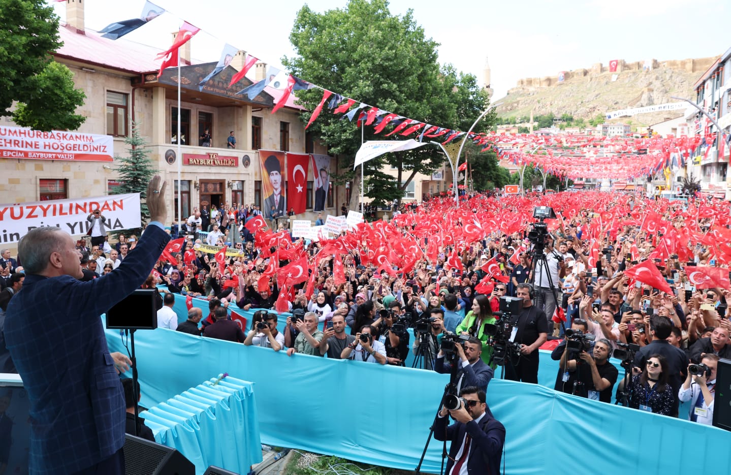 Konuşmasına Bayburtluları selamlayarak başlayan Cumhurbaşkanı Erdoğan, meydandaki yoğunluğa işaret ederek, 28 Mayıs'taki seçimde alınan neticenin Bayburt'ta kendini gösterdiğini söyledi.