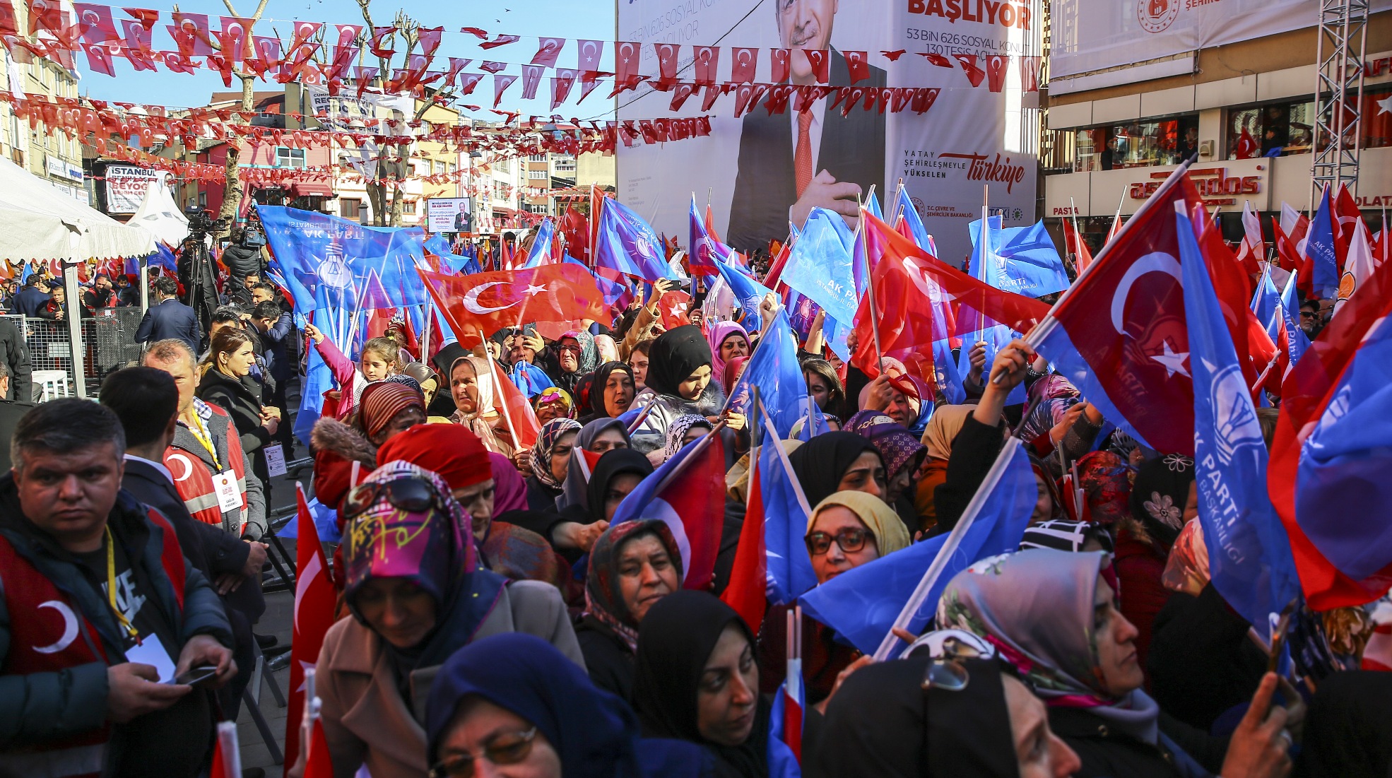 Erdoğan'ın "İstanbul 31 Mart'ta ülkene sahip çıkıyor musun? İstanbul 31 Mart'ta geleceğine sahip çıkıyor musun? İstanbul 31 Mart'ta sandığa, demokrasiye, milli iradeye sahip çıkıyor musun? İstanbul 31 Mart'ta tevazu, samimiyet ve gayretle memleket işi gönül işi diyor musun? İstanbul 31 Mart'ta hizmet siyasetini tercih ediyor musun?" sözlerine kalabalık, "Evet" yanıtını verdi.