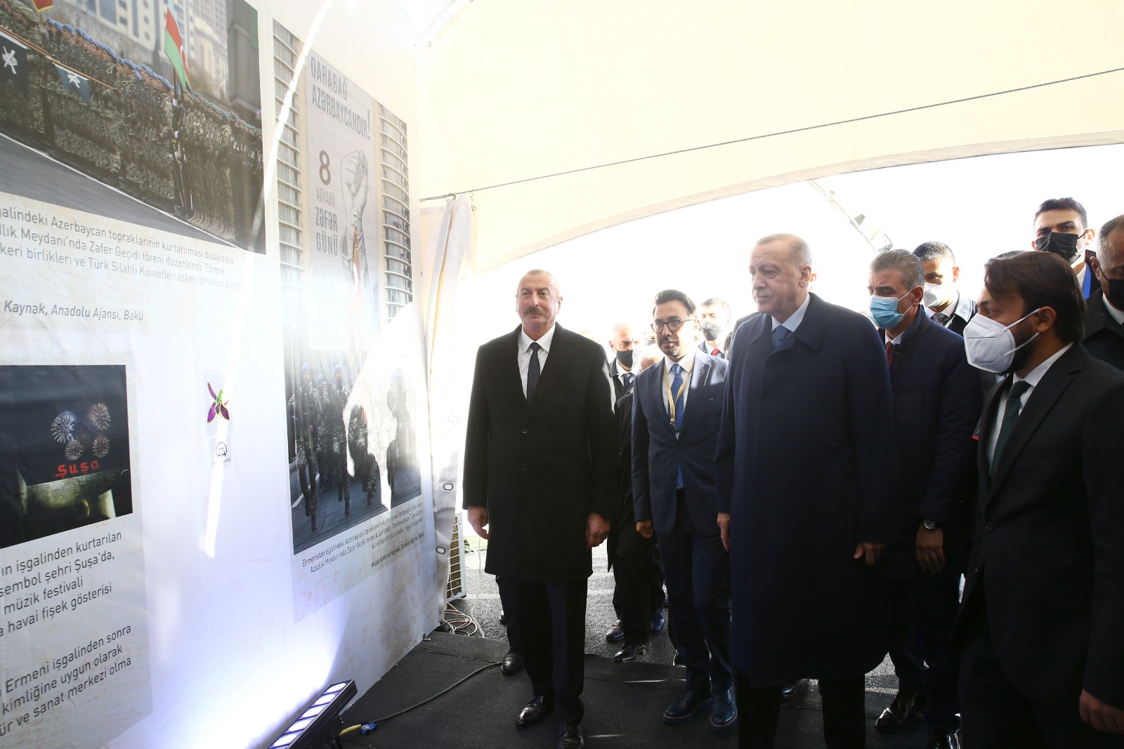 İki ülkenin cumhurbaşkanı, Anadolu Ajansının (AA) Türkiye ile Azerbaycan kardeşliğini ve Karabağ Savaşı'nı yansıtan fotoğraflardan oluşan Dost Agropark'taki "Karabağ Zaferi" sergisini inceledi.