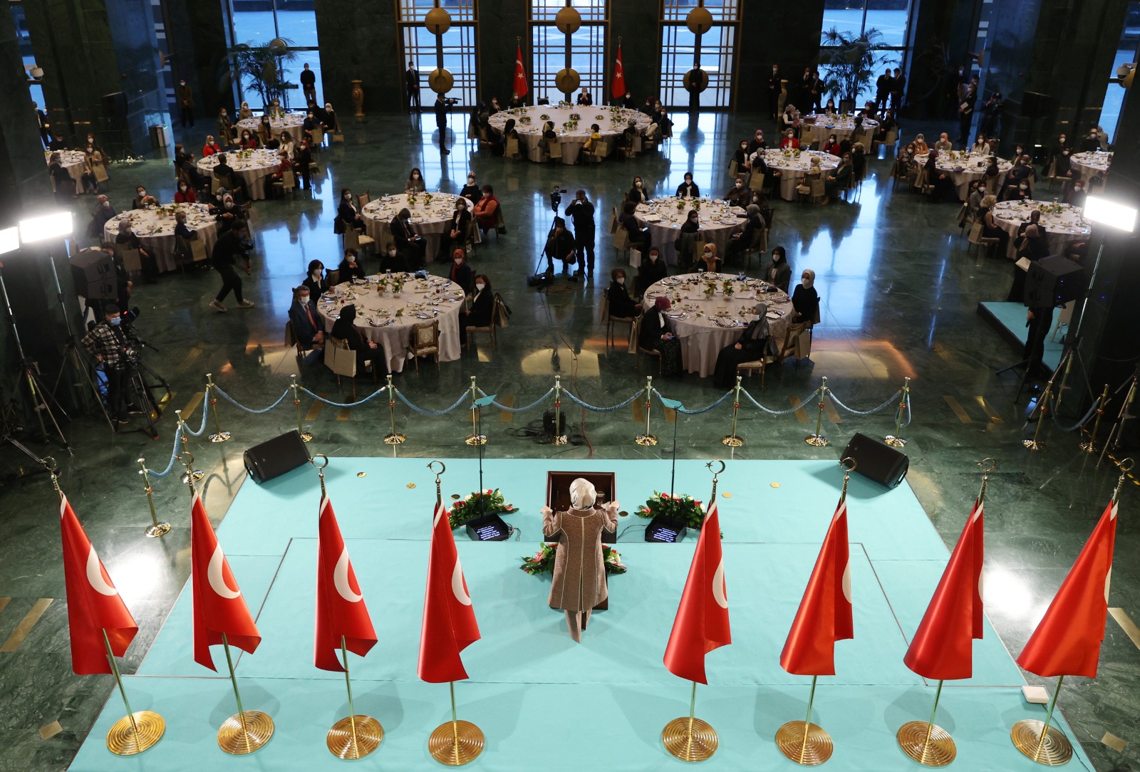 Davetlilere hitap eden Emine Erdoğan, 8 Mart Dünya Kadınlar Günü münasebetiyle, milletin evinde sağlık çalışanı ve sosyal hizmet uzmanı kadınları misafir etmekten büyük bahtiyarlık duyduğunu söyledi.
