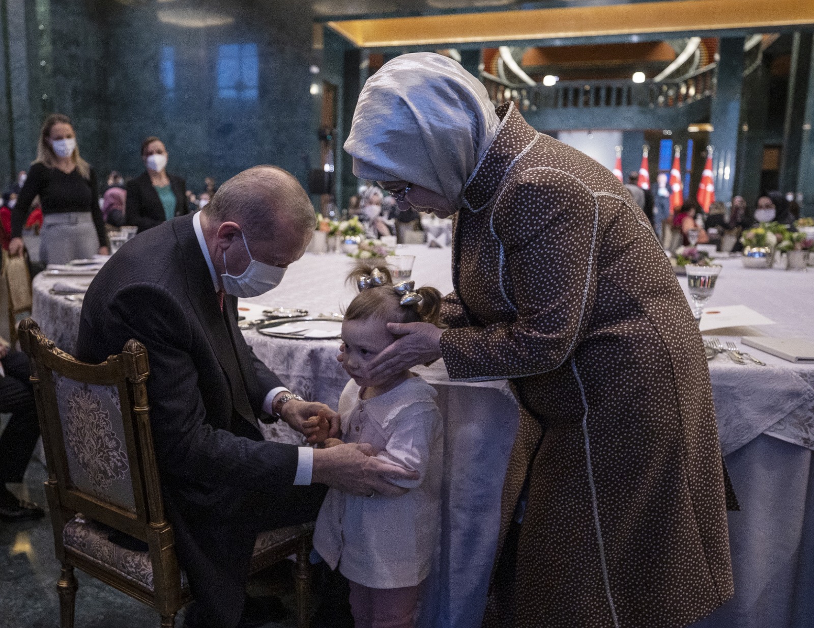 Cumhurbaşkanı Recep Tayyip Erdoğan ve eşi Emine Erdoğan, 8 Mart Dünya Kadınlar Günü dolayısıyla Cumhurbaşkanlığı Külliyesi'nde sağlık çalışanı ve sosyal hizmet uzmanı kadınlarla akşam yemeğinde bir araya geldi.