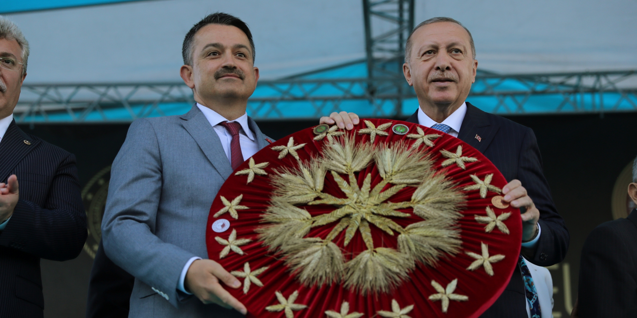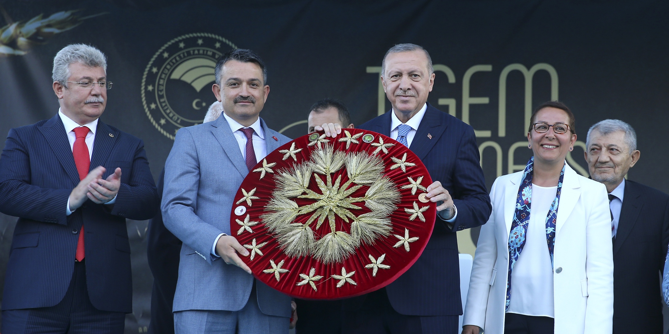 Konuşmanın ardından, Tarım ve Orman Bakanı Bekir Pakdemirli, Cumhurbaşkanı Erdoğan'a buğday başaklarından yapılan Cumhurbaşkanlığı forsu hediye etti.