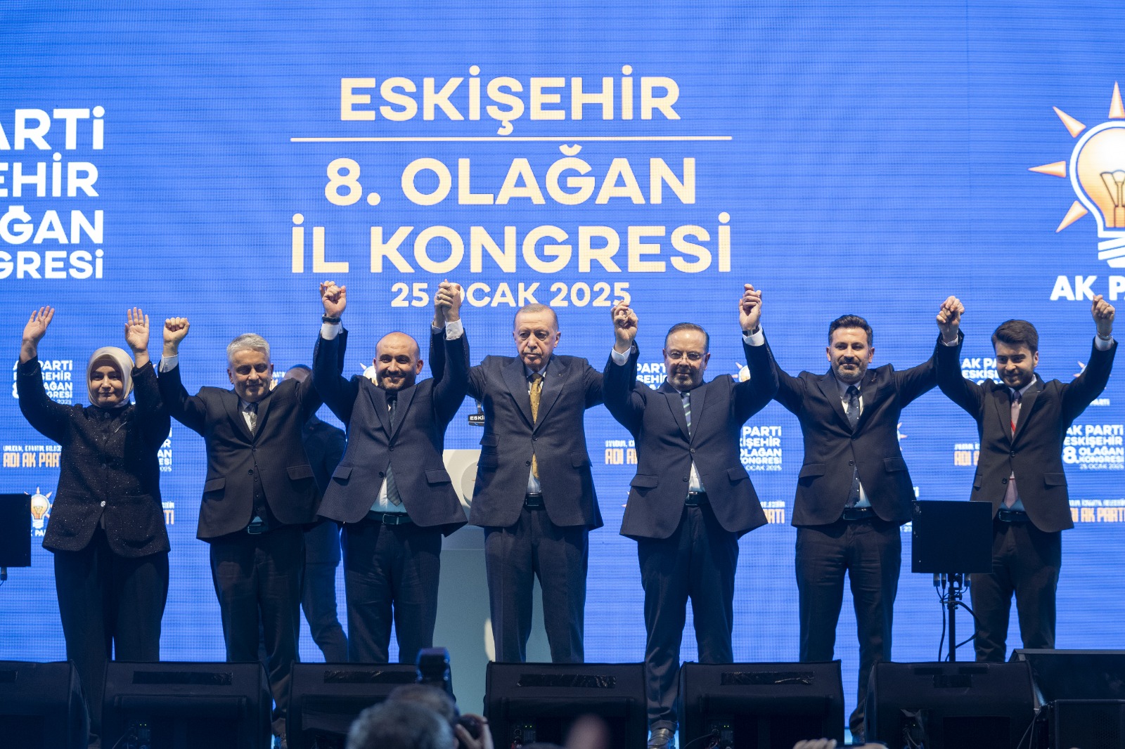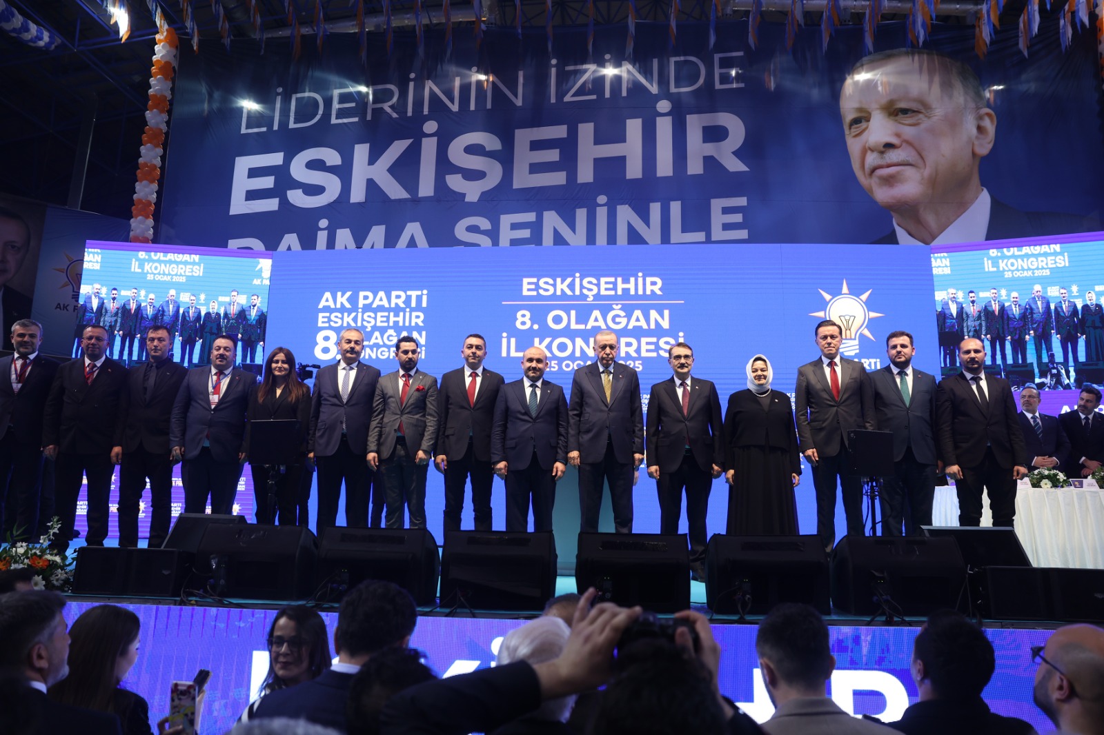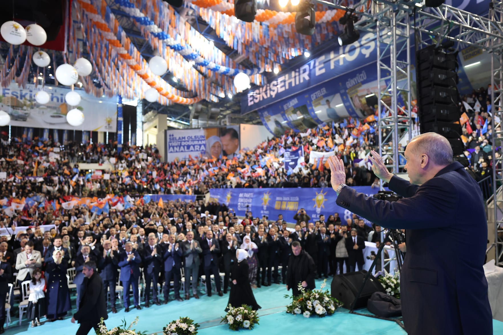 Türk bayrakları ve AK Parti flamalarıyla donatılan salona, üzerinde Cumhurbaşkanı Erdoğan'ın fotoğrafının yer aldığı "Allah'ın seçtiği kurtulmuş millet. Liderinin izinde, güneşten başını göklere yükselt." ve "Liderinin izinde, Eskişehir daima seninle" pankartları asıldı.