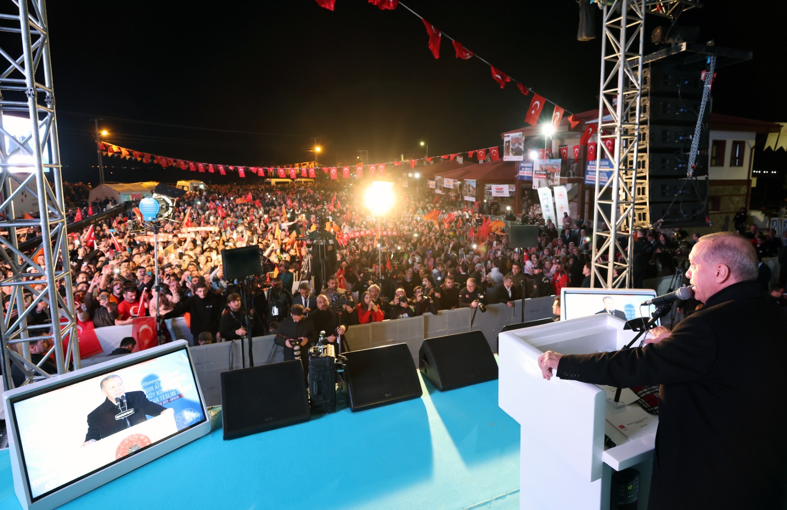 Törene katılanlar, Cumhurbaşkanı Erdoğan'ı telefonlarının ışıklarını yakarak, bayrak sallayarak, şarkılara eşlik ederek alkışlarla karşıladı.