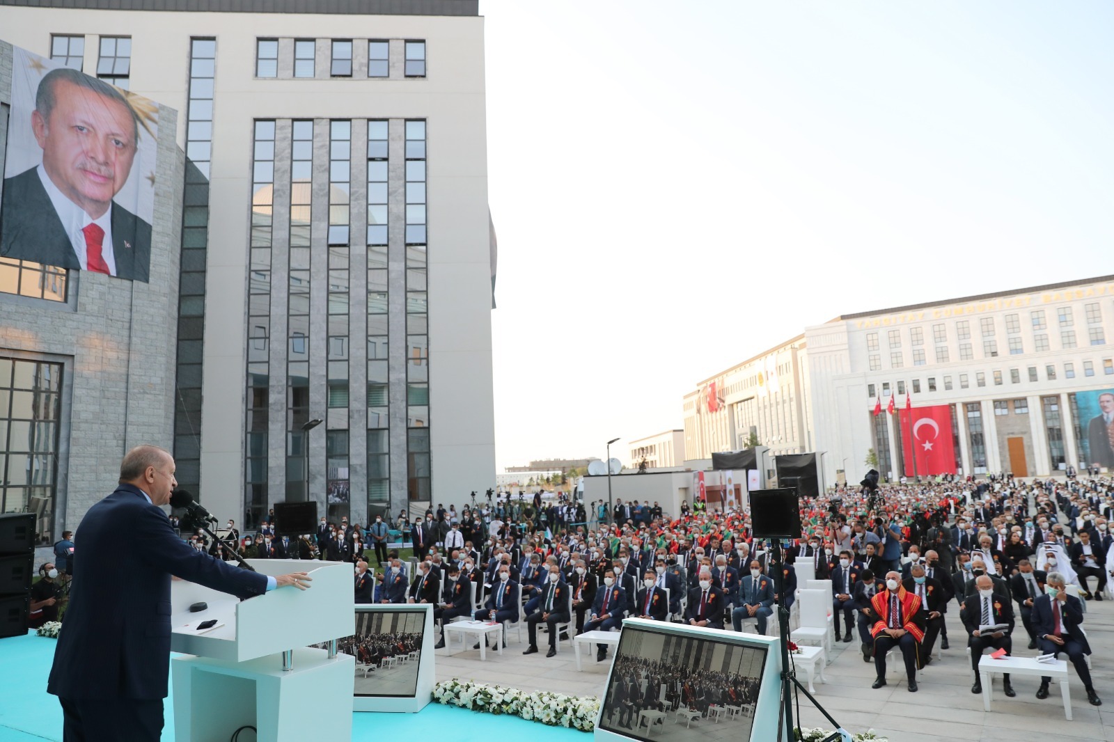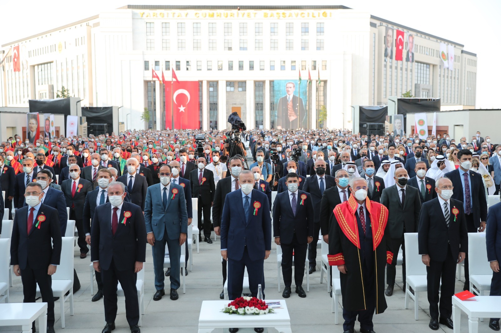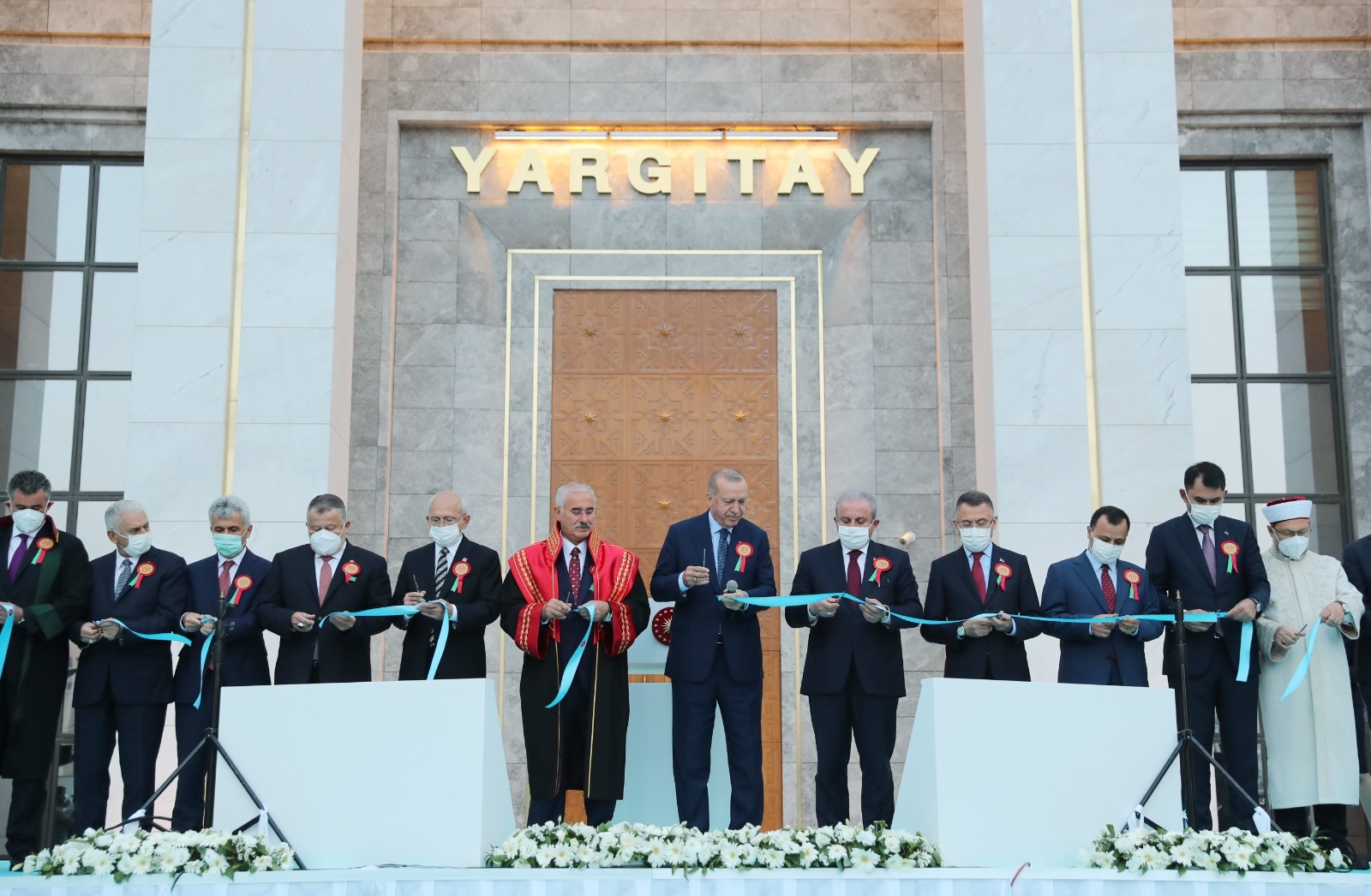 Diyanet İşleri Başkanı Ali Erbaş'ın yaptığı duanın ardından, Cumhurbaşkanı Erdoğan, TBMM Başkanı Mustafa Şentop, Cumhurbaşkanı Yardımcısı Fuat Oktay, Anayasa Mahkemesi Başkanı Zühtü Arslan, CHP Genel Başkanı Kemal Kılıçdaroğlu, Adalet Bakanı Abdulhamit Gül, Çevre ve Şehircilik Bakanı Murat Kurum, Milli Savunma Bakanı Hulusi Akar, Ulaştırma ve Altyapı Bakanı Adil Karaismailoğlu, Aile ve Sosyal Hizmetler Bakanı Derya Yanık, Sanayi ve Teknoloji Bakanı Mustafa Varank, Enerji ve Tabii Kaynaklar Bakanı Fatih Dönmez, Yargıtay Başkanı Mehmet Akarca, Danıştay Başkanı Zerrin Güngör, AK Parti Genel Başkanvekili Binali Yıldırım, BBP Genel Başkanı Mustafa Destici ile binanın açılış kurdelesini kesti.
