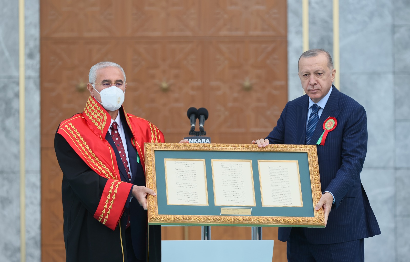 Cumhurbaşkanı Erdoğan'a, günün anısına Yargıtay Birinci Başkanı Mehmet Akarca tarafından "Yargıtay'ın 1 Nisan 1868 tarihli ilk kuruluş belgesi"nin yer aldığı tablo takdim edildi.