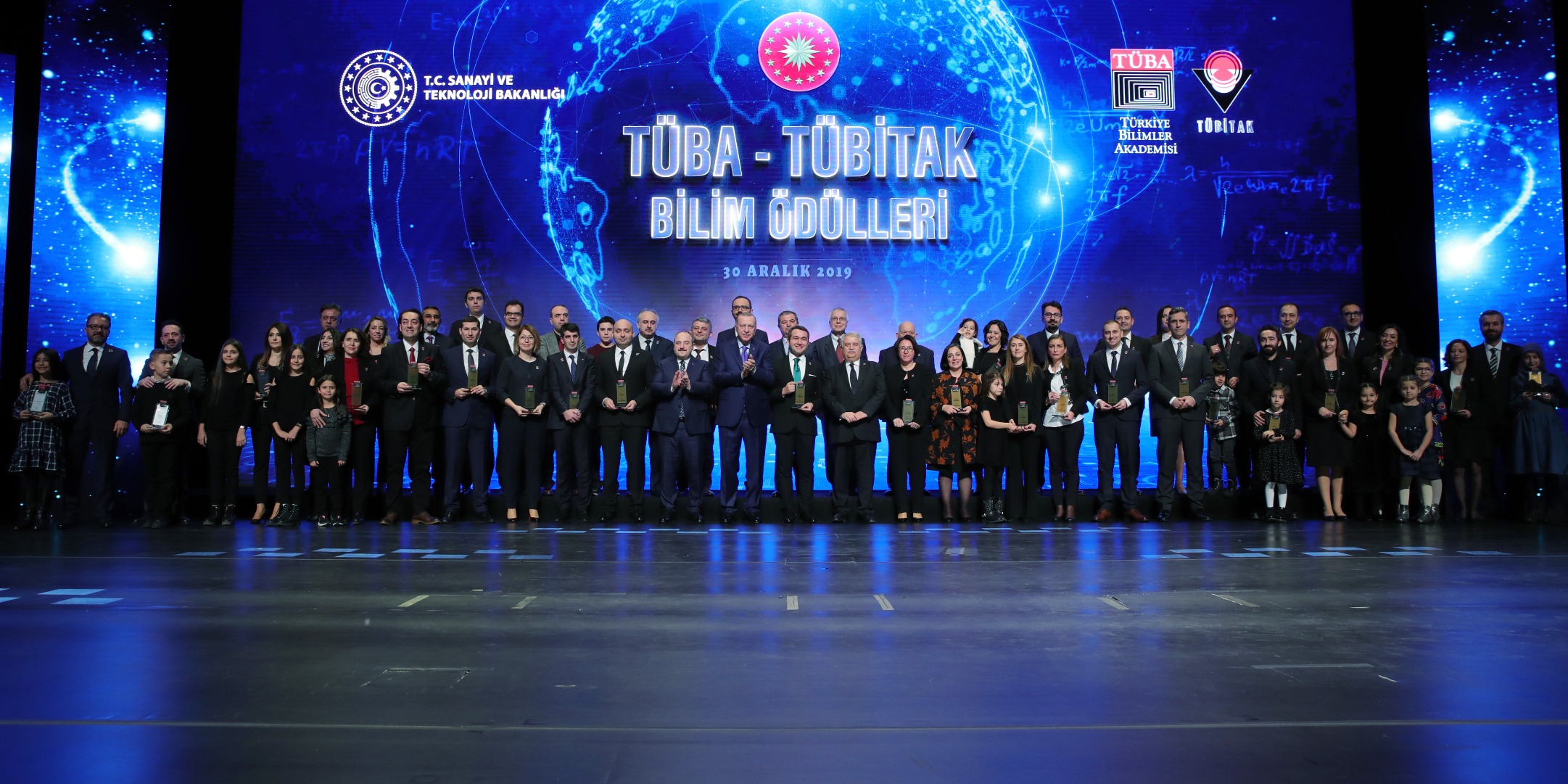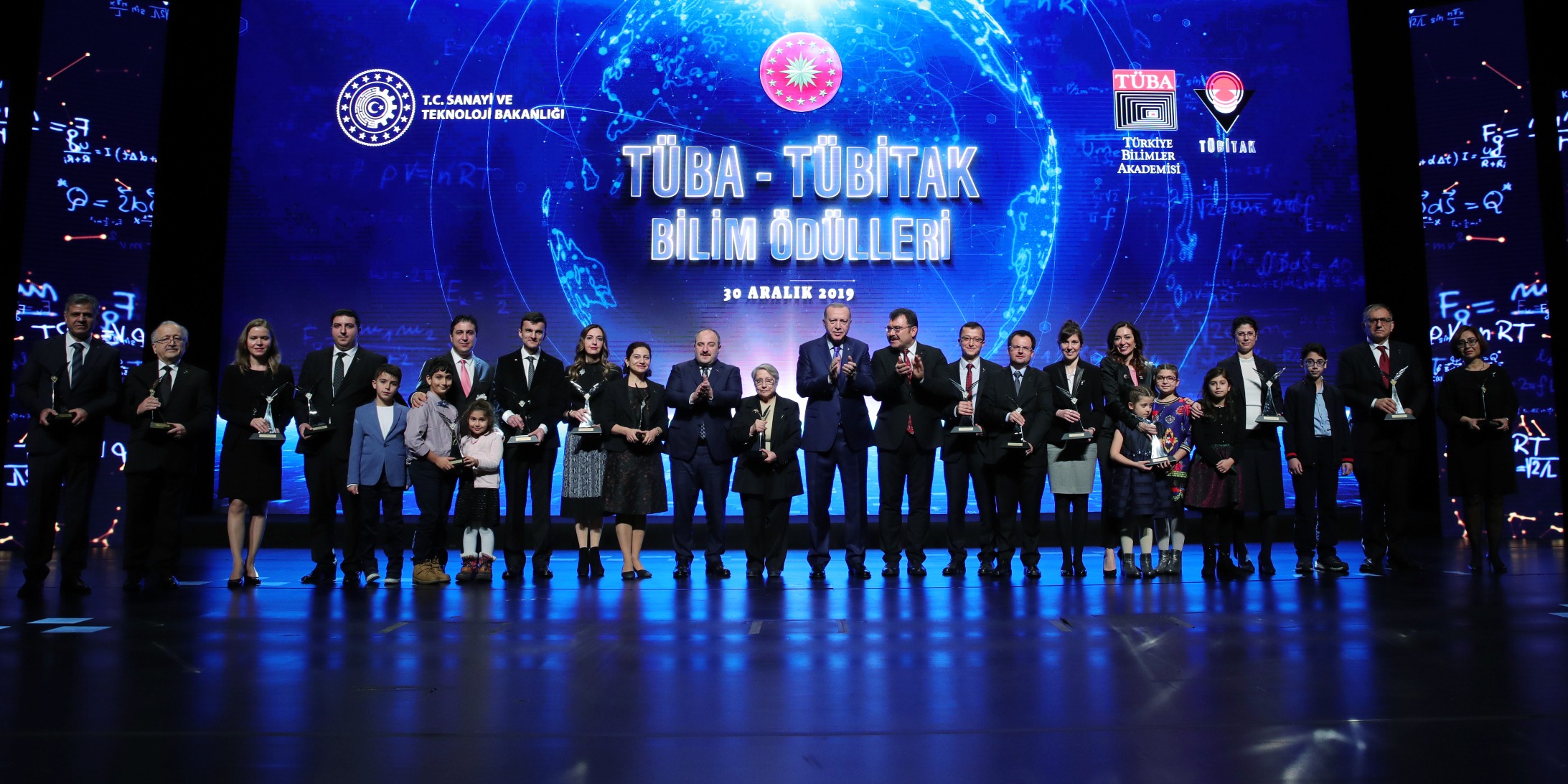 Cumhurbaşkanı Erdoğan, daha sonra ödül almaya hak kazanan bilim insanlarına ödüllerini verdi ve onlarla hatıra fotoğrafı çektirdi.