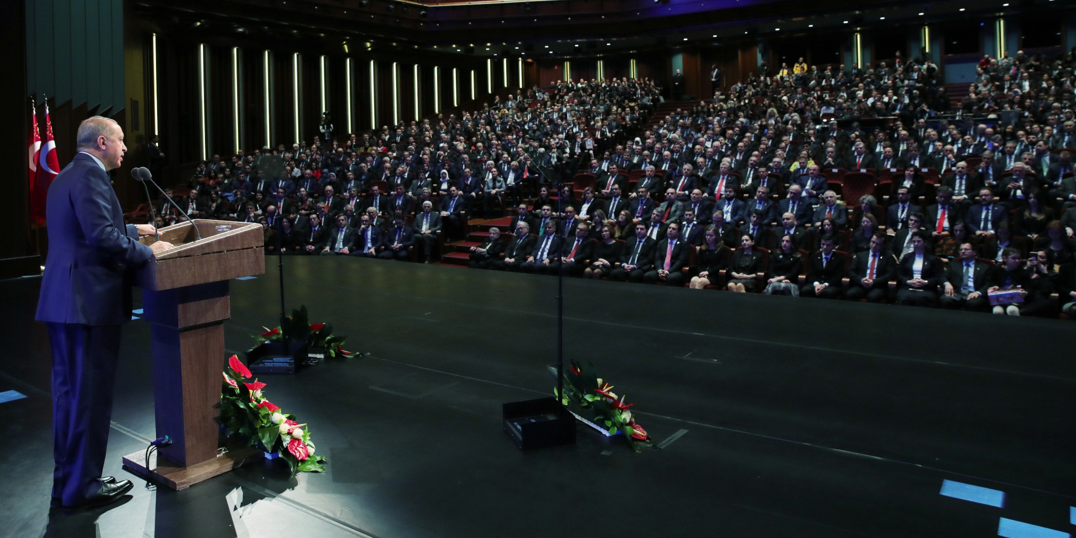 Konuşmasına tüm katılımcıları selamlayarak başlayan Cumhurbaşkanı Erdoğan, "Cumhurbaşkanlığı Külliyesi'ne, milletin evine özellikle teşrifleriniz için her birinize şahsım, milletim adına teşekkürlerimi sunuyorum." ifadesini kullandı.