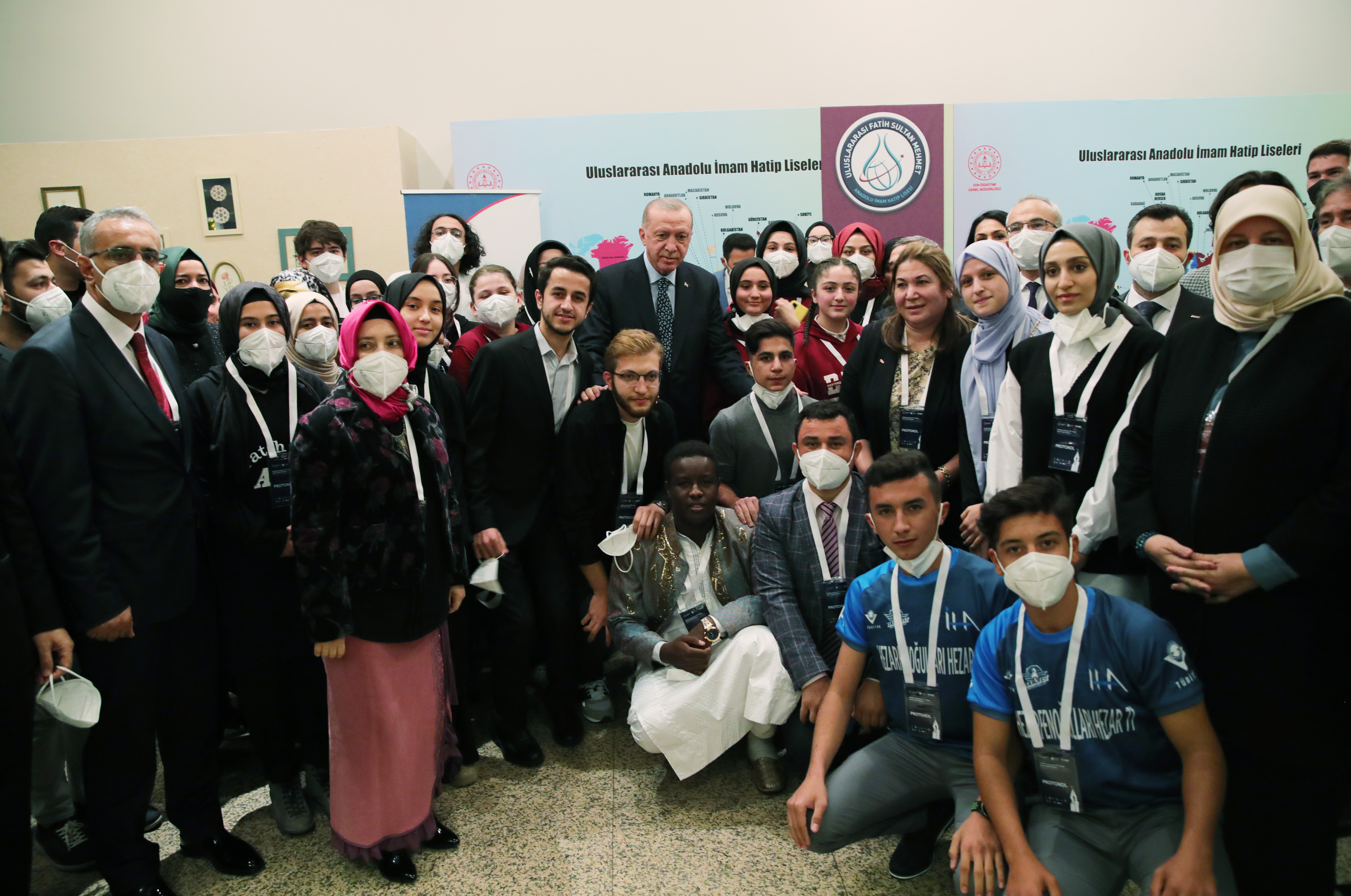 Dünyanın 89'u aşkın ülkesinden orta okul ve lise çağındaki 1200 uluslararası öğrencinin Türkiye'deki imam hatip okullarında eğitim gördüğünü aktaran Cumhurbaşkanı Erdoğan, din istismarından beslenen FETÖ, DEAŞ, Eş Şebab, Boko Haram gibi terör örgütlerine karşı mücadelede imam hatiplerin rolü anlaşıldıkça bu sayının hem Türkiye'de hem dünyada daha da artacağını ifade etti.