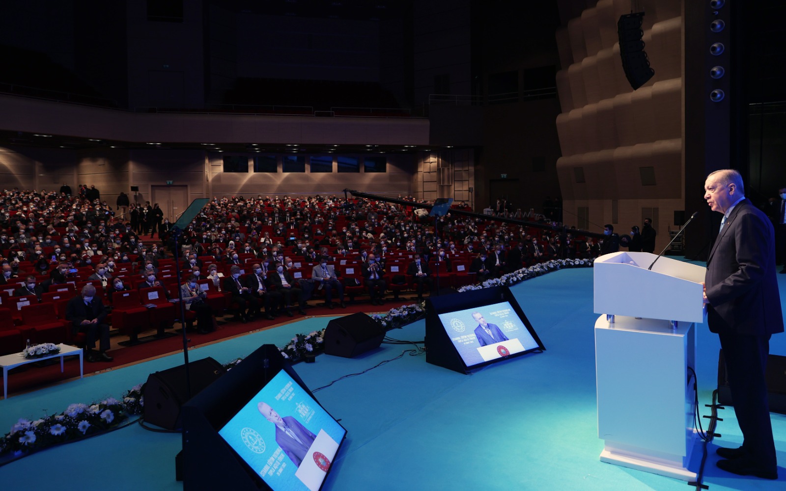 Cumhurbaşkanı Erdoğan, son dönemde gerçekleştirdikleri öğretmen atamalarında önceliği ve ağırlığı İstanbul'a verdiklerini söyledi. 31 Ocak 2022 tarihinde ataması yapılan 15 bin öğretmenin yarısının İstanbul'da göreve başladığını belirten Cumhurbaşkanı Erdoğan, öğretmen sayısındaki bu iyileşmenin sınıf mevcutlarına da olumlu yansıdığını aktardı. 2002'de ilköğretimde öğretmen başına düşen öğrenci sayısı 40 iken bugün bu sayının 21'e indiğini ifade eden Cumhurbaşkanı Erdoğan, şöyle konuştu: