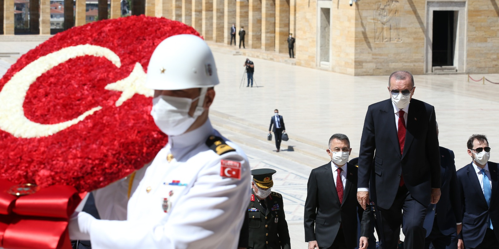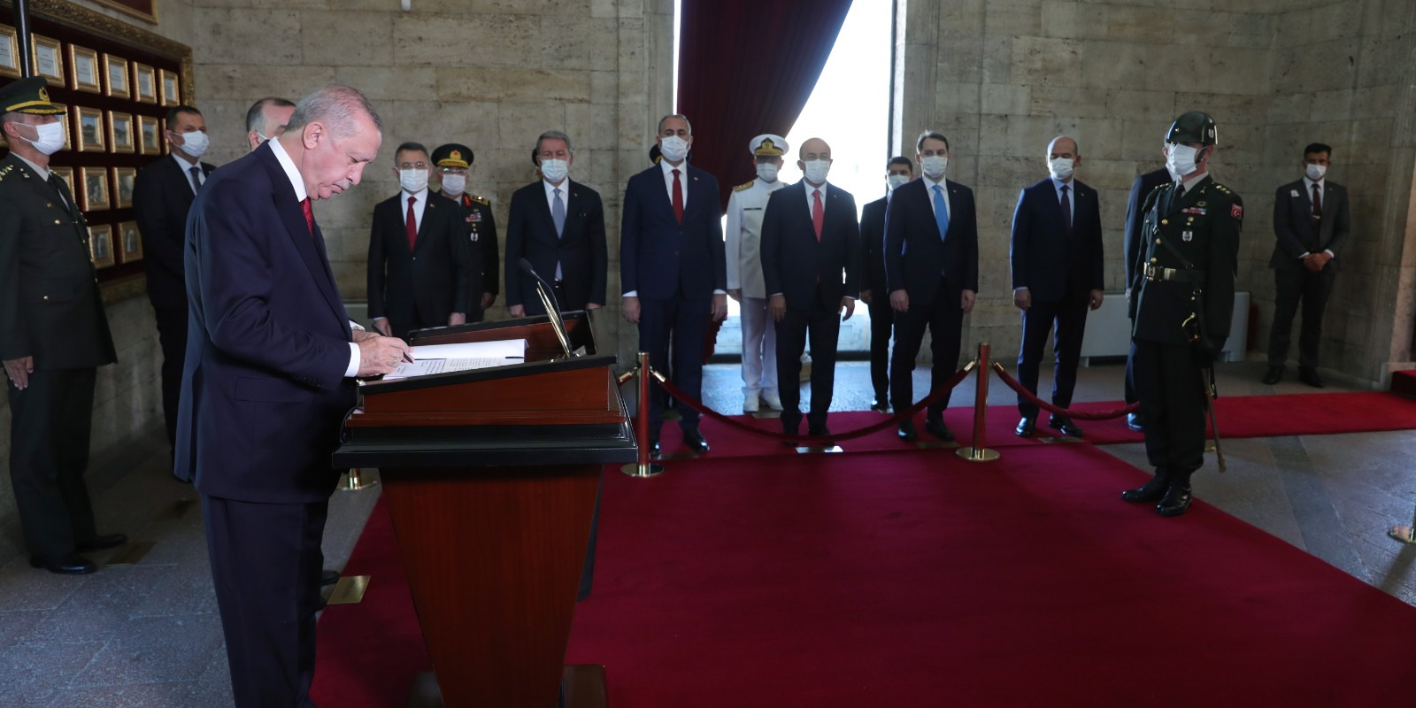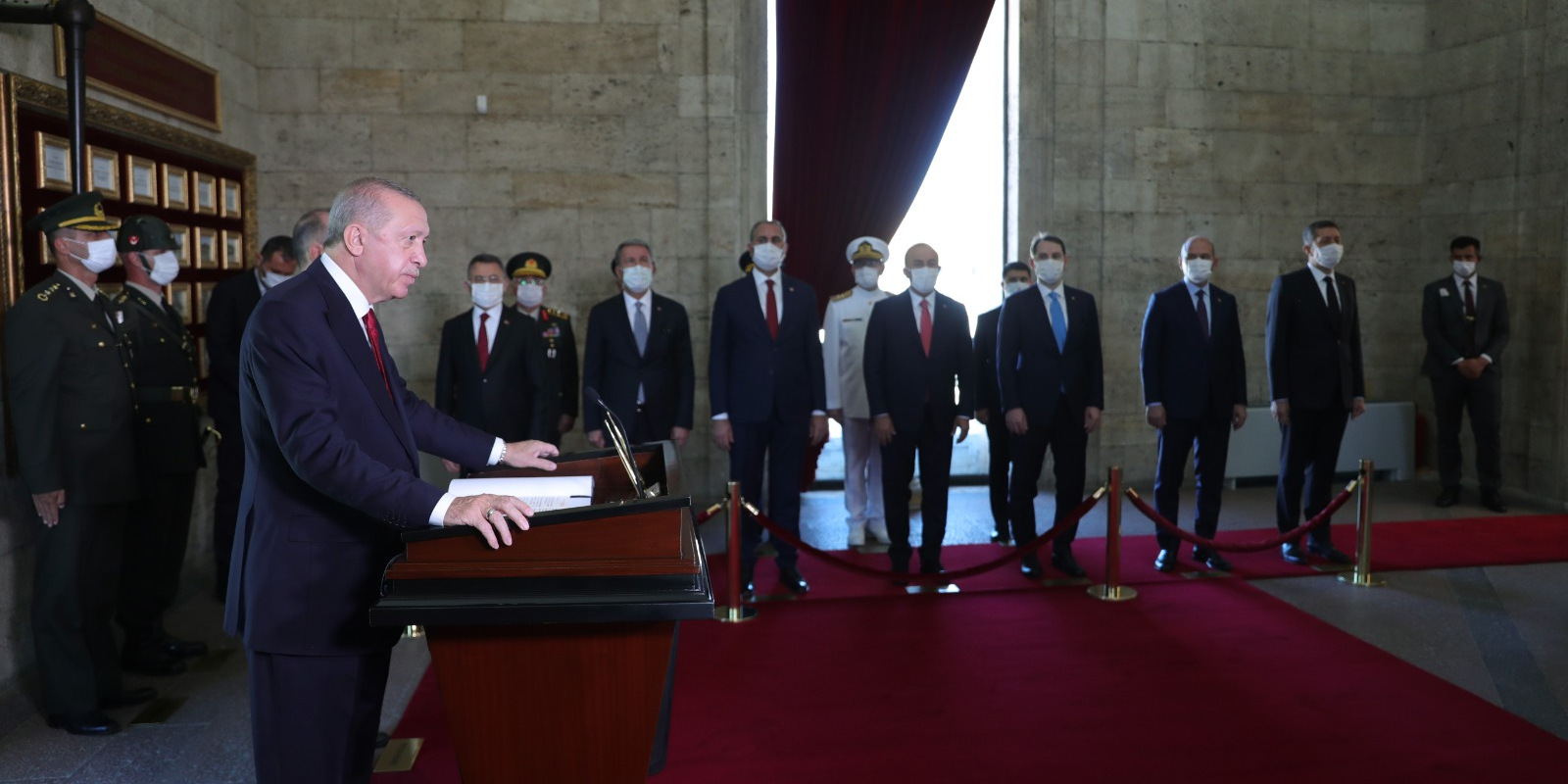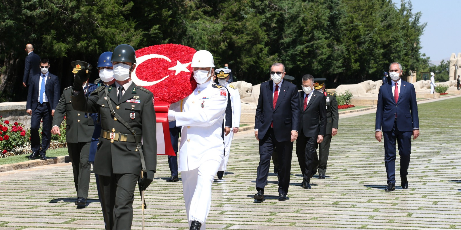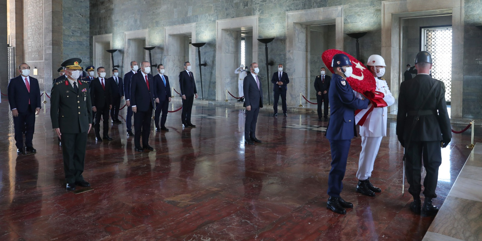 Cumhurbaşkanı Erdoğan'ın, ay yıldız motifli çelengi Türkiye Cumhuriyeti'nin kurucusu Gazi Mustafa Kemal Atatürk'ün mozolesine bırakmasının ardından, saygı duruşunda bulunuldu ve İstiklal Marşı okundu.
