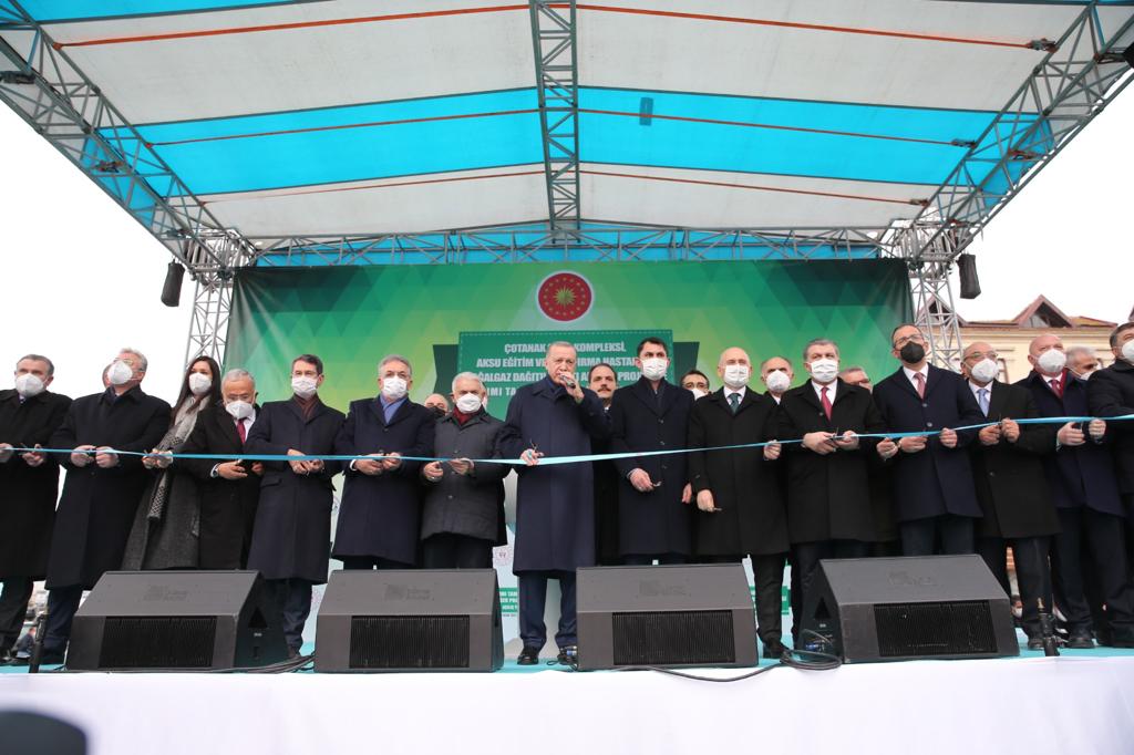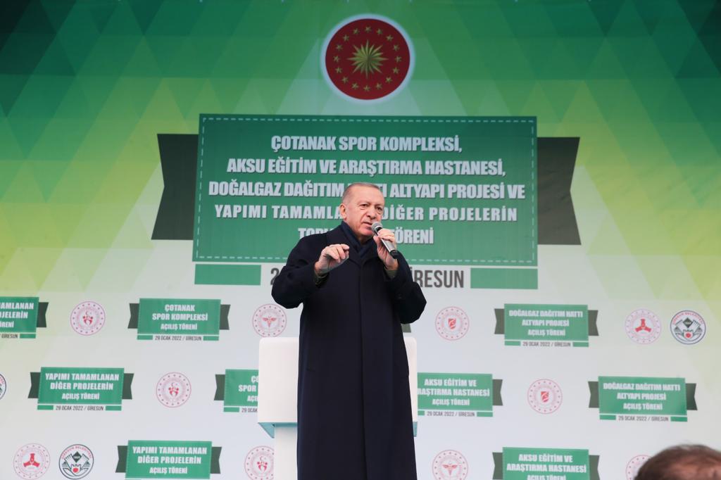 Cumhurbaşkanı Erdoğan, Giresun Belediyesi önünde düzenlenen Çotanak Spor Kompleksi, Aksu Eğitim ve Araştırma Hastanesi, Doğalgaz Dağıtım Hattı Altyapı Projesi ve Yapımı Tamamlanan Diğer Projelerin Toplu Açılış Töreni'nde vatandaşlara hitap etti. Konuşmasına, Giresunlulara AK Parti'yi yüzde 49 oyla birinci çıkararak, belediyedeki hizmet bayrağını tekrar kendilerine verdikleri için şükranlarını sunan Cumhurbaşkanı Erdoğan, bu güvene layık olabilmek için merkezi, ilçeleri, köyleriyle Giresun'un tamamında tüm imkânlarıyla çalıştıklarını ve çalışacaklarını söyledi. Cumhurbaşkanı Erdoğan, 2020 Ağustos ayında meydana gelen sel felaketinde Dereli ilçesinin de aralarında bulunduğu 7 ilçede can ve mal kayıpları yaşandığını, en çok hasarın da Dereli'de olduğunu anımsattı.
